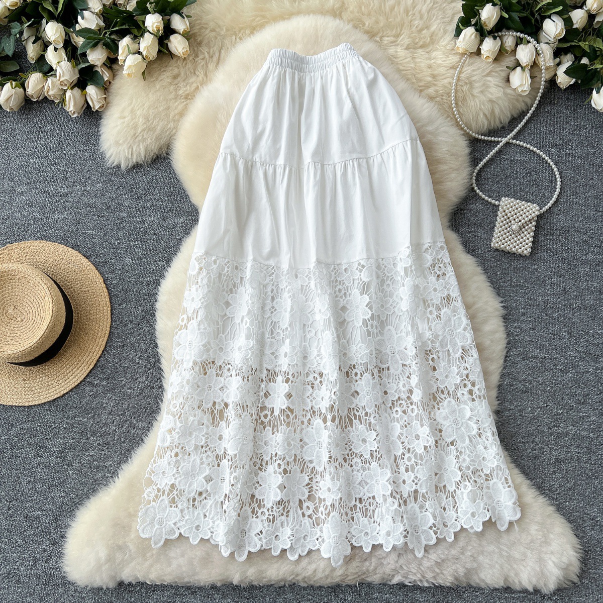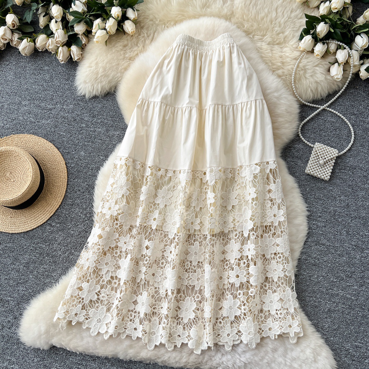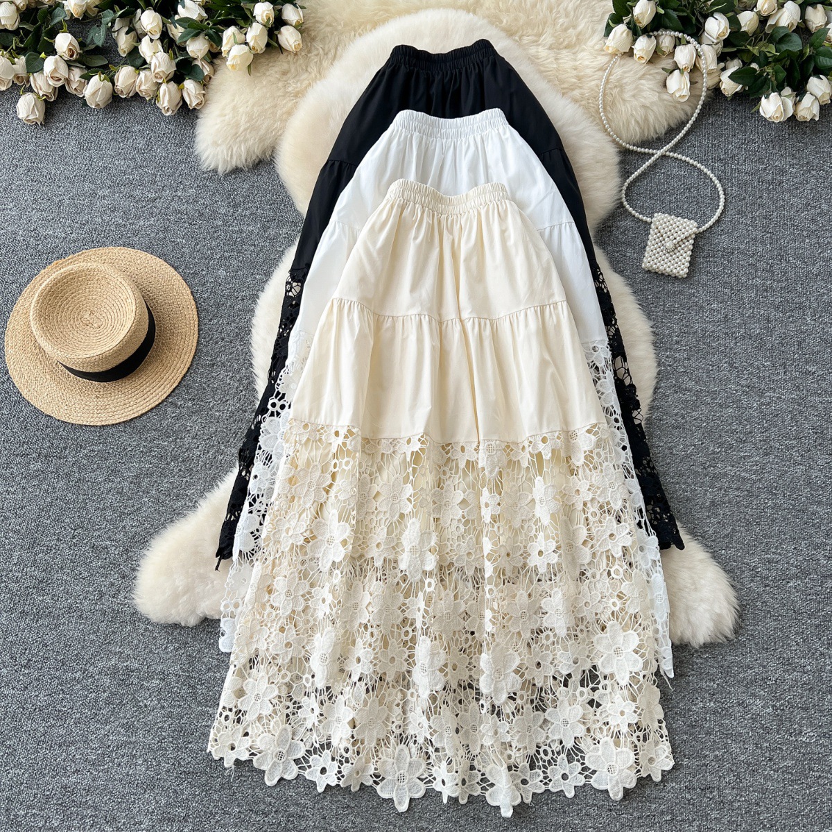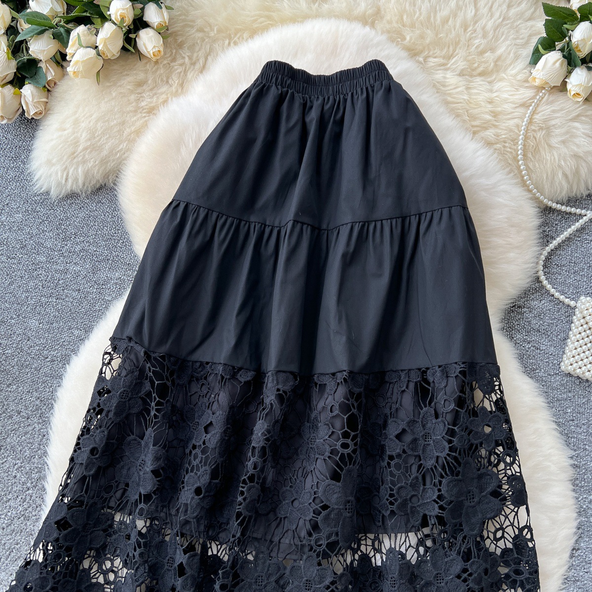 기질 달콤한 치마 여성의 봄 2025 부드러운 높은 허리 슬리밍 할로우 레이스 바느질 A 자형 중간 길이 스커트