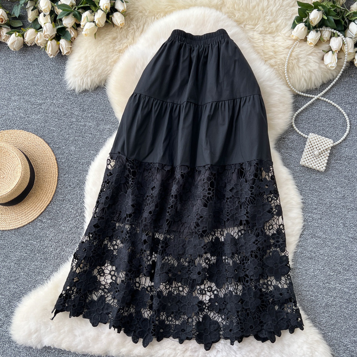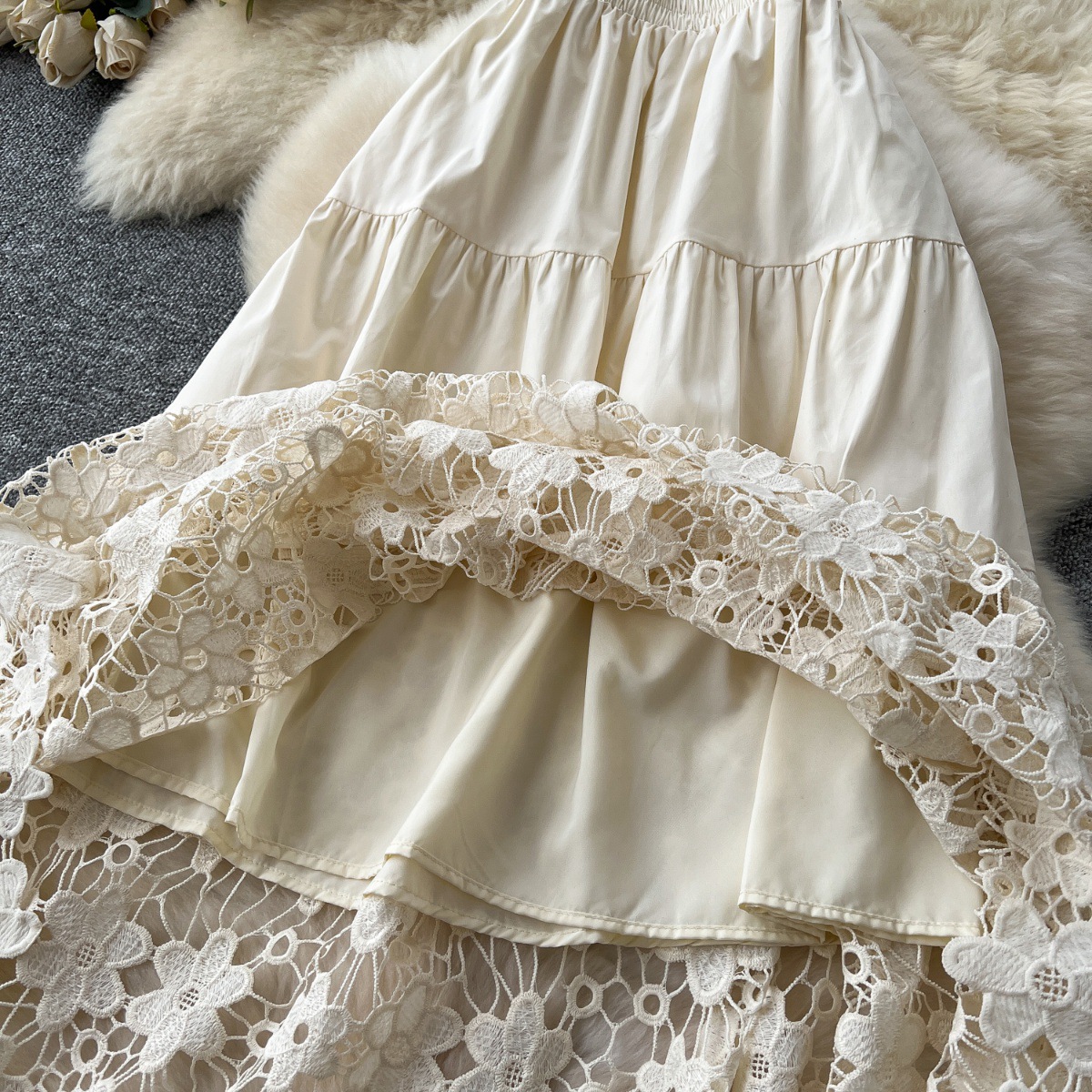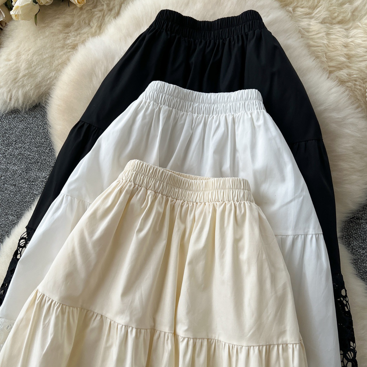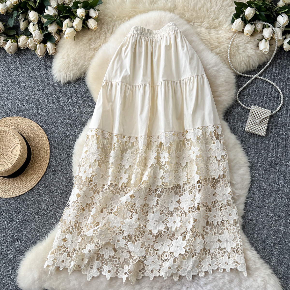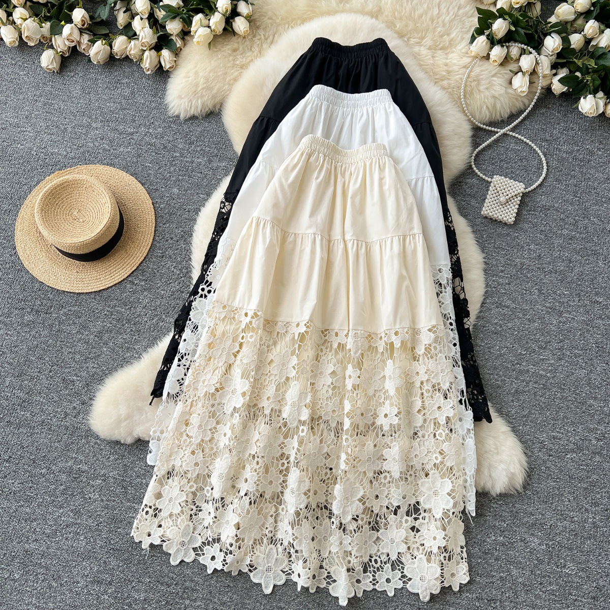 기질 달콤한 치마 여성의 봄 2025 부드러운 높은 허리 슬리밍 할로우 레이스 바느질 A 자형 중간 길이 스커트