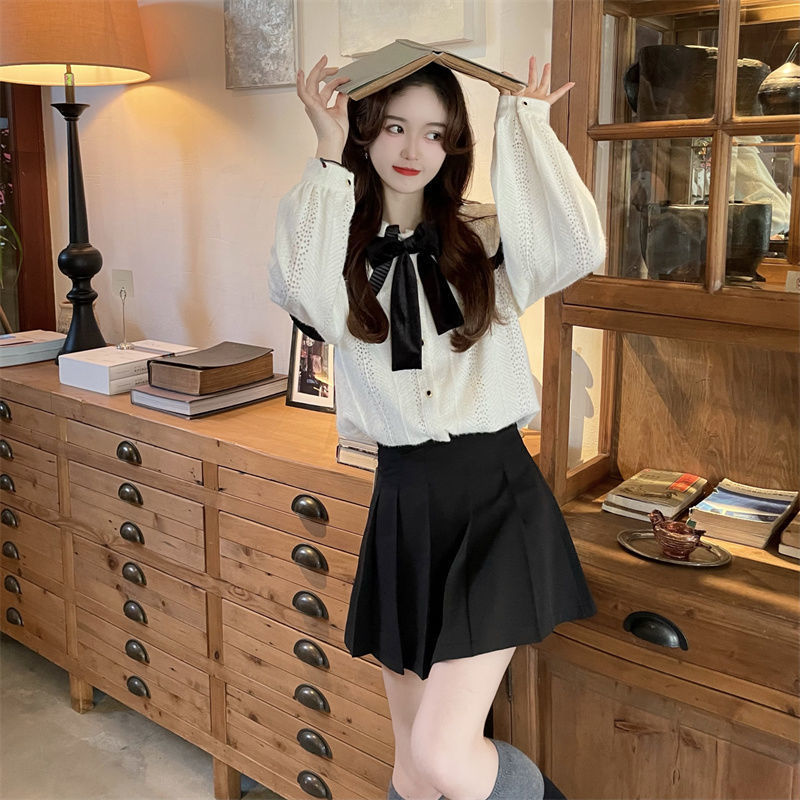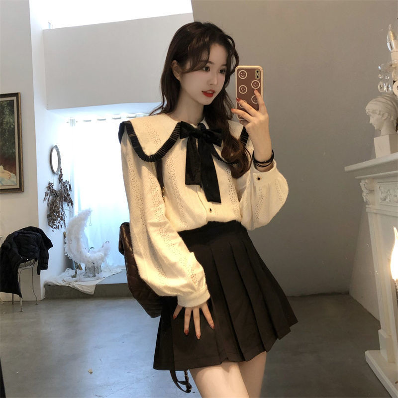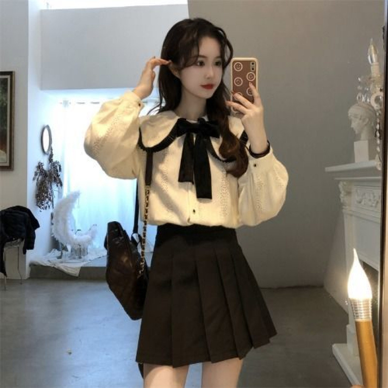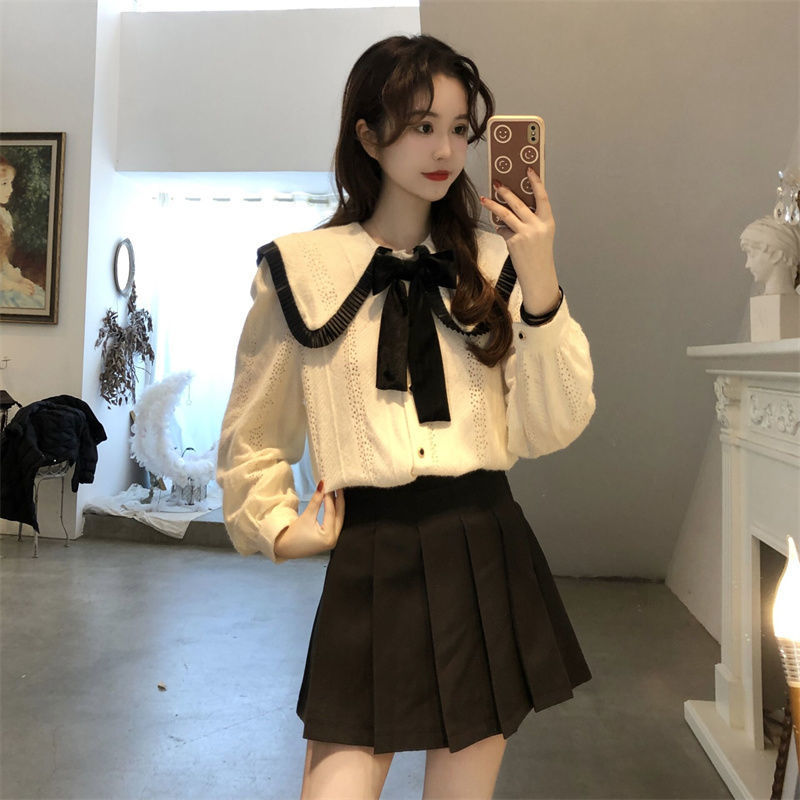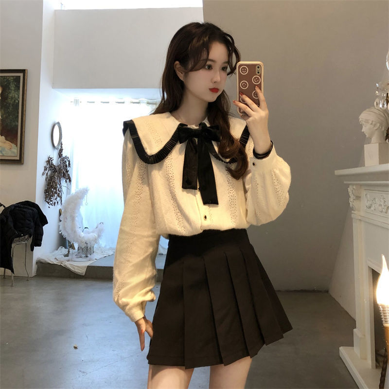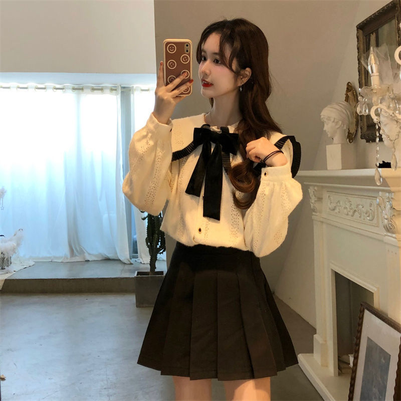 주름 치마 세트 여성 봄과 가을 투피스 원피스 인형 칼라 니트 셔츠 아카데미 스타일