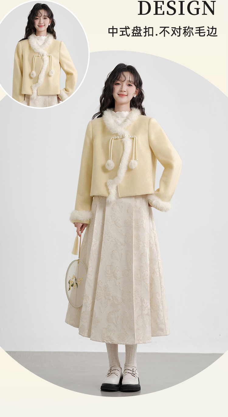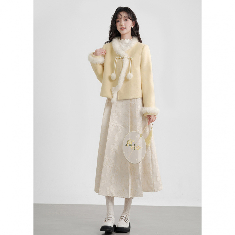 새로운 중국 진주 버클 세트 여성의 겨울 새로운 우아한 우유 노란색 양모 짧은 코트/오버 스커트 투피스 세트스토어 가기