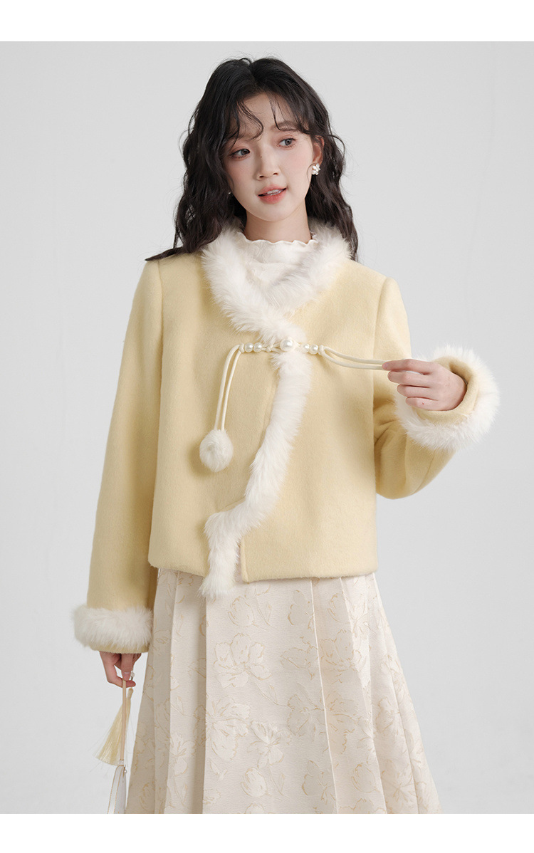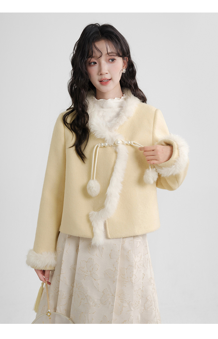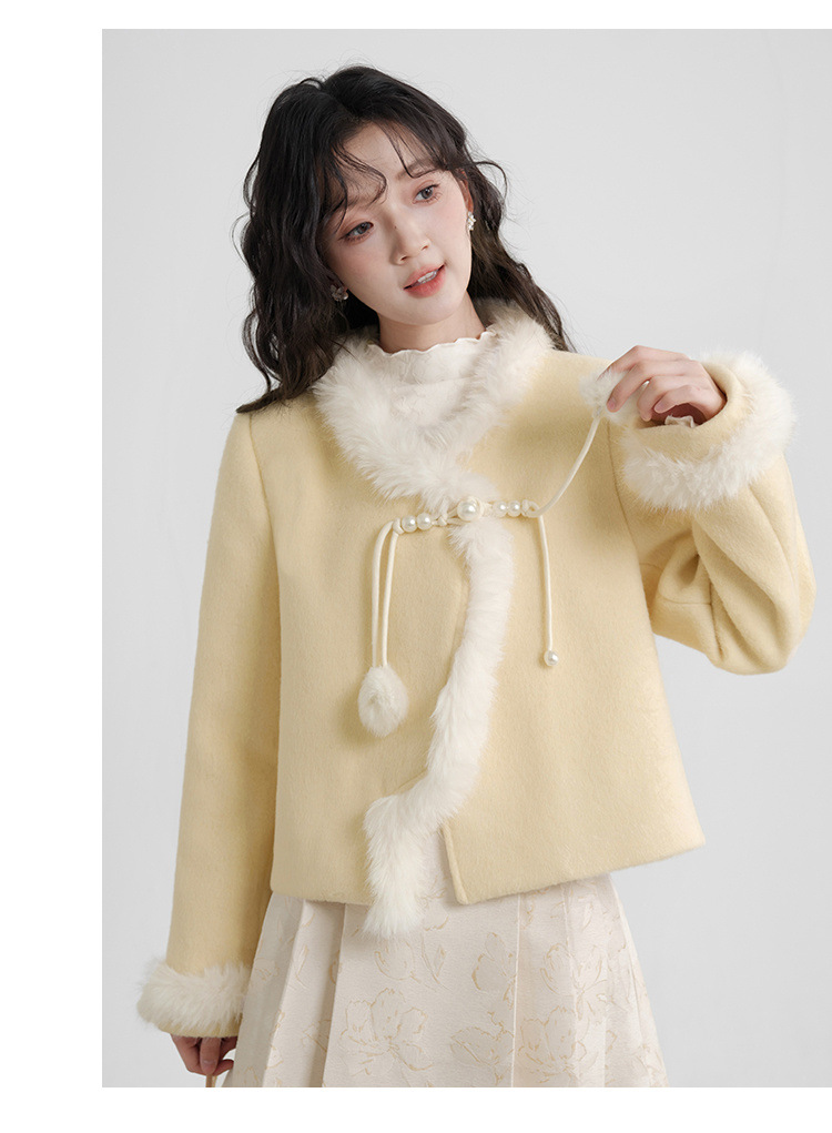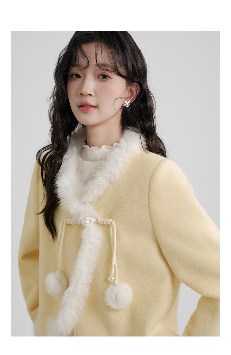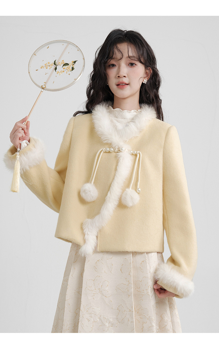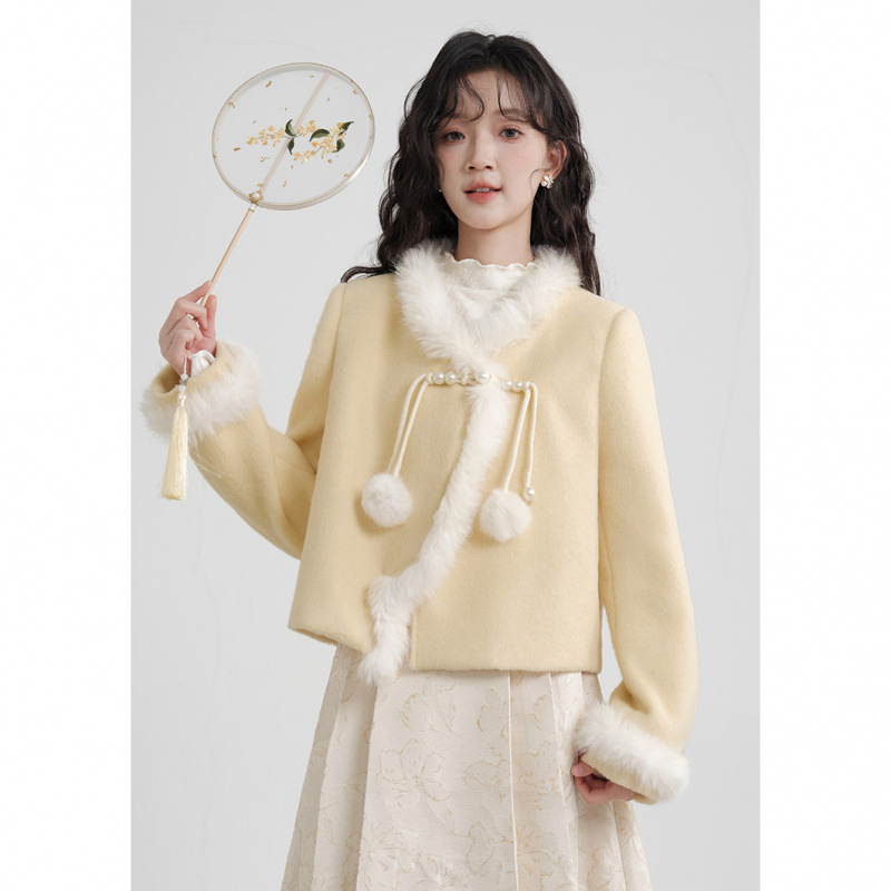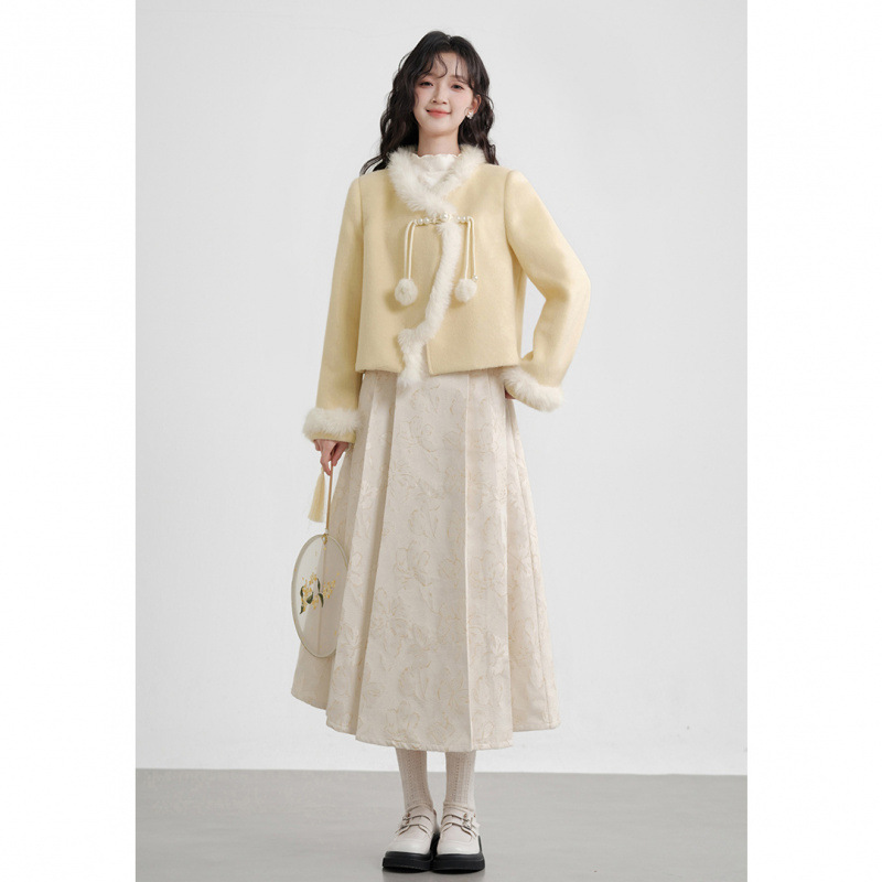 새로운 중국 진주 버클 세트 여성의 겨울 새로운 우아한 우유 노란색 양모 짧은 코트/오버 스커트 투피스 세트