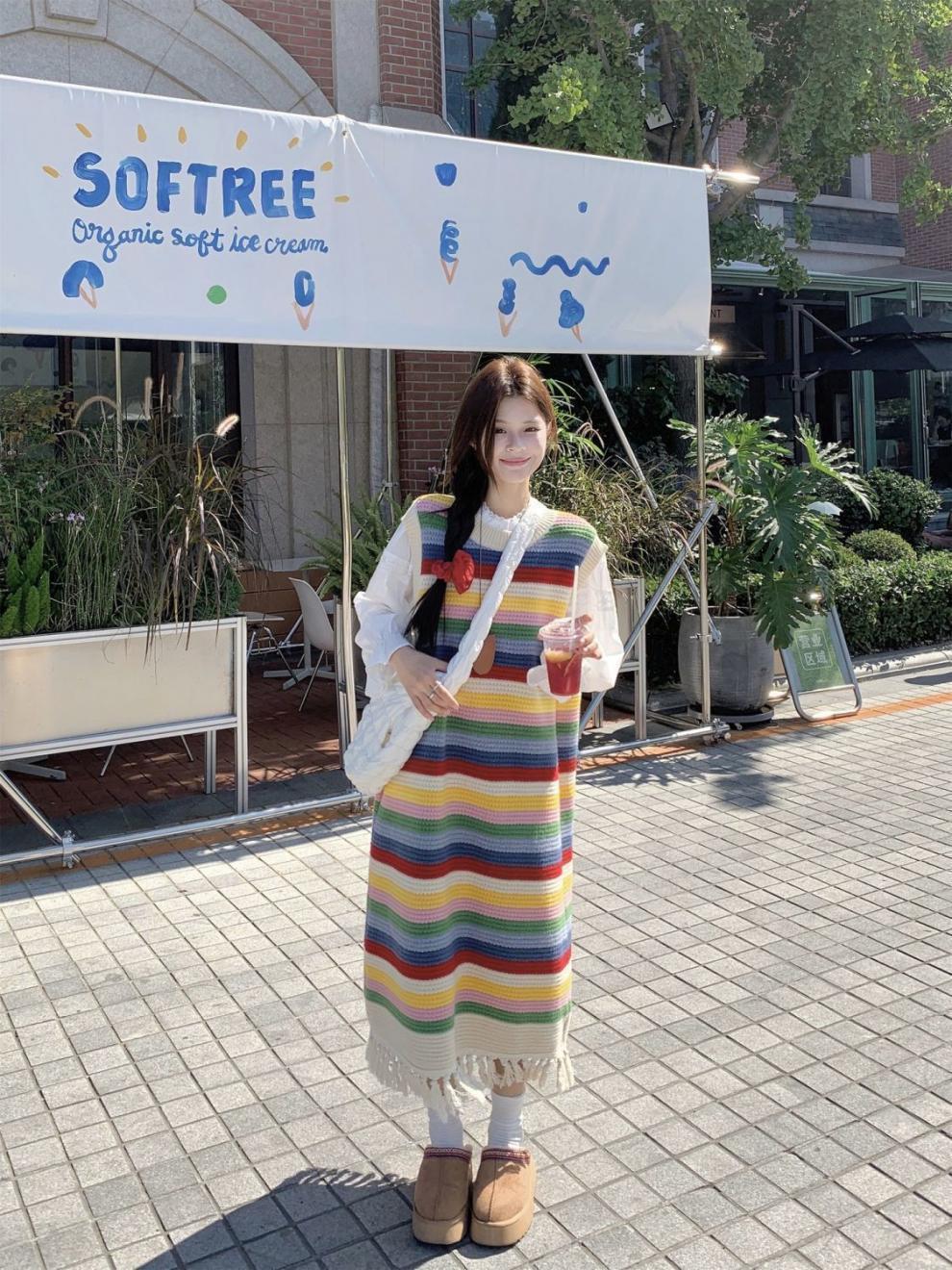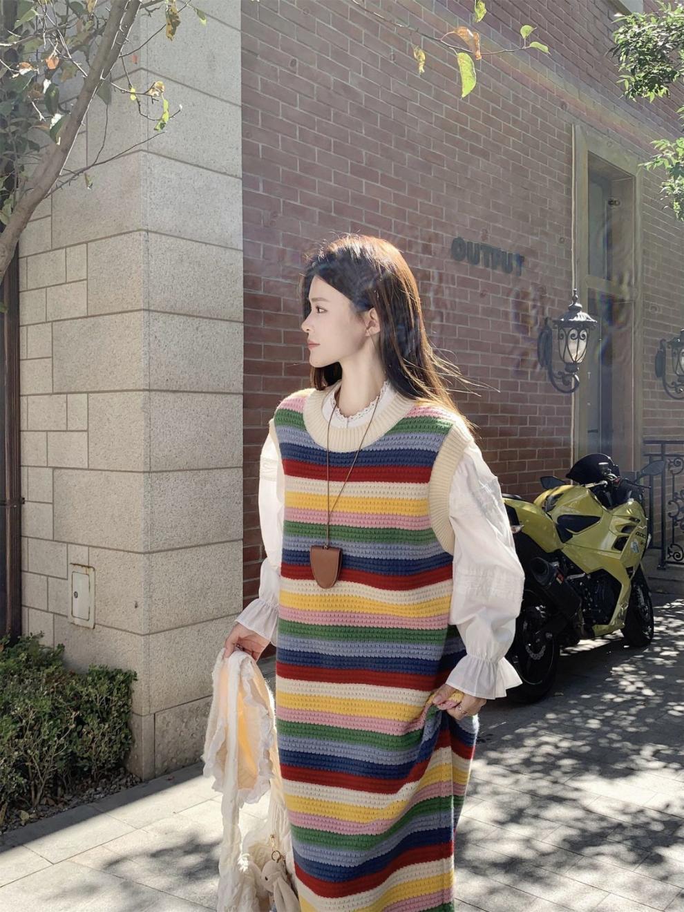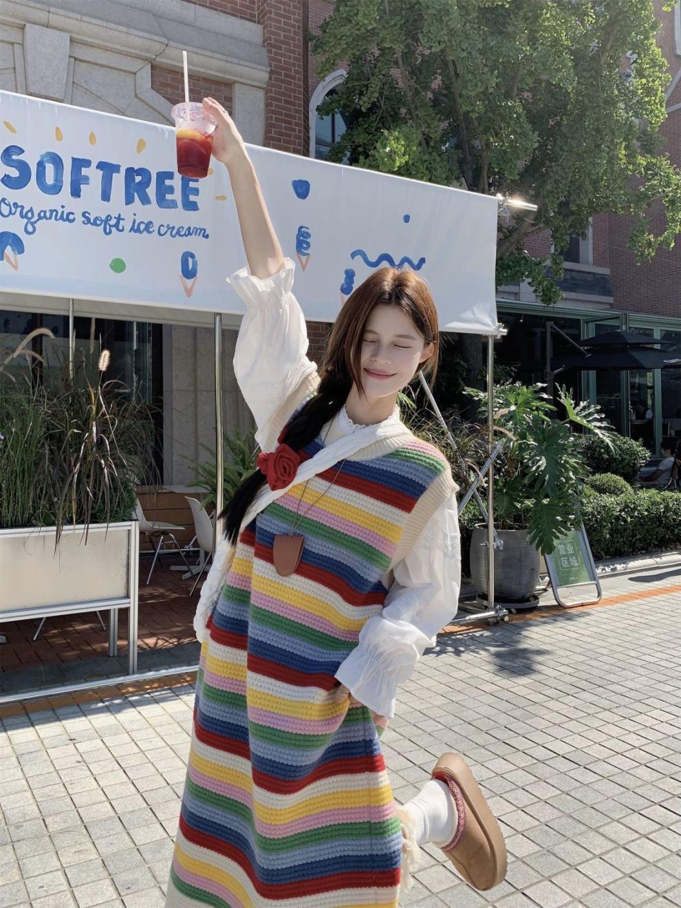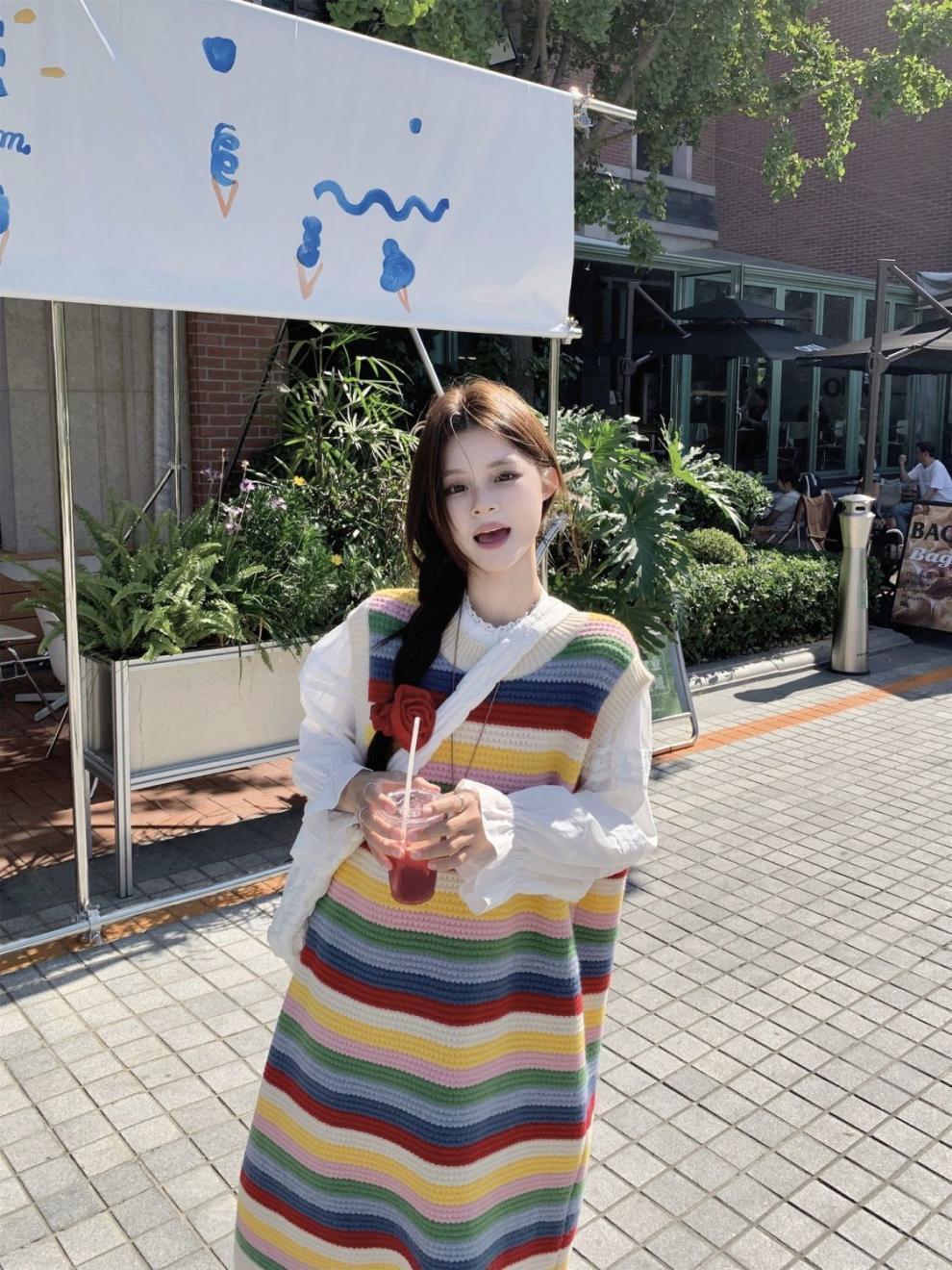 달콤한 레인보우 스트라이프 니트 조끼 원피스 봄 2025 여성용 긴 소매 화이트 셔츠 2 피스 세트스토어 가기