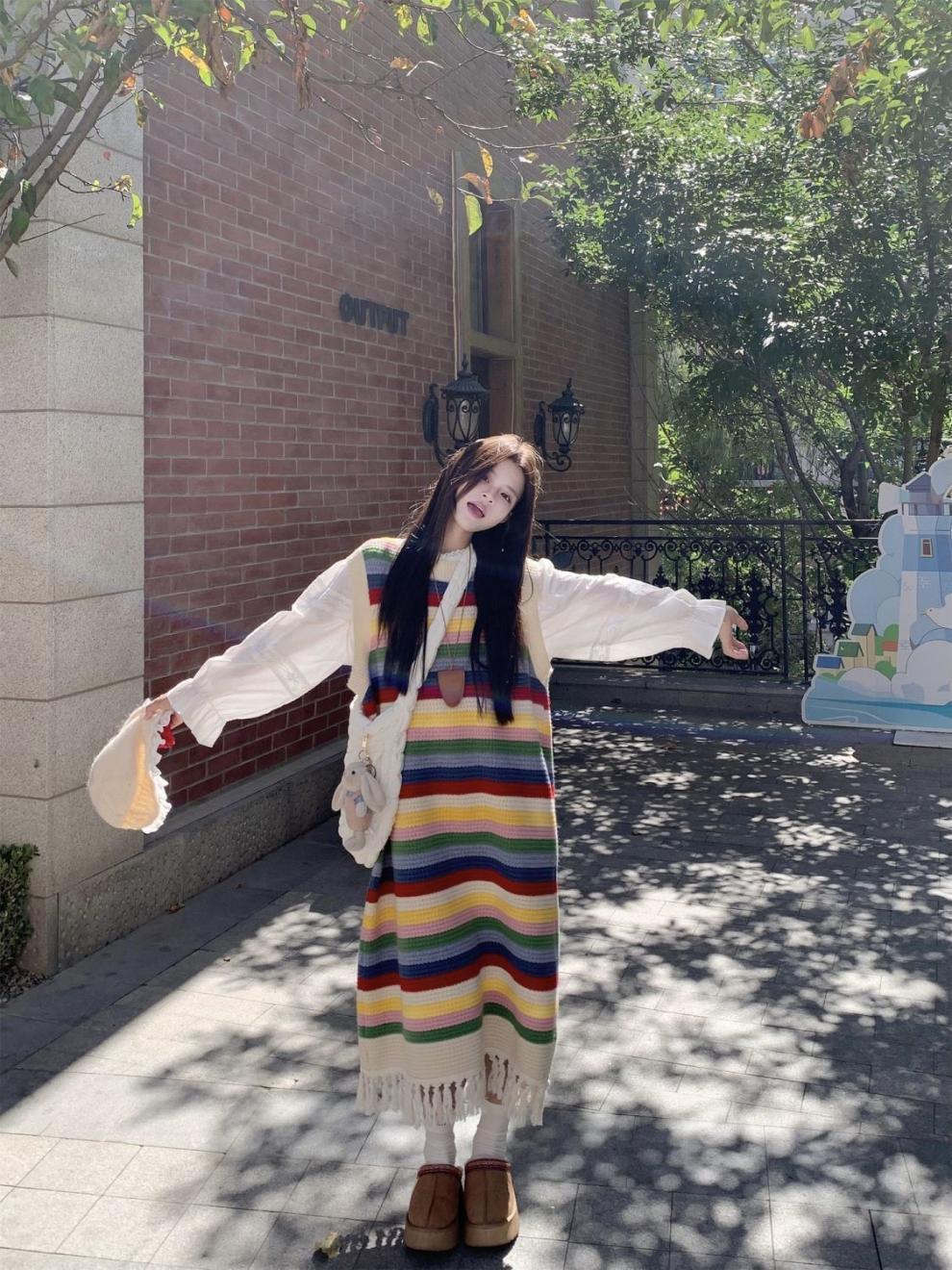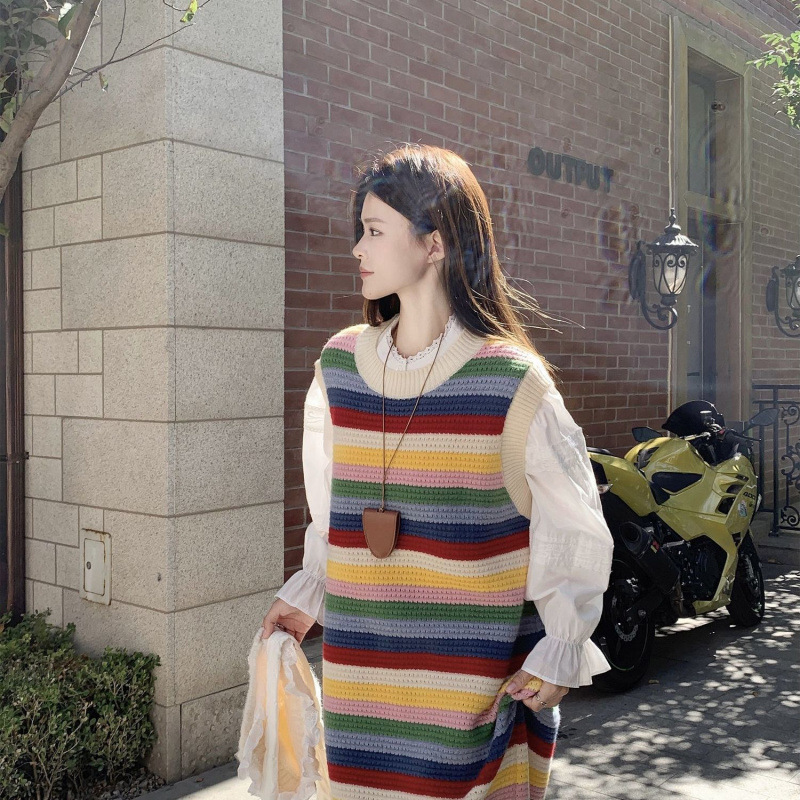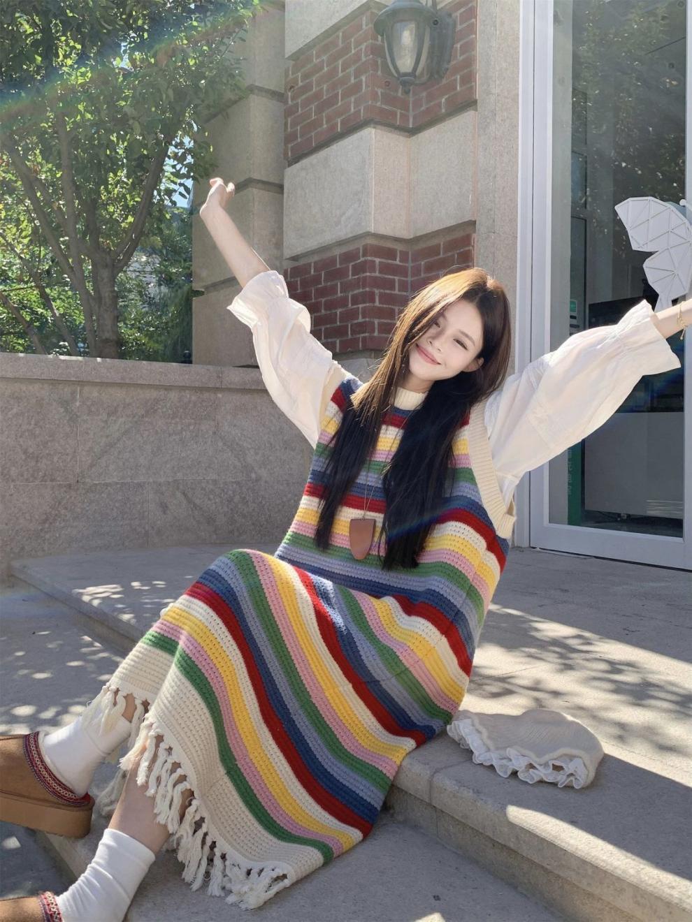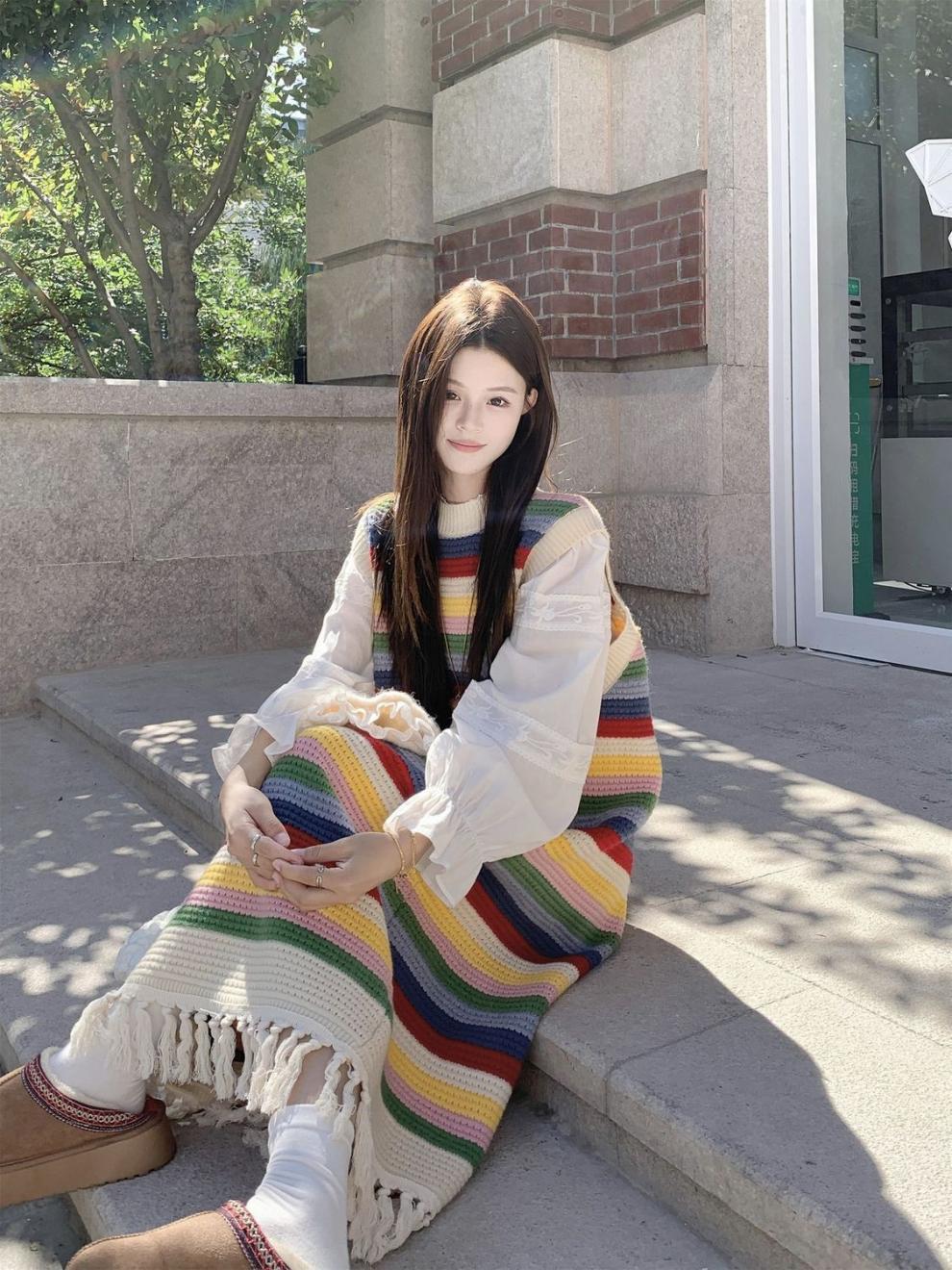 달콤한 레인보우 스트라이프 니트 조끼 원피스 봄 2025 여성용 긴 소매 화이트 셔츠 2 피스 세트스토어 가기