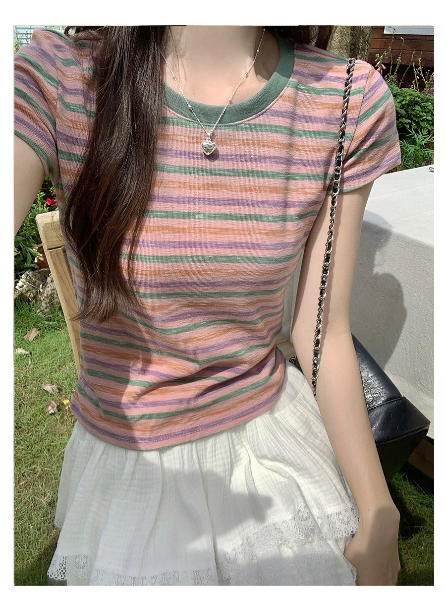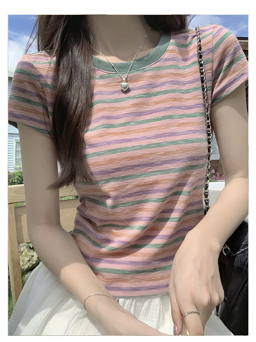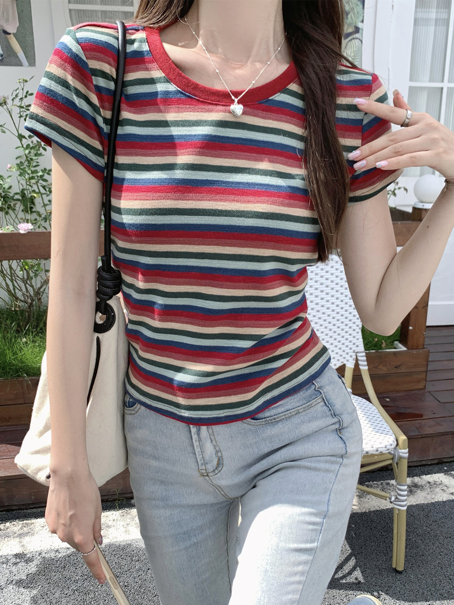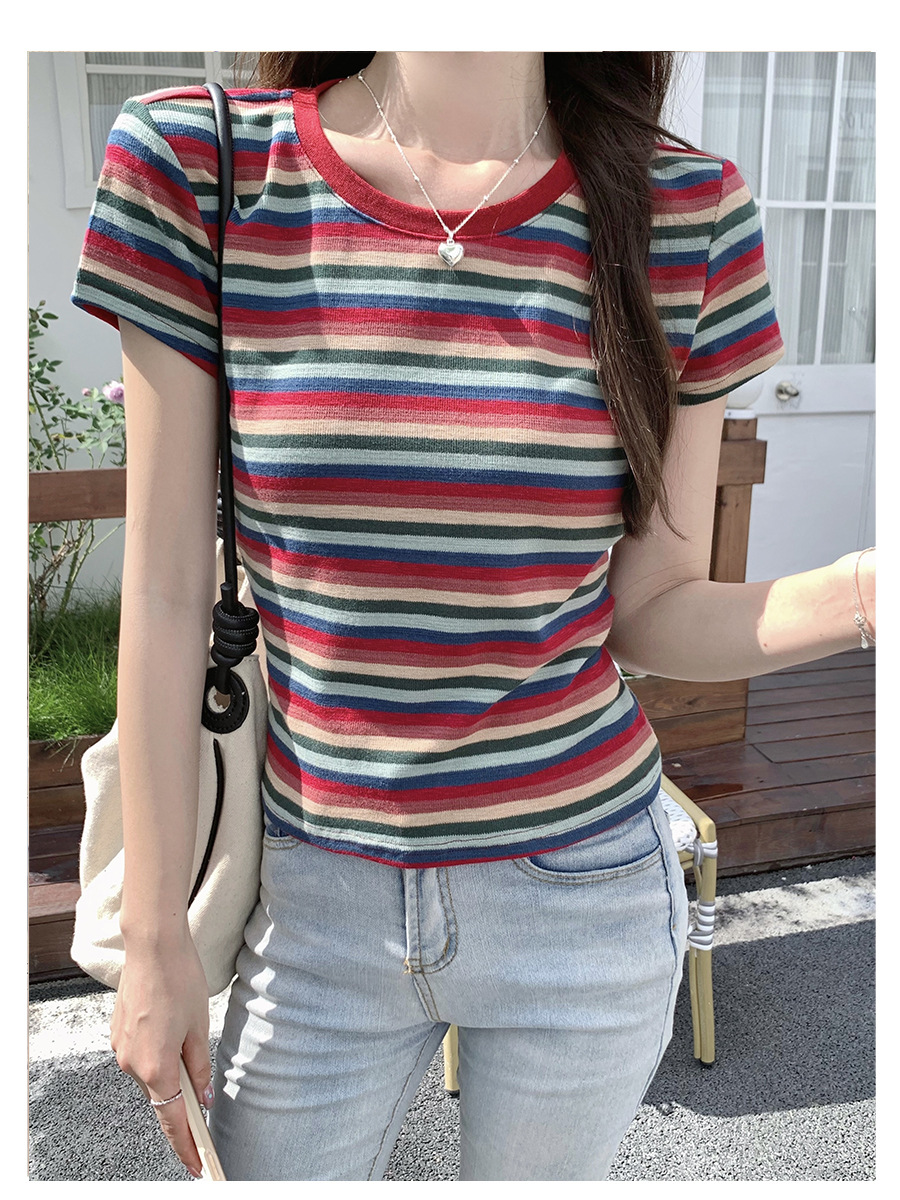 여름 여성을 위한 핫 스타일 레인보우 스트라이프 오른쪽 어깨 반팔 티셔츠 새로운 대비 색상 라운드 넥 작은 사람들을 위한 다용도 bm 스타일 탑