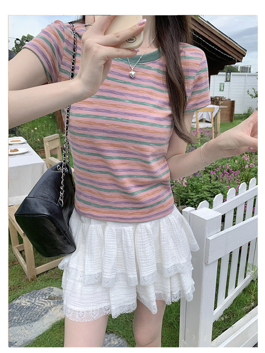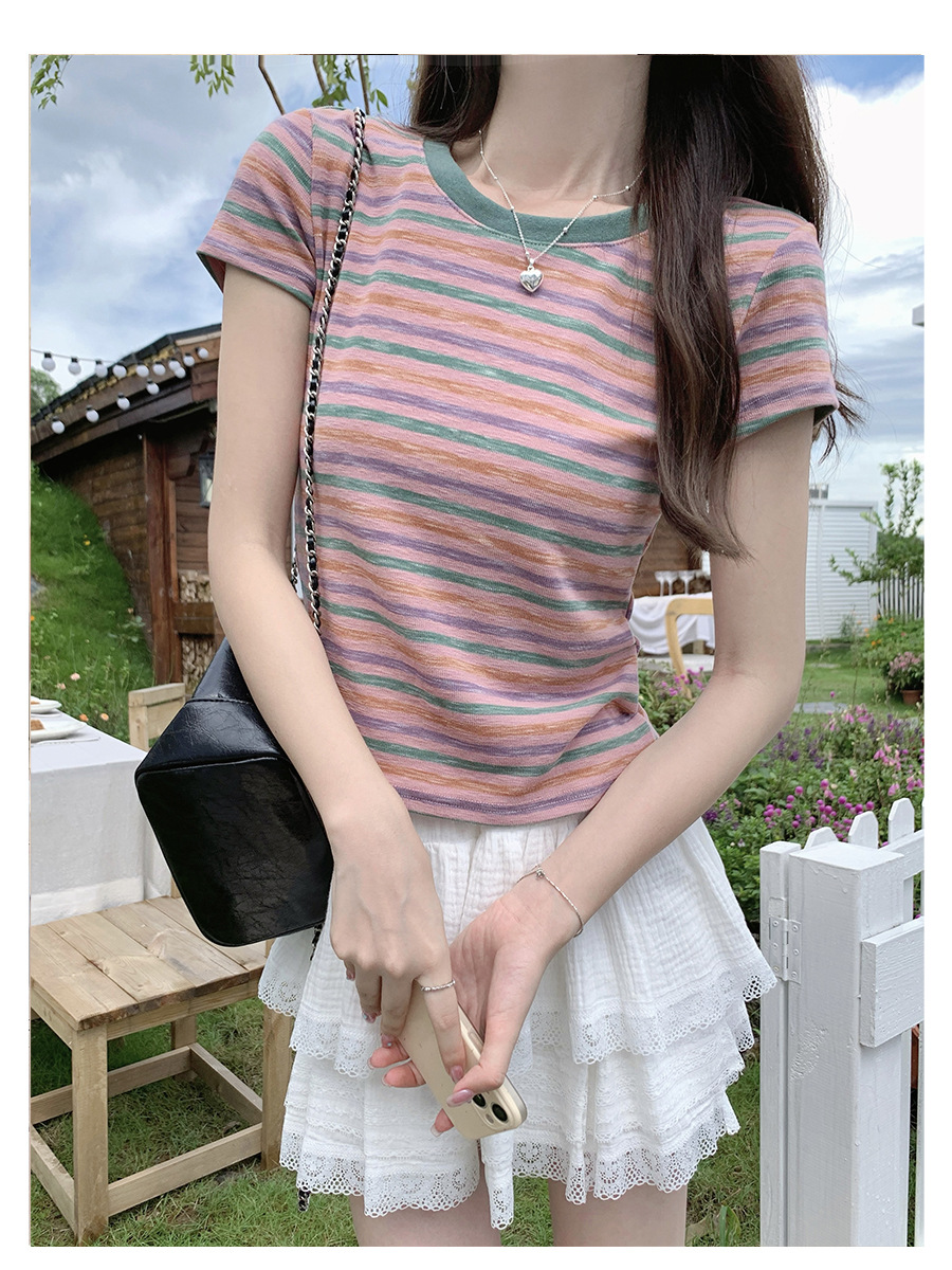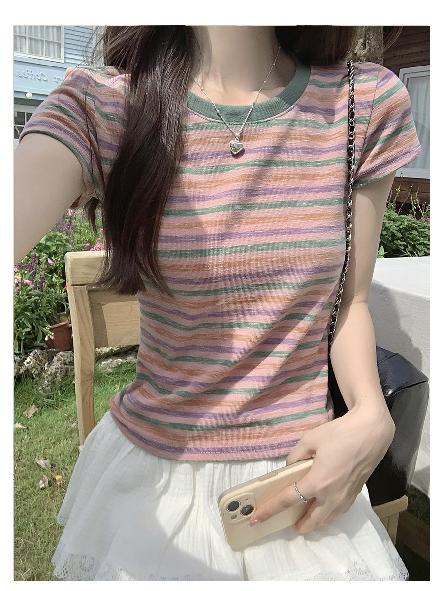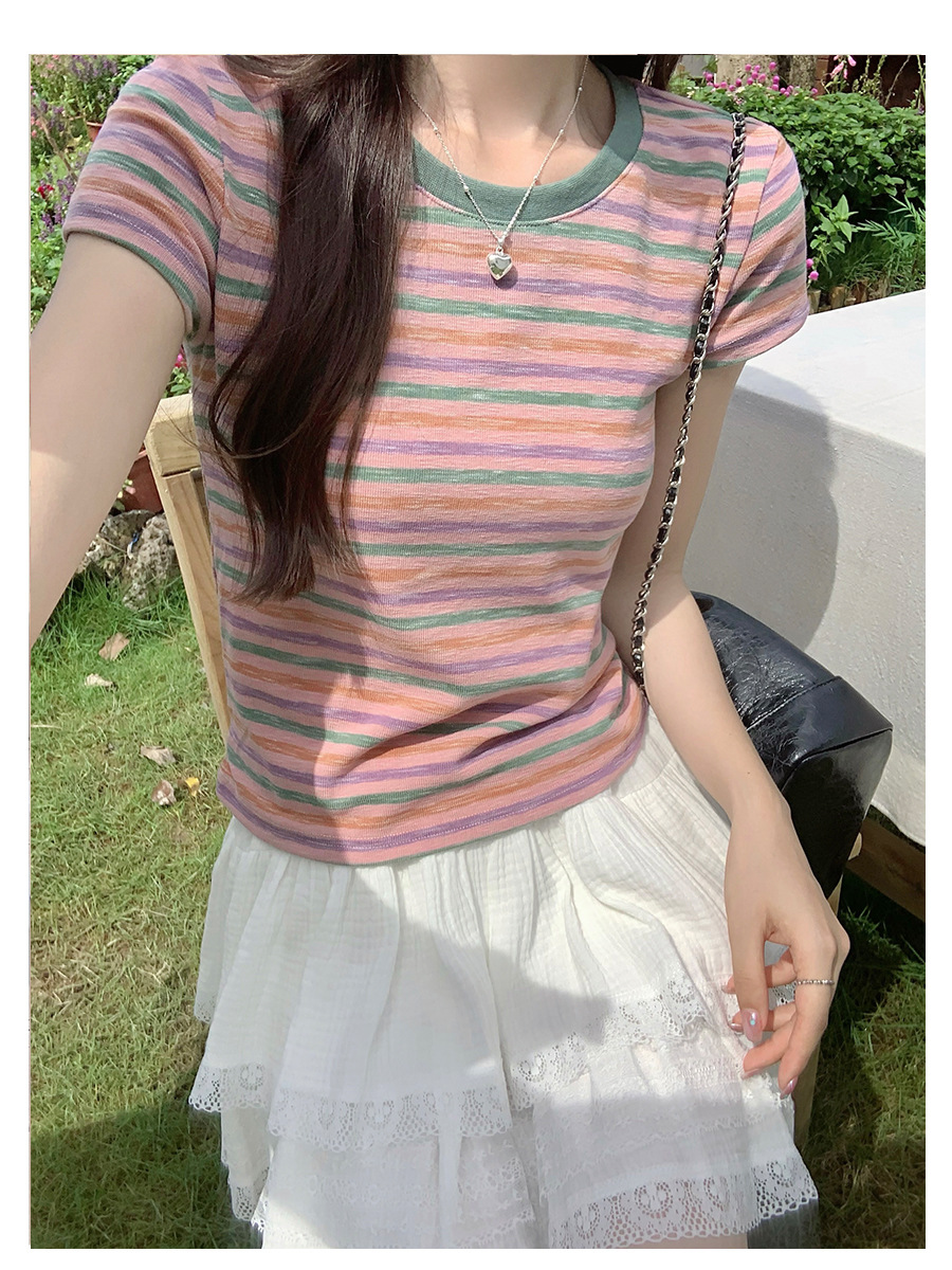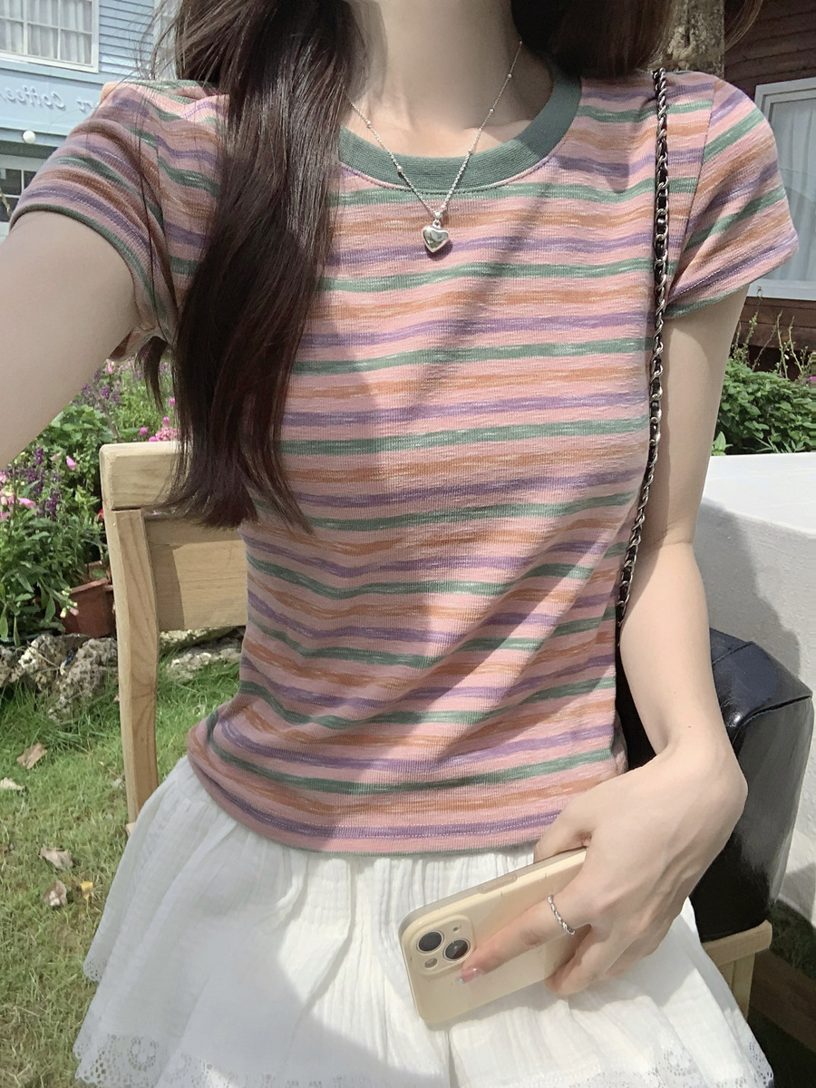 여름 여성을 위한 핫 스타일 레인보우 스트라이프 오른쪽 어깨 반팔 티셔츠 새로운 대비 색상 라운드 넥 작은 사람들을 위한 다용도 bm 스타일 탑