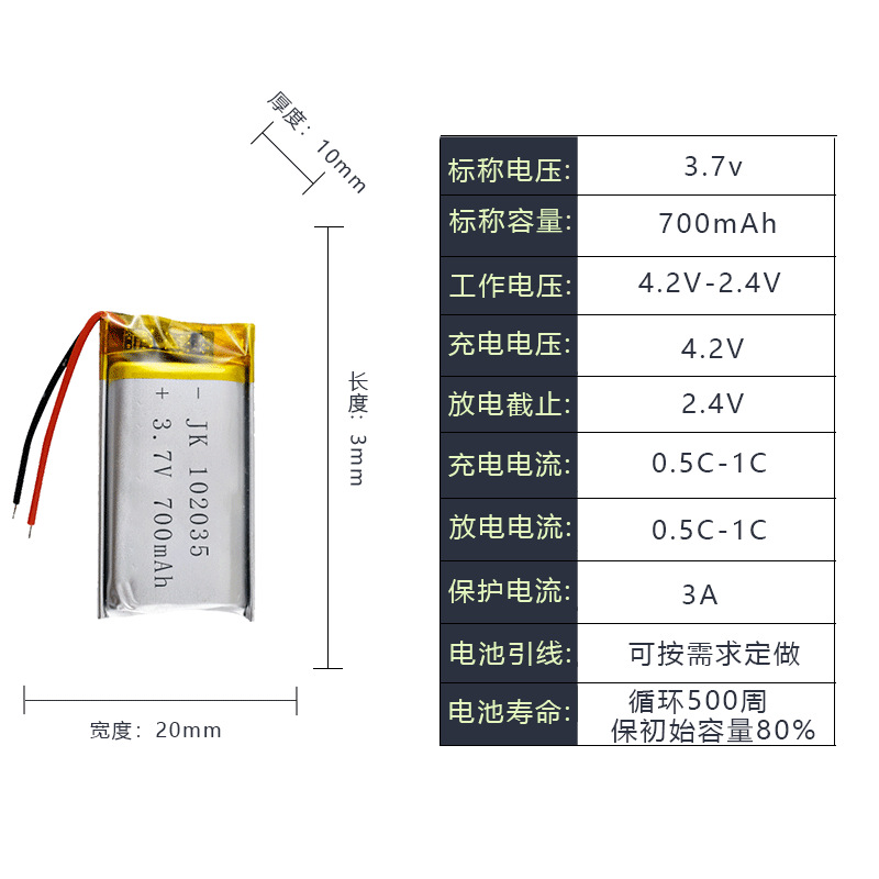 102035 3.7V 700mAh 폴리머 리튬 배터리 화장품 거울 지원 맞춤형 대용량 배터리 수명