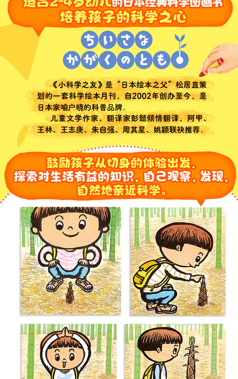 《小科学之友》是“日本绘本之父”松居直策划的一套科学绘本月刊。它秉承着“培养孩子的科学之心”的出版宗旨,自2002 年创办至今,出版了数百本科普书,是日本家喻户晓的科普品牌。