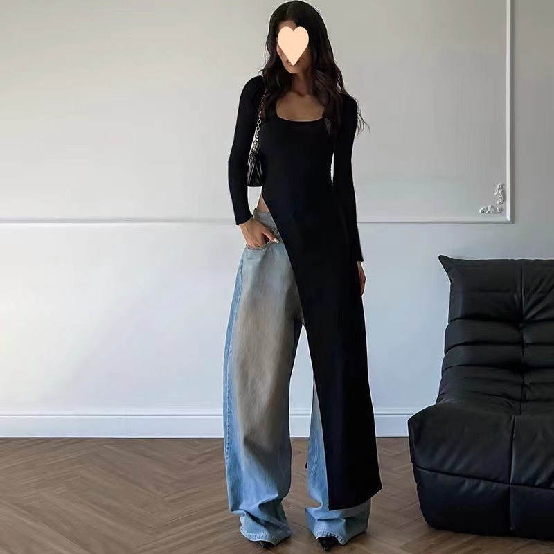 유럽과 미국 스타일의 가을 유럽과 미국 패션 단색 성격 칼라 슬림 섹시한 분할 긴 소매 원피스스토어 가기