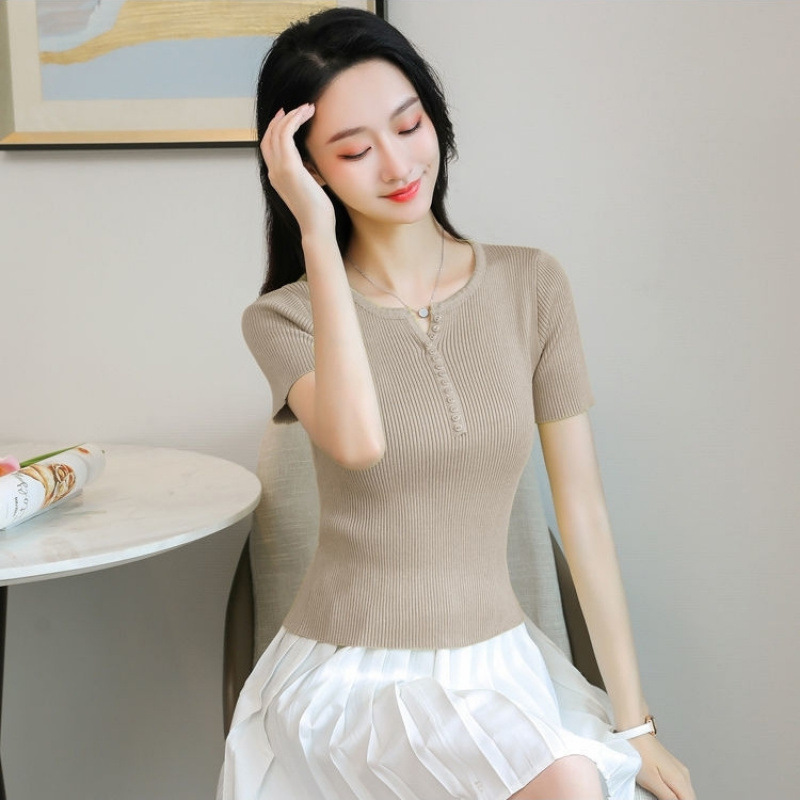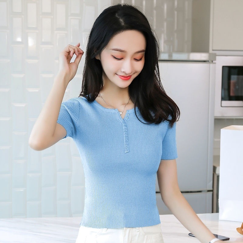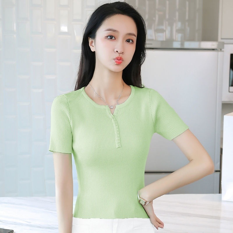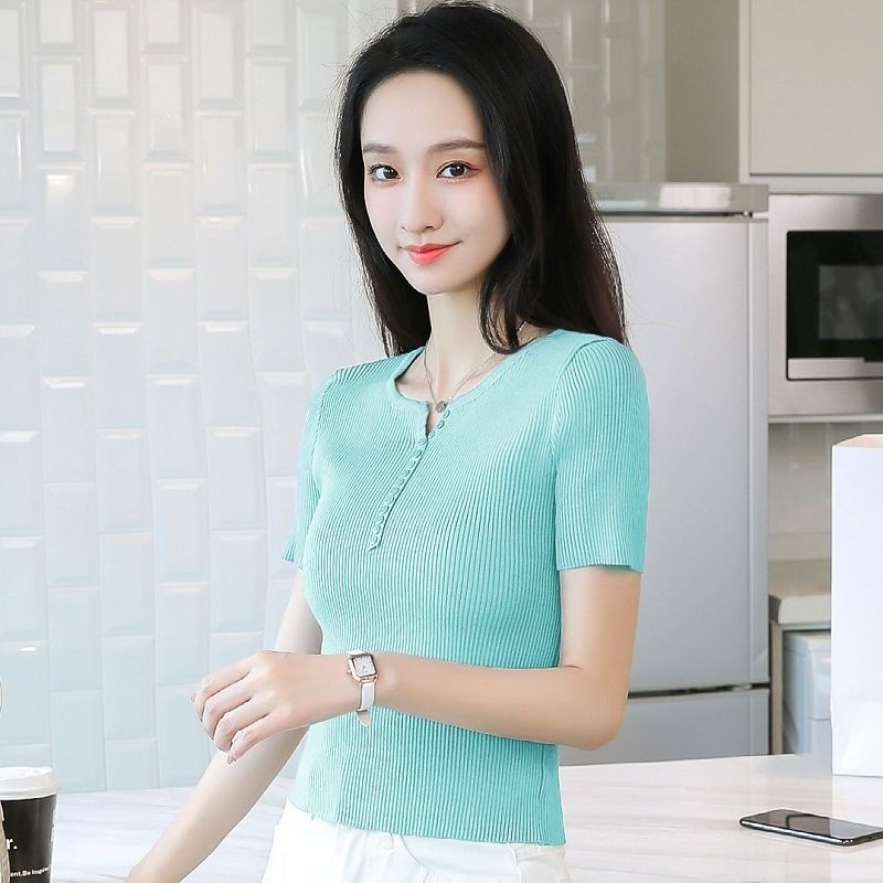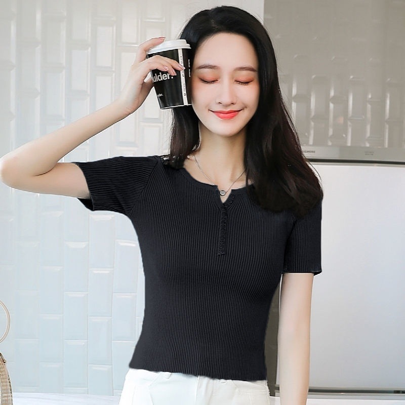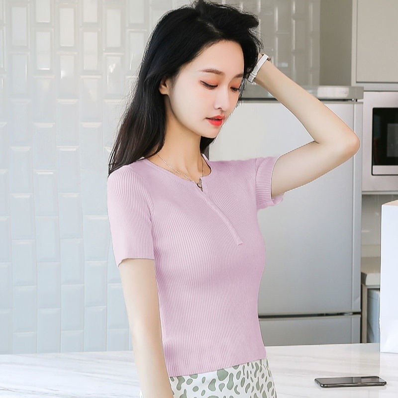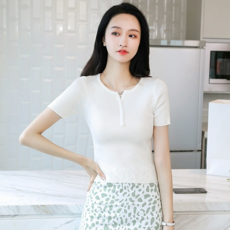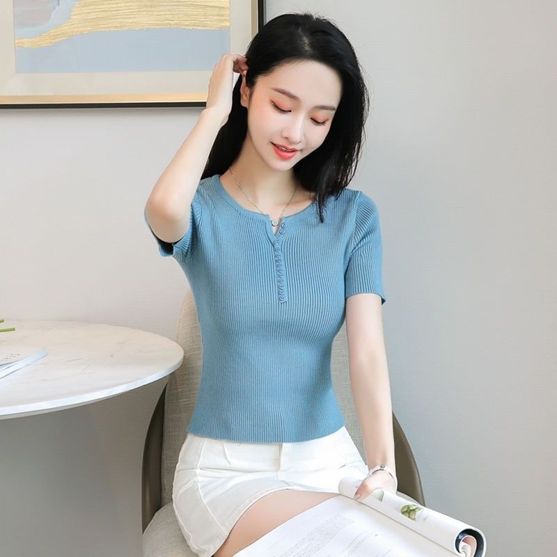 외국식 하프 오픈 가슴 니트 탑 여자 얇은 슈퍼 핫 ins2023 여름 올 매치 짧은 아이스 실크 티셔츠 셔츠스토어 가기