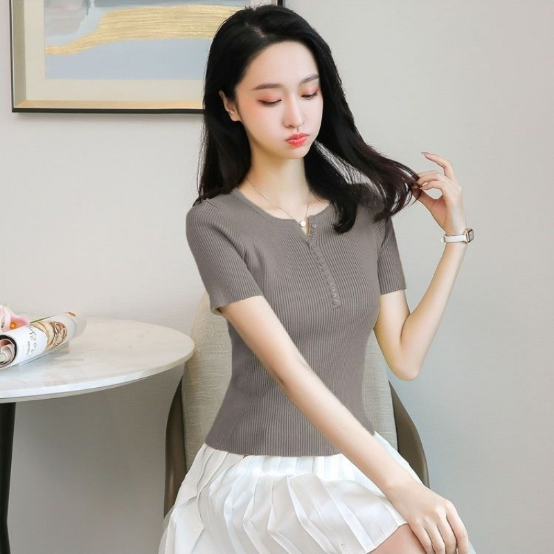 외국식 하프 오픈 가슴 니트 탑 여자 얇은 슈퍼 핫 ins2023 여름 올 매치 짧은 아이스 실크 티셔츠 셔츠