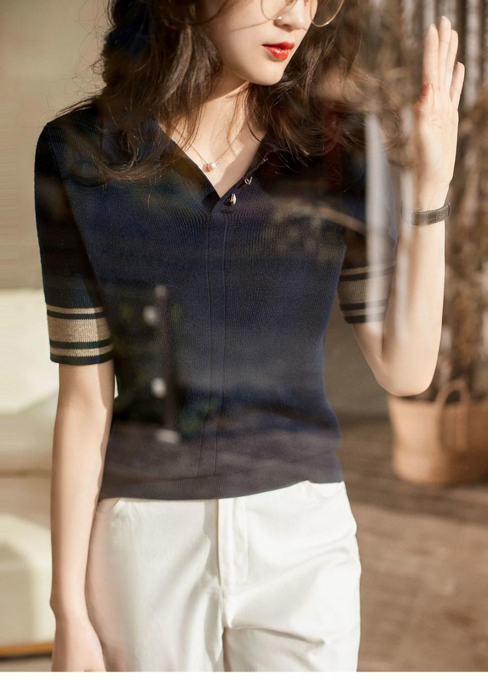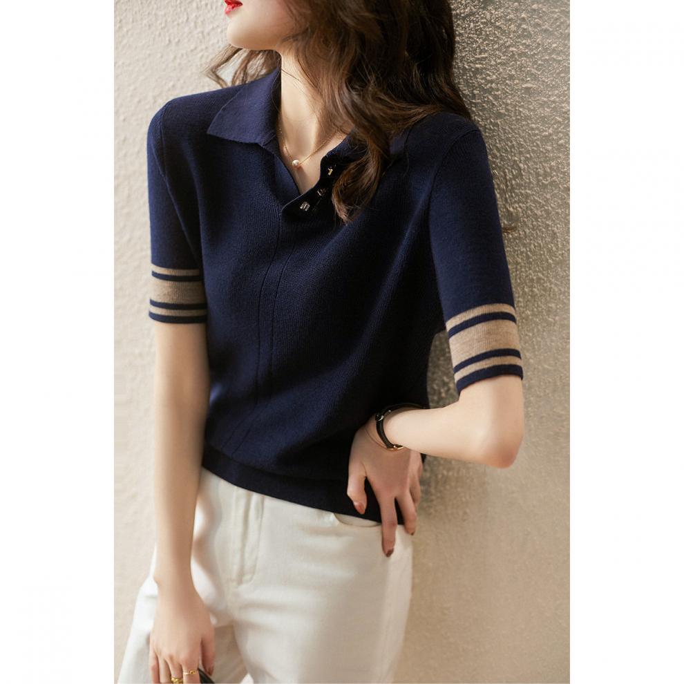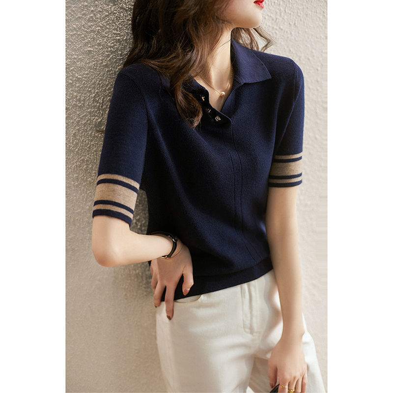 여름 새로운 우아한 폴로 엘 짧은 소매 아이스 실크 니트 셔츠 여성 레트로 패션 서양식 대비 컬러 탑 티셔츠