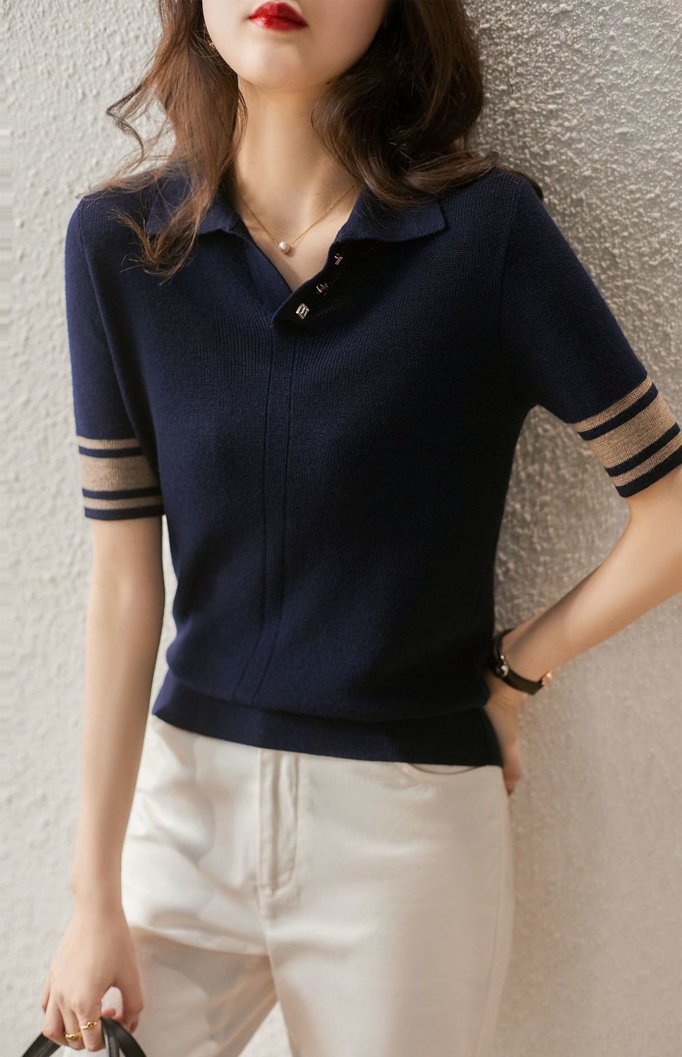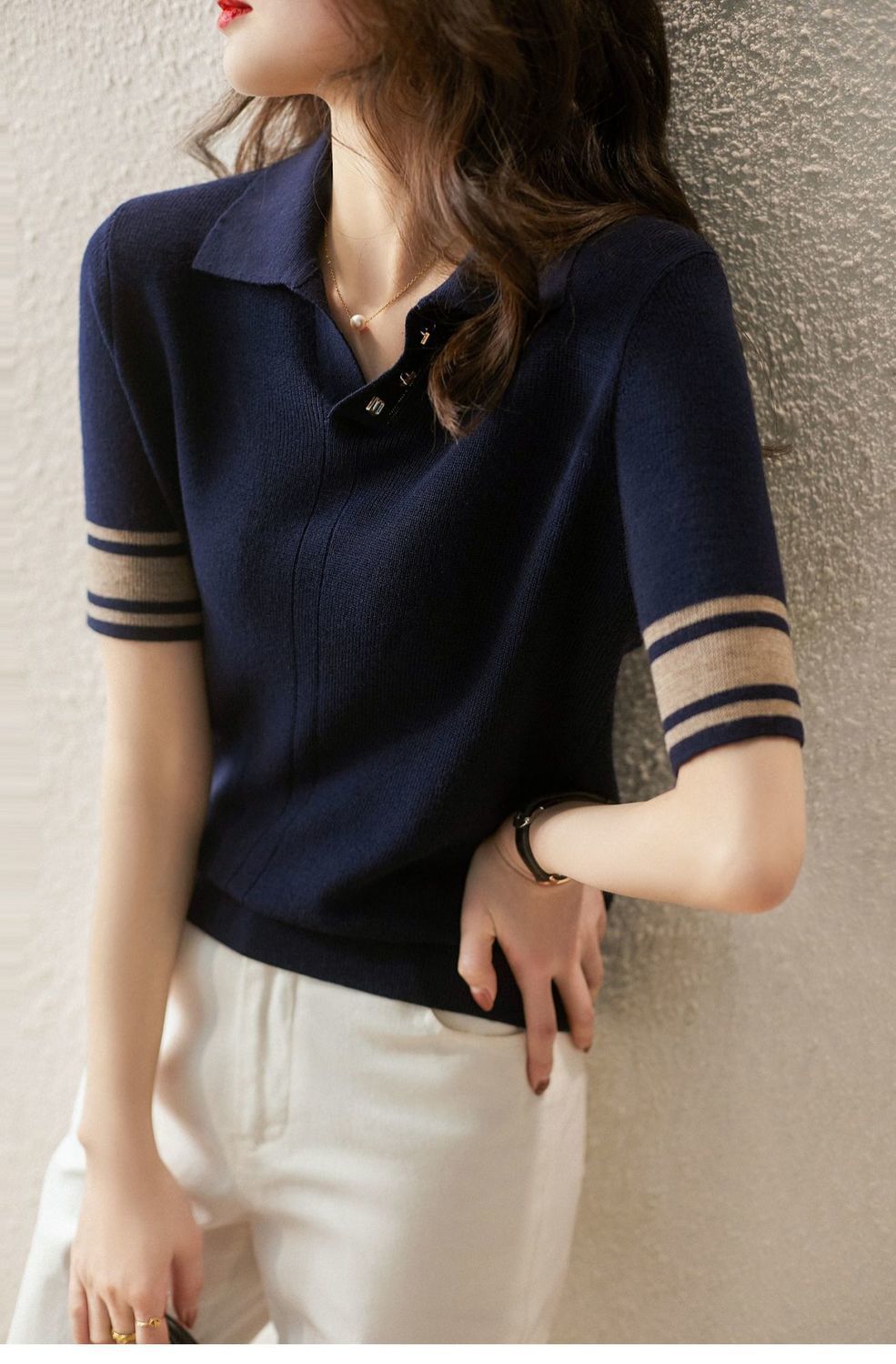 여름 새로운 우아한 폴로 엘 짧은 소매 아이스 실크 니트 셔츠 여성 레트로 패션 서양식 대비 컬러 탑 티셔츠스토어 가기