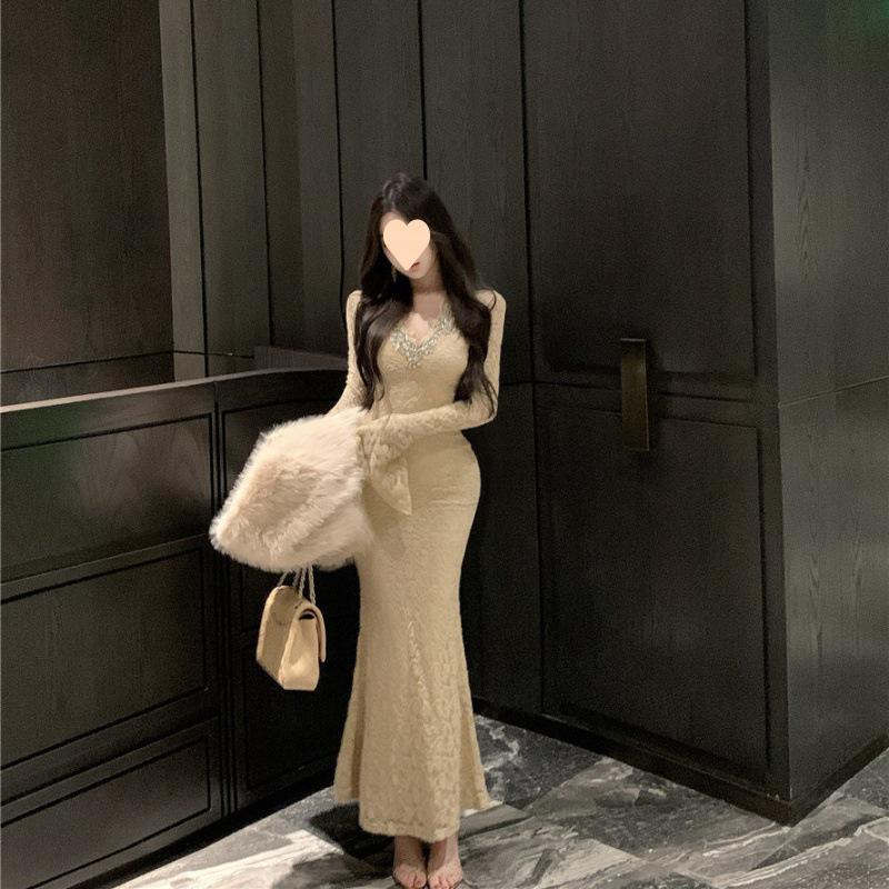순수한 욕망 무거운 의무 칼라 우아한 숙녀 원피스 여성용 레이스 스티칭 트럼펫 슬리브 긴 스커트 슬림 핏 힙합 스커트스토어 가기
