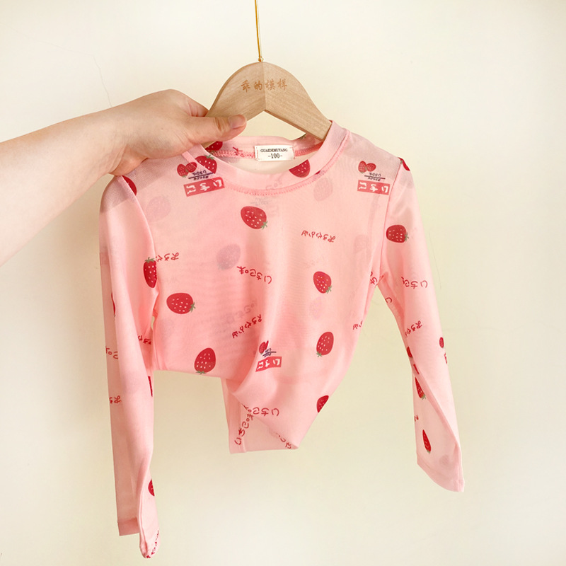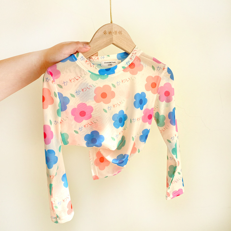 여아용 하의 셔츠 여름 신작 레이스 스타일 메쉬 속건성 아동용 라운드 넥 티셔츠 긴팔 얼음 실크 자외선 차단제