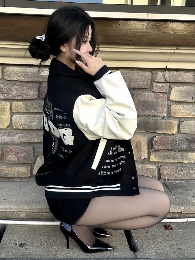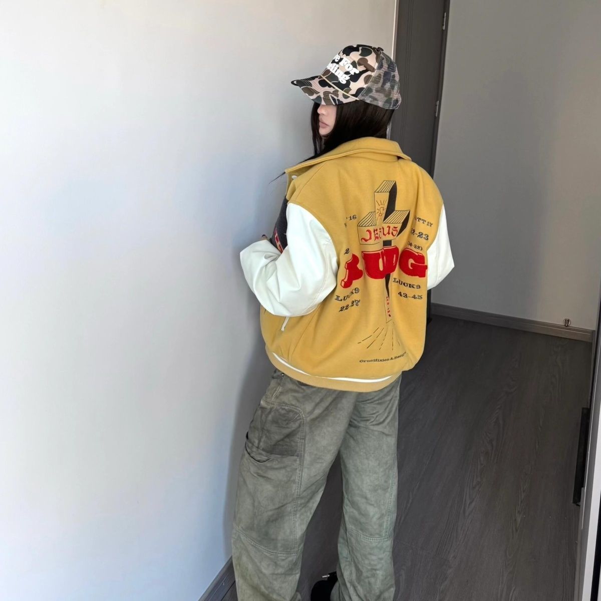 아마존 레터링 자수 가죽 배색 야구점퍼 크로스보더 트렌드 브랜드 유럽 및 미국 스트리트 스타일 숏 자켓 여성 상의스토어 가기