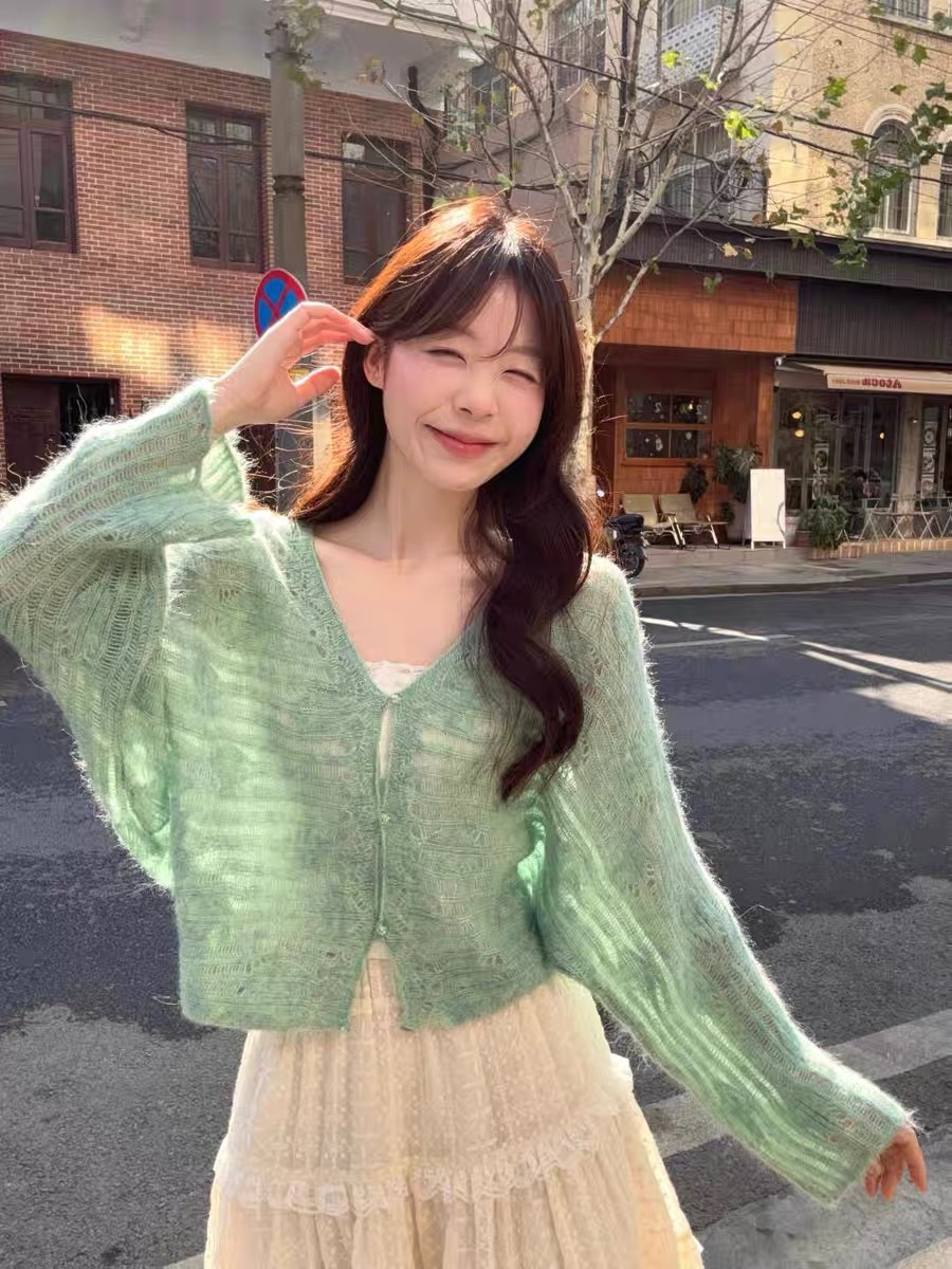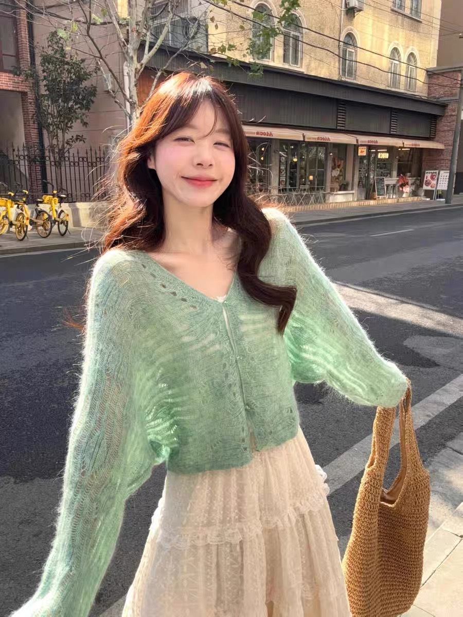 그린 할로우 니트 카디건 여성 봄 디자인 센스 아우터 착용 얇은 선 스크린 블라우스 짧은 목도리 재킷 탑스토어 가기