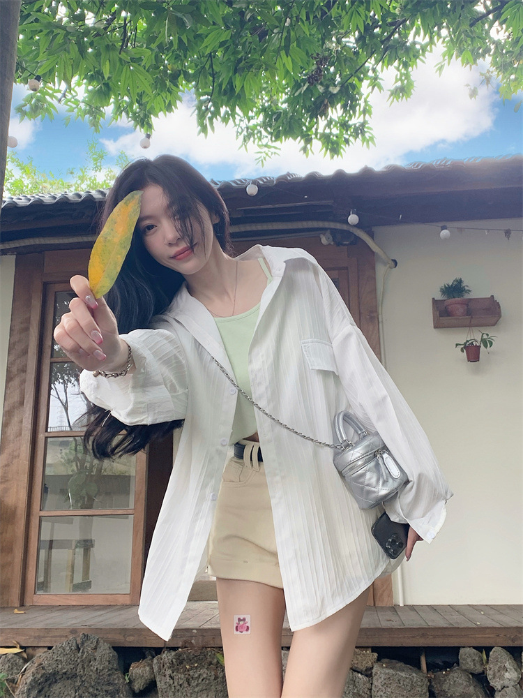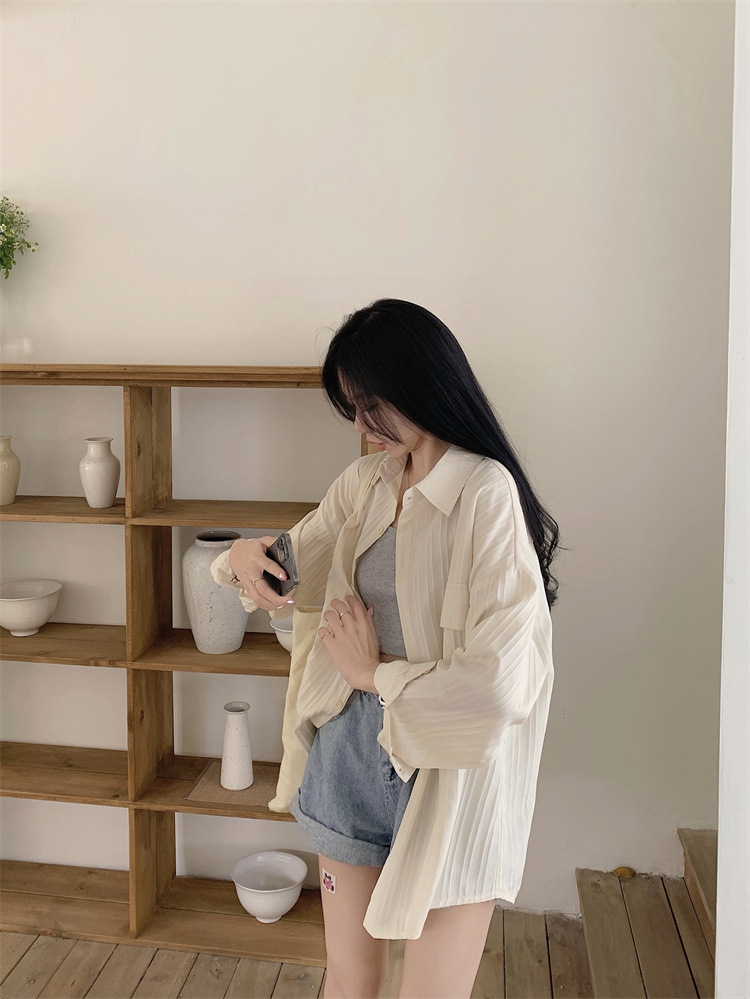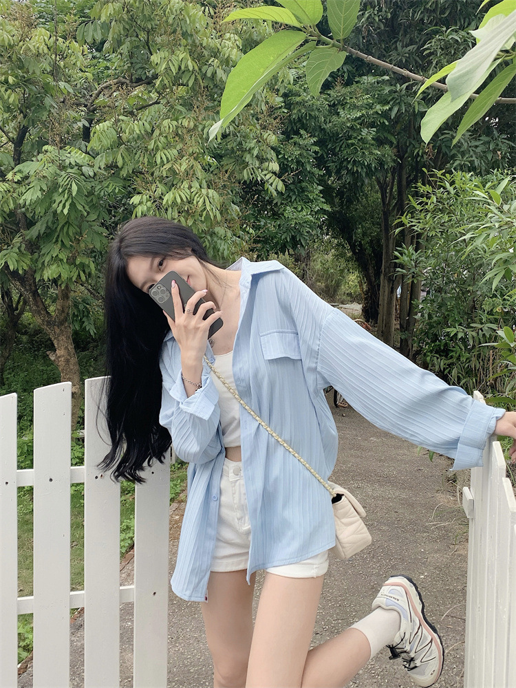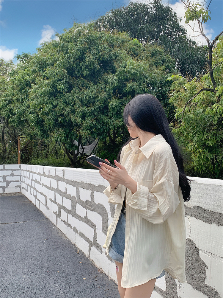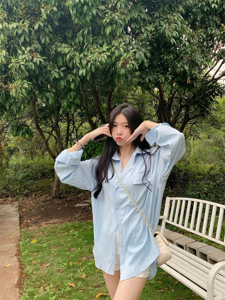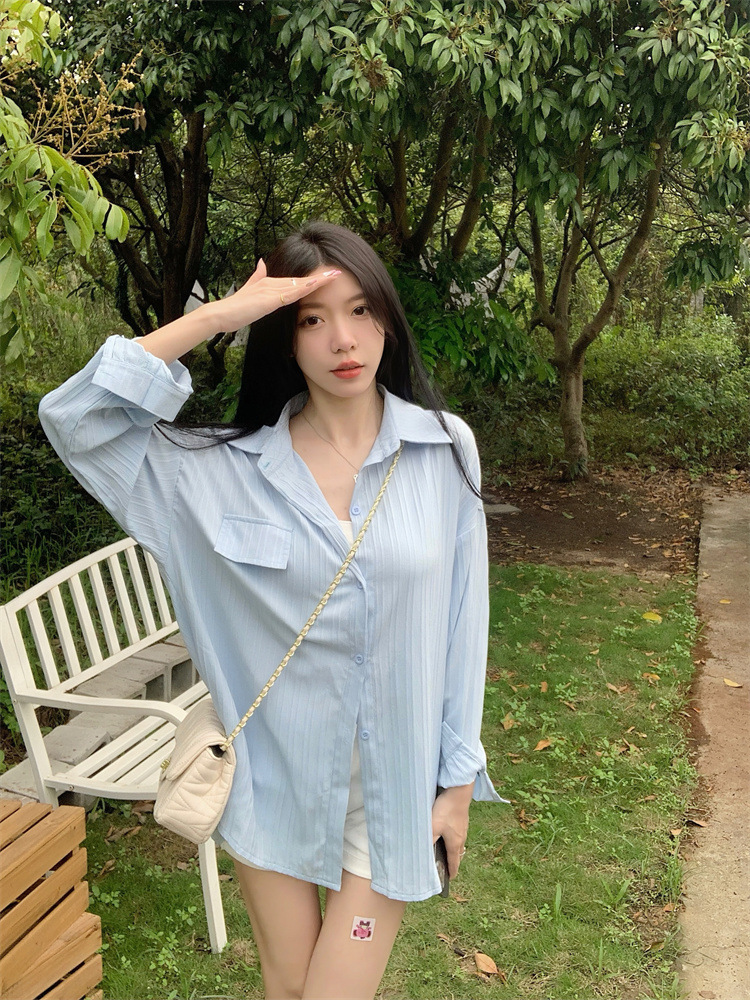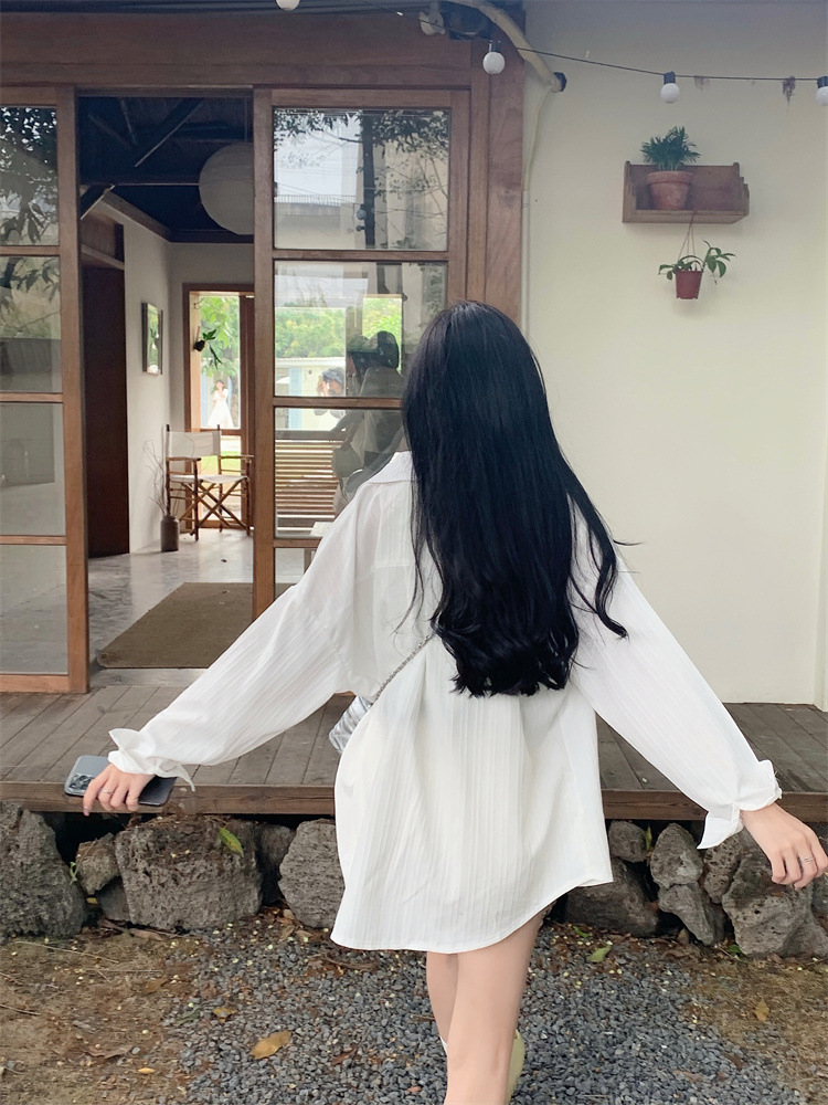 플러스 사이즈 여성의 얇은 줄무늬 선스크린 쉬폰 셔츠 봄과 가을 통통녀 중장 엉덩이 커버 재킷 어깨 탑스토어 가기