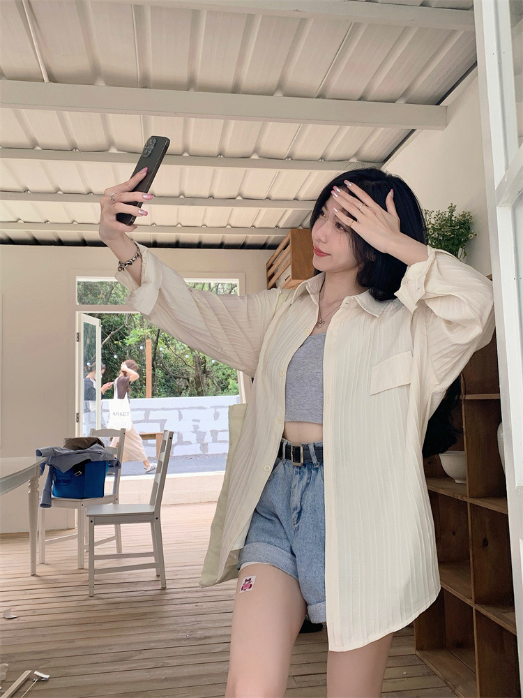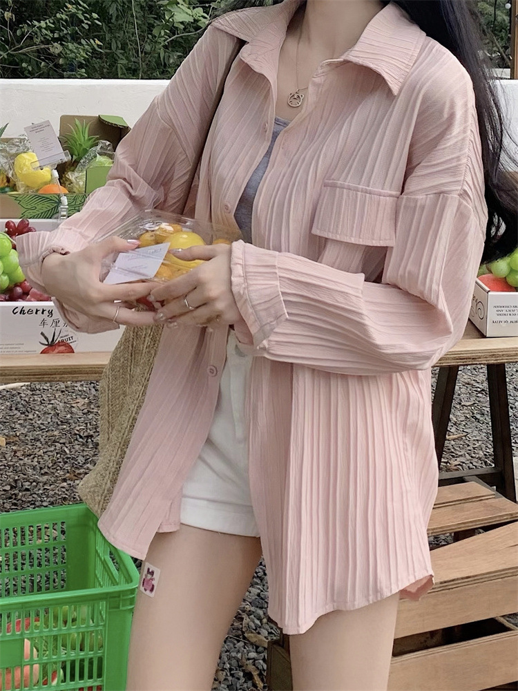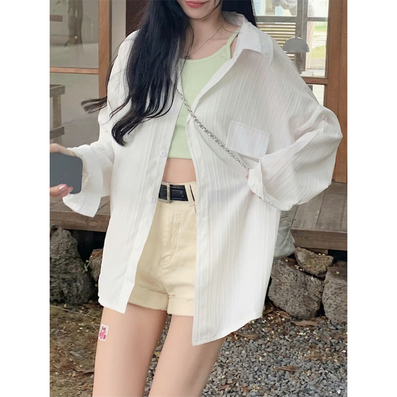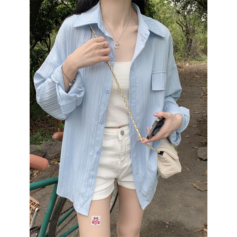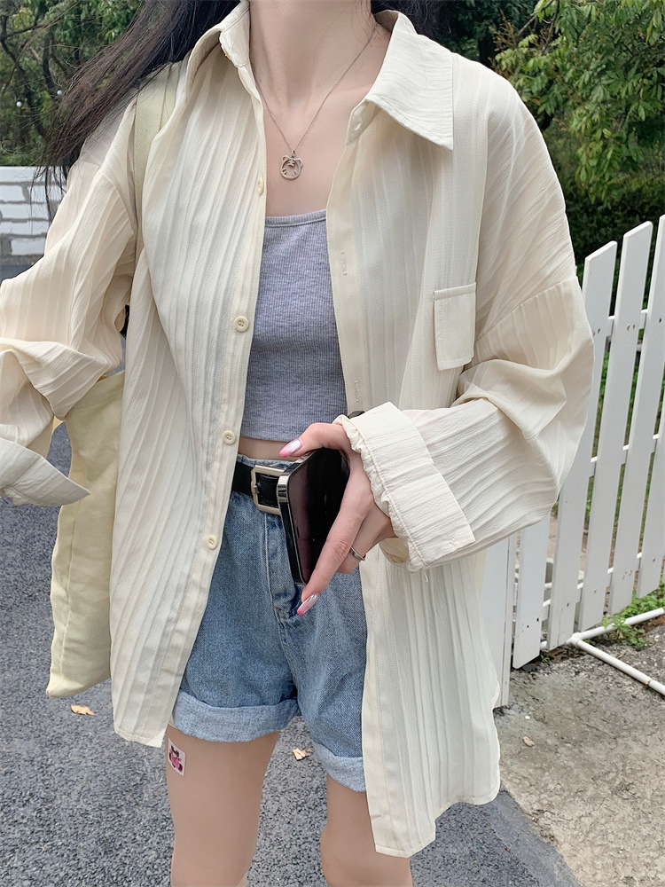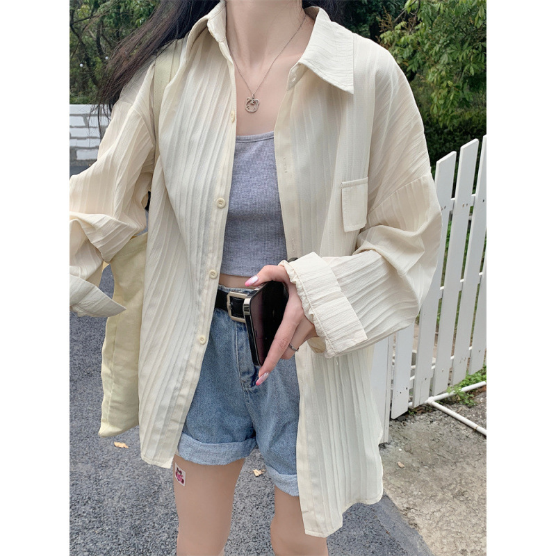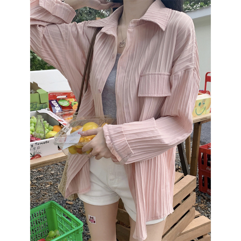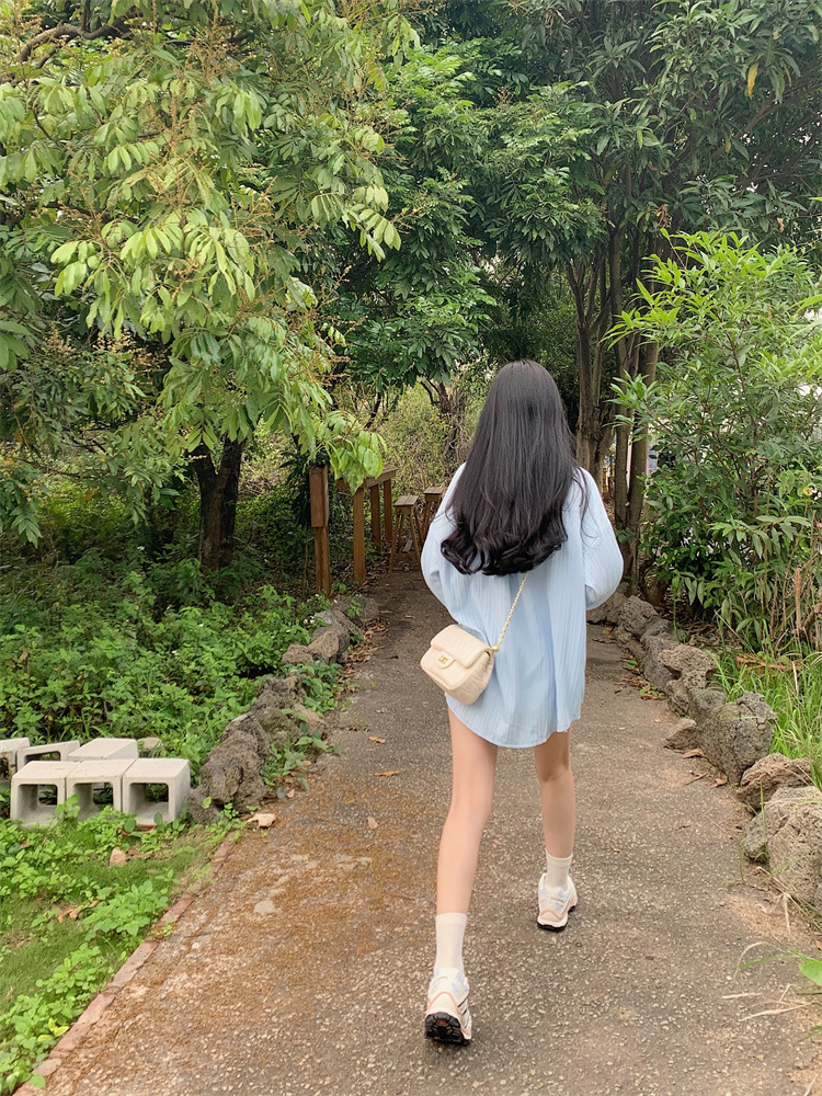 플러스 사이즈 여성의 얇은 줄무늬 선스크린 쉬폰 셔츠 봄과 가을 통통녀 중장 엉덩이 커버 재킷 어깨 탑스토어 가기