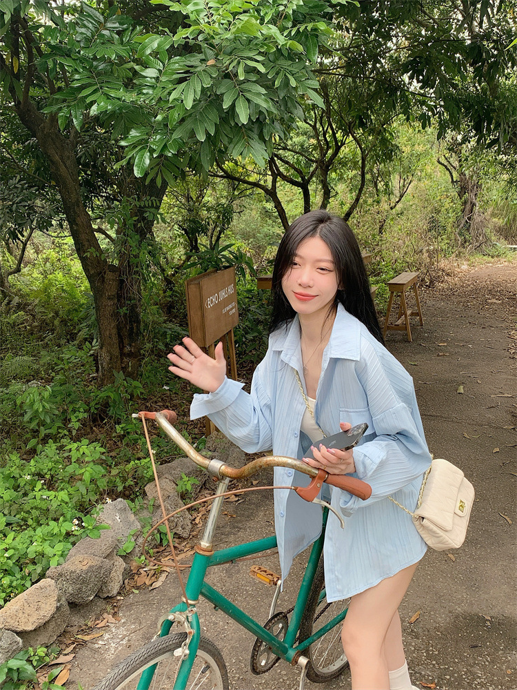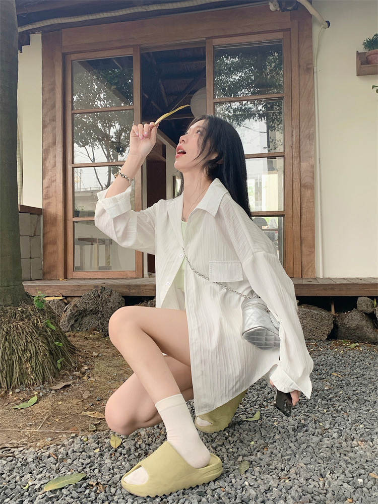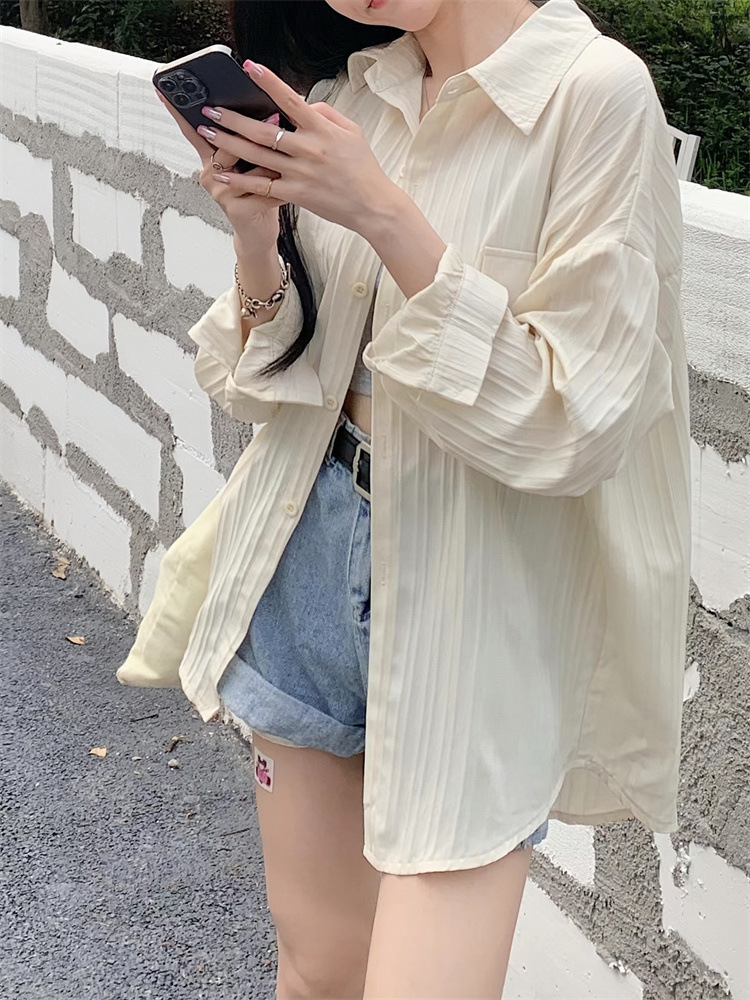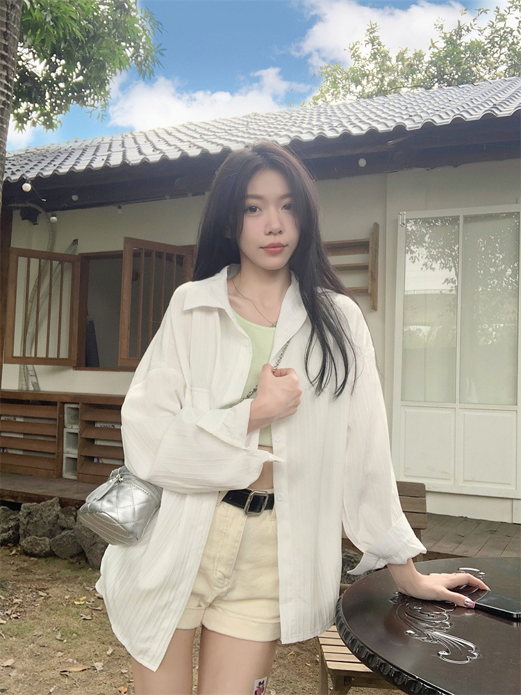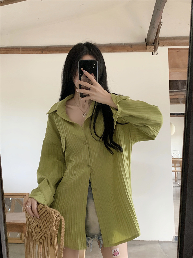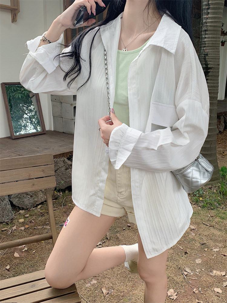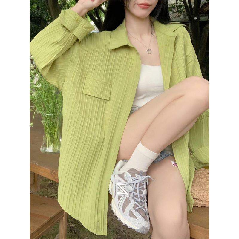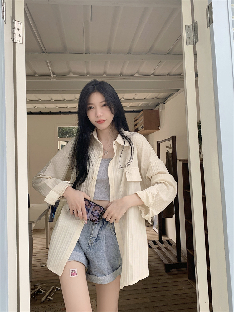 플러스 사이즈 여성의 얇은 줄무늬 선스크린 쉬폰 셔츠 봄과 가을 통통녀 중장 엉덩이 커버 재킷 어깨 탑스토어 가기