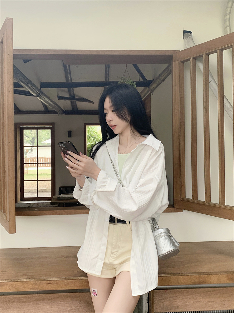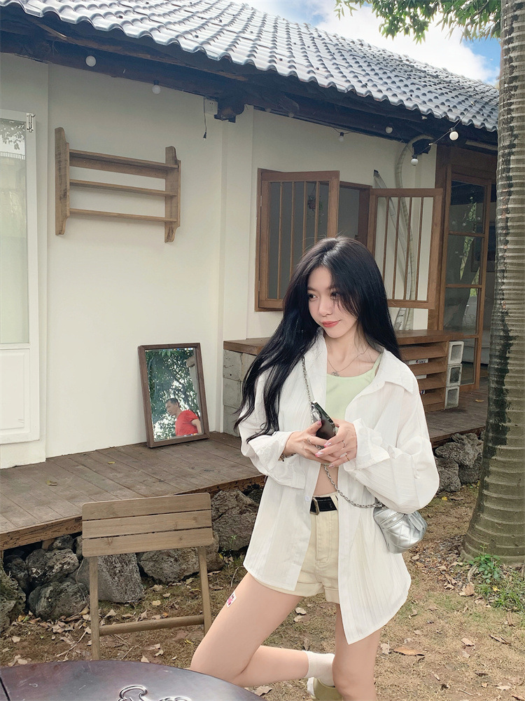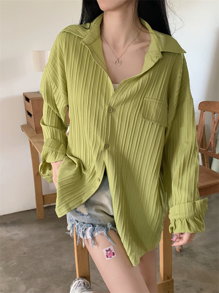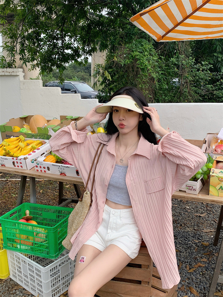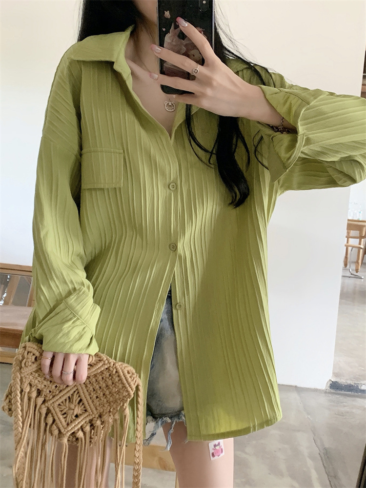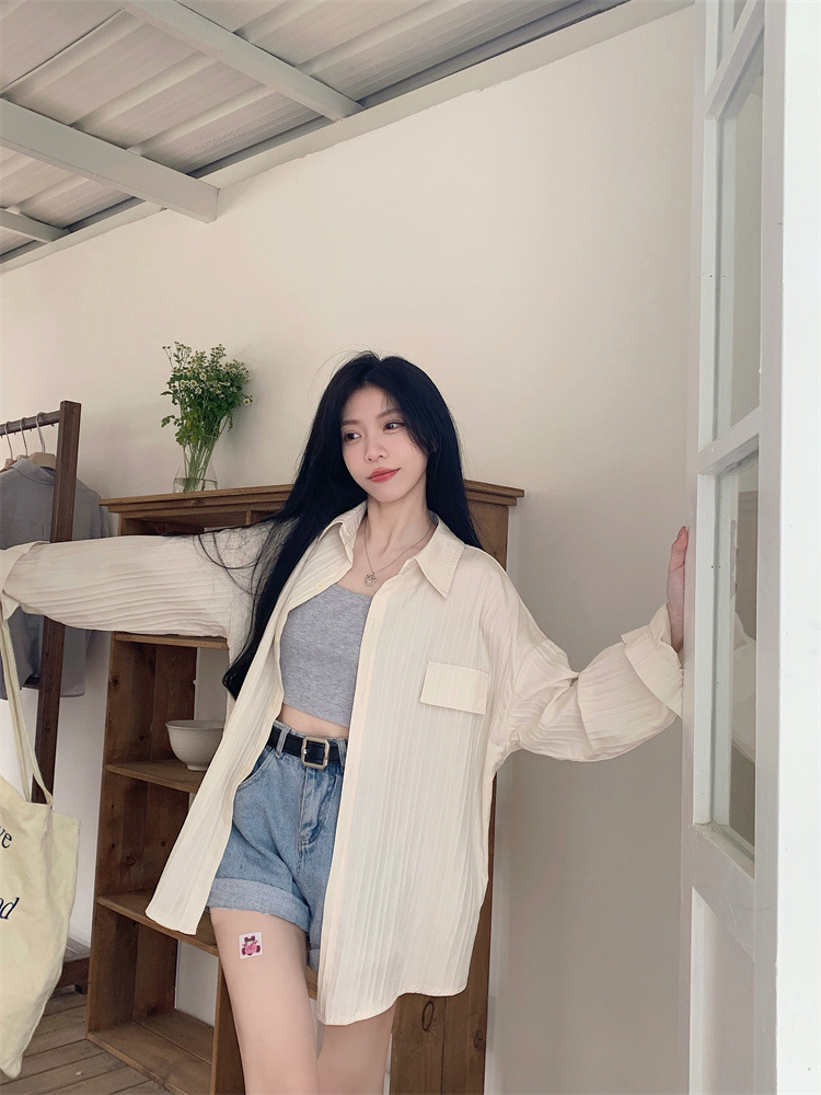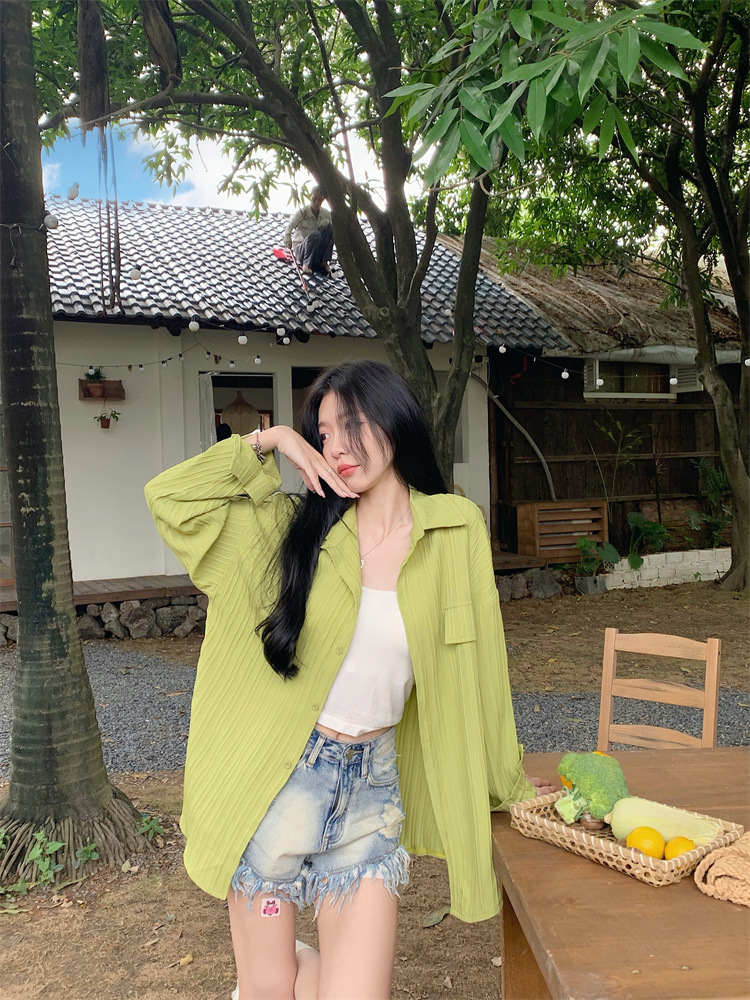 플러스 사이즈 여성의 얇은 줄무늬 선스크린 쉬폰 셔츠 봄과 가을 통통녀 중장 엉덩이 커버 재킷 어깨 탑스토어 가기