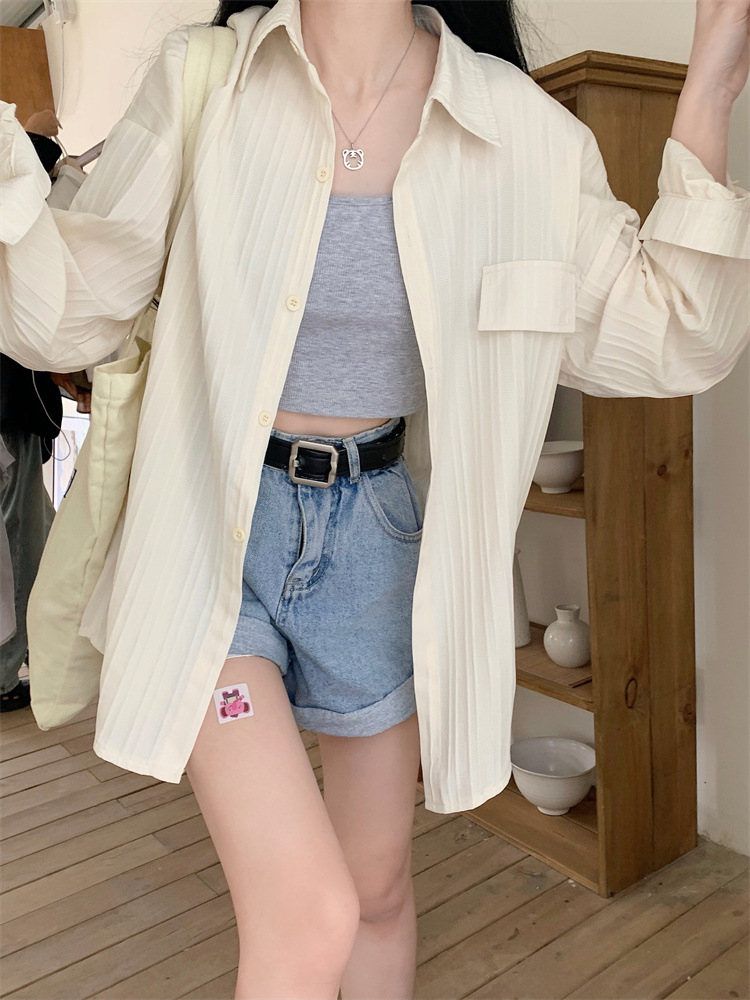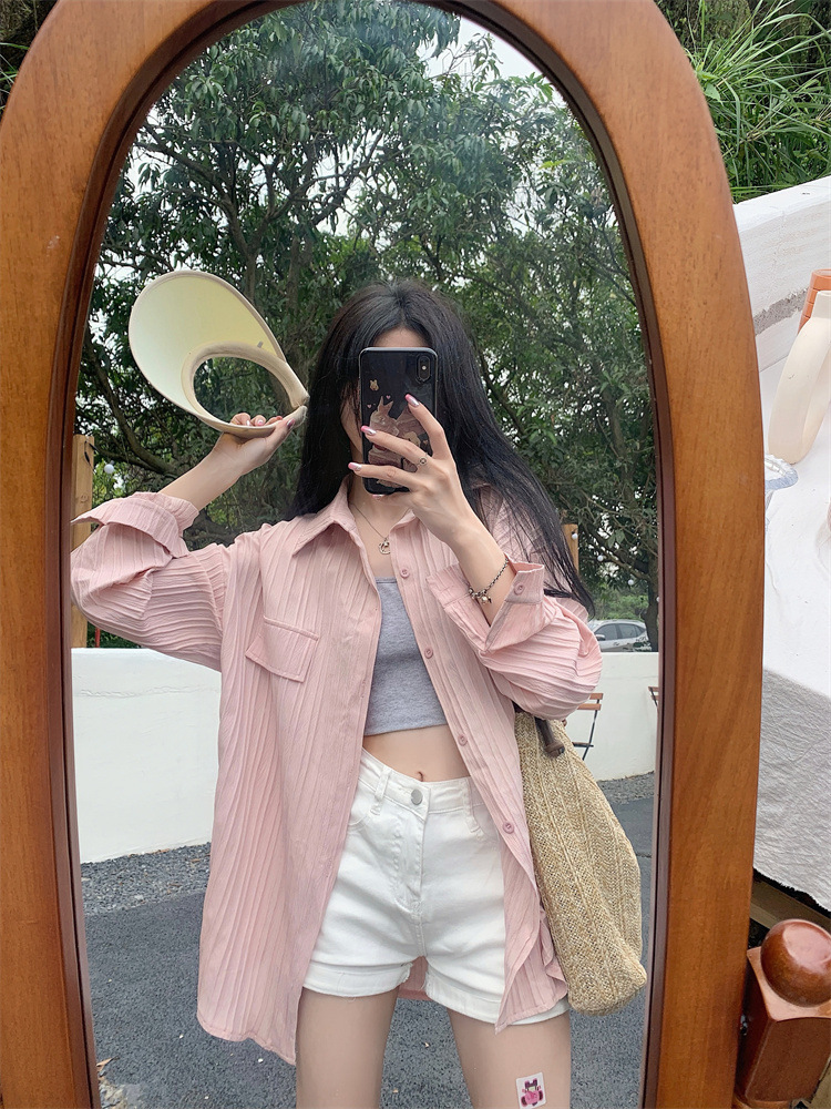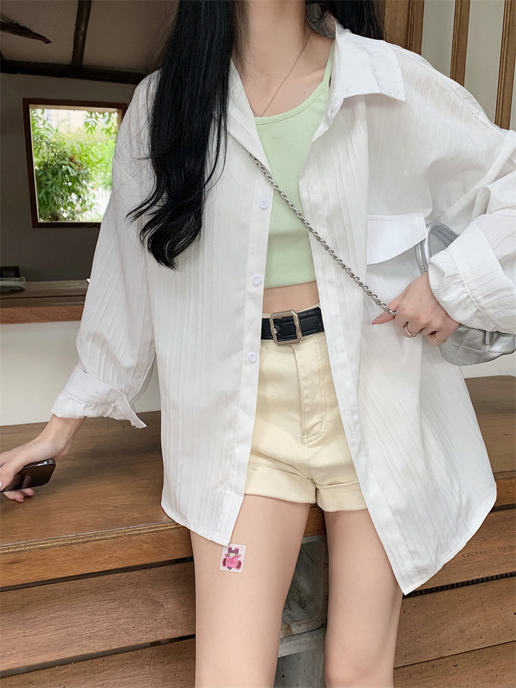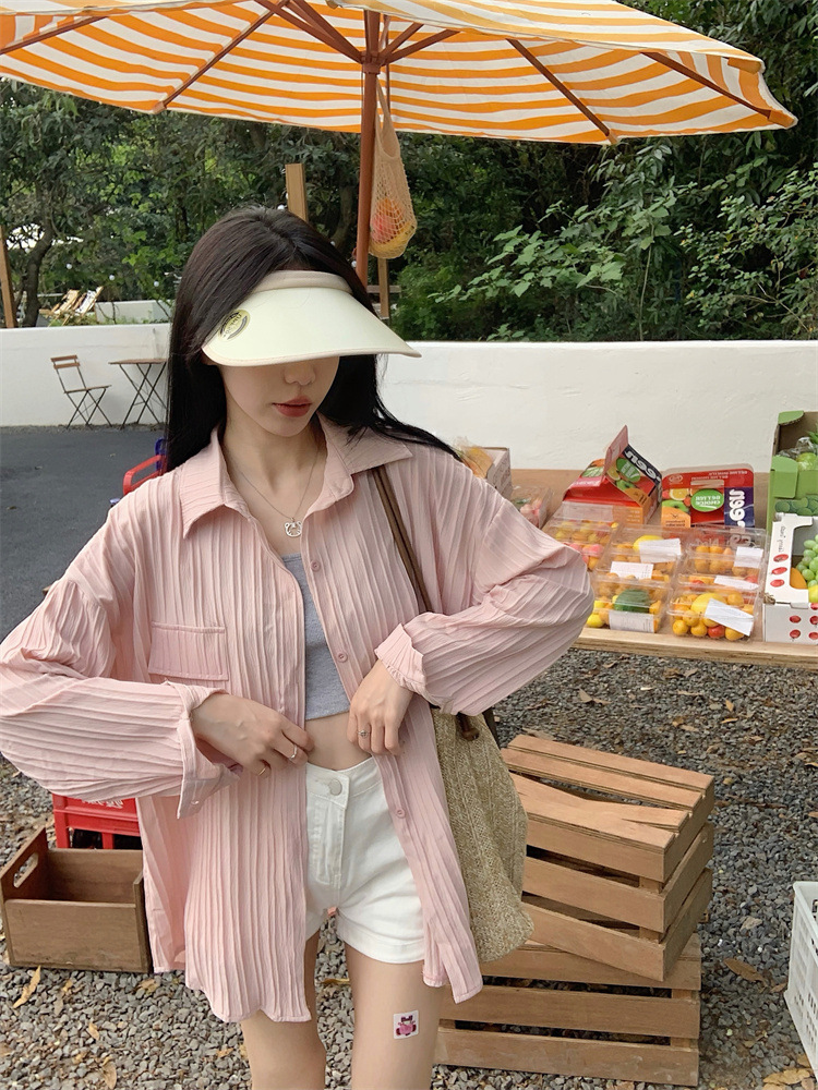 플러스 사이즈 여성의 얇은 줄무늬 선스크린 쉬폰 셔츠 봄과 가을 통통녀 중장 엉덩이 커버 재킷 어깨 탑