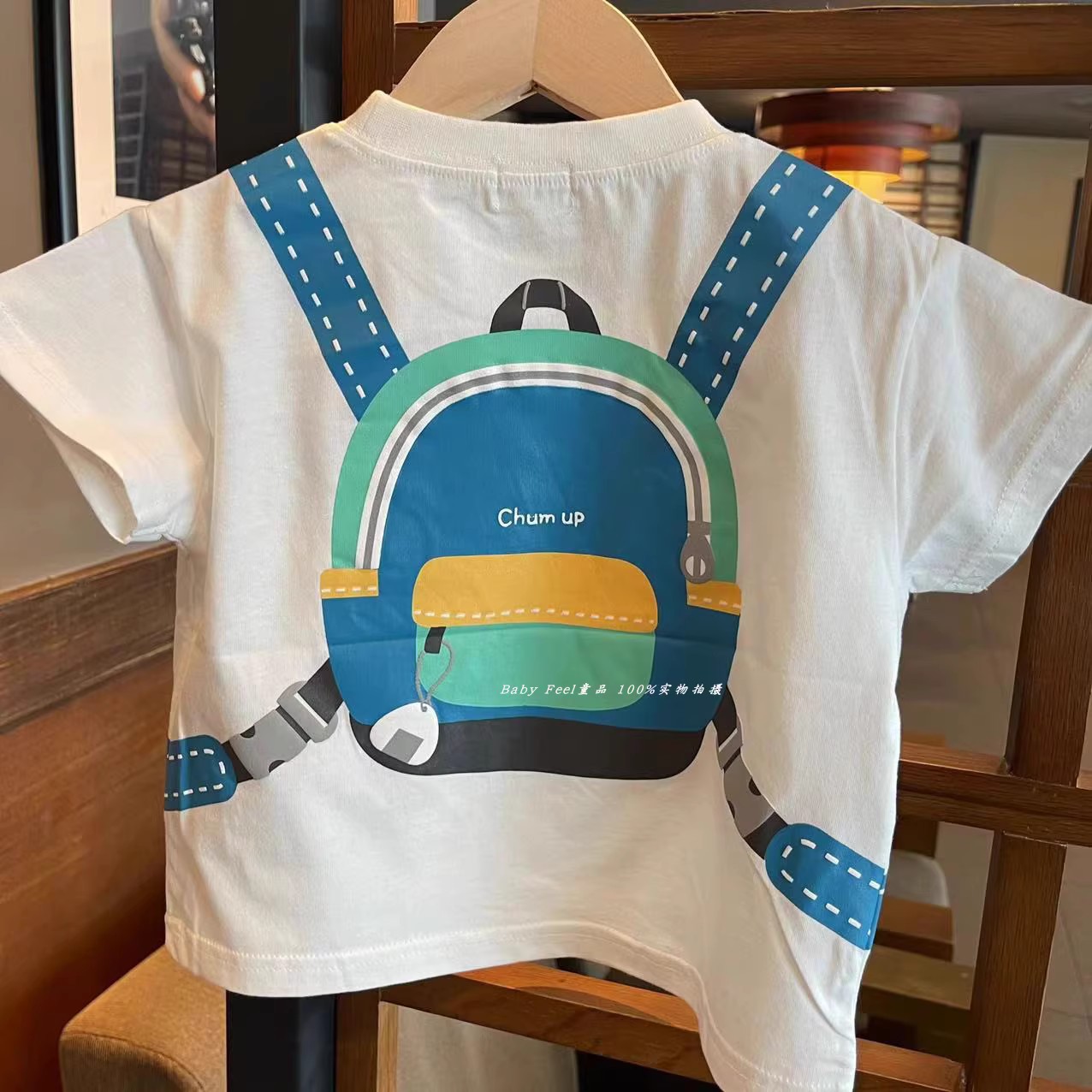 스팟상품! 소년 입체 만화 반팔 2025 여름 서스펜더 학교 가방 티셔츠 아기 어린이 통기성 탑