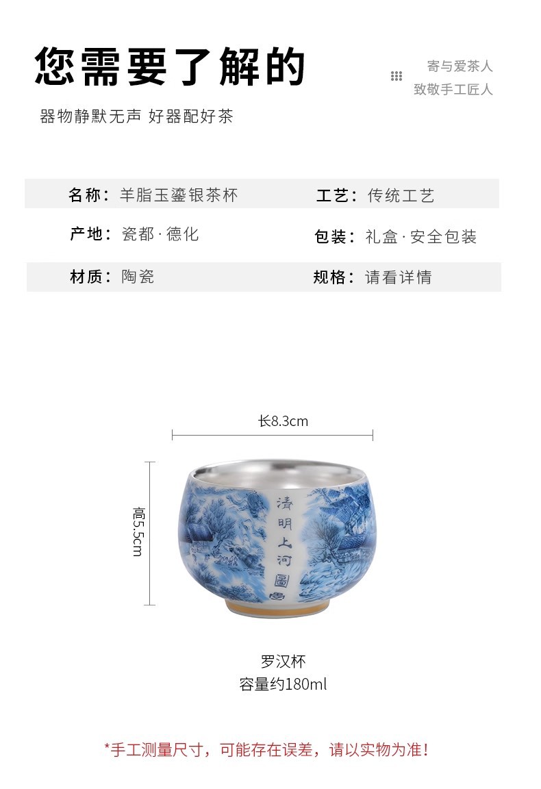 매트 지방 옥 실버 아랍어 컵 중국 칭밍 상하이 그림 티 컵 고급 차 시음 컵 개인 마스터 컵