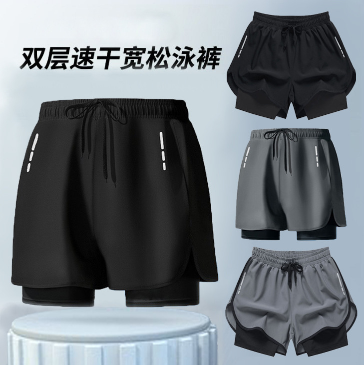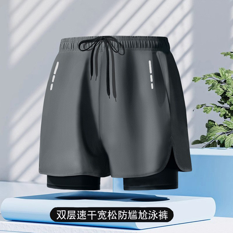 폭발성 더블 레이어 수영 트렁크 남성 스포츠 바지 느슨한 안티 당혹감 복서 수영 트렁크 빠른 건조 고 탄성 온천 수영 트렁크