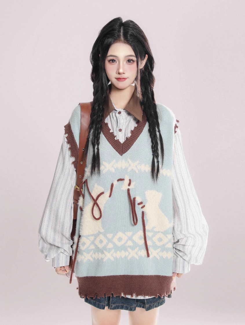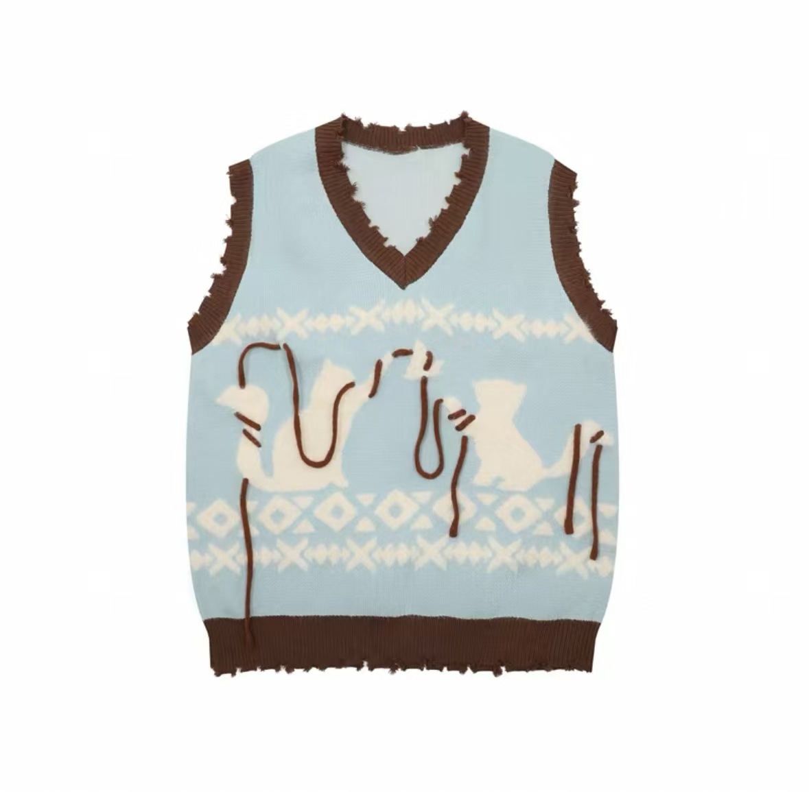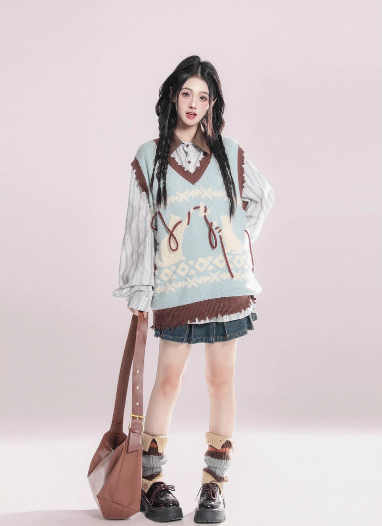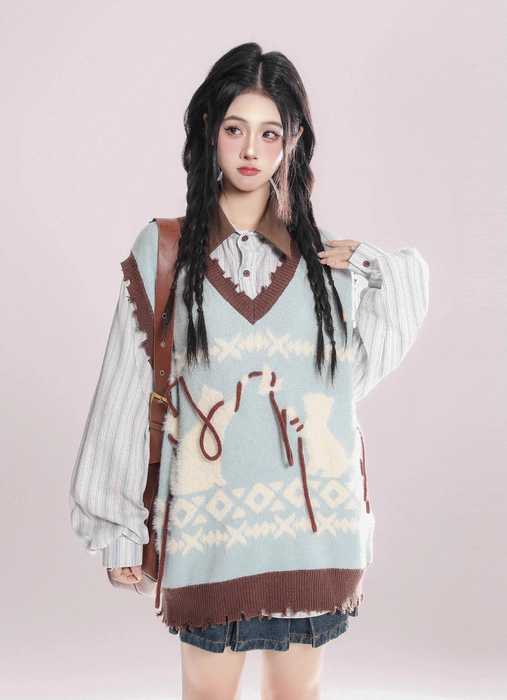 랩핑 된 불규칙한 V 넥 스웨터 조끼 스웨터 여성 가을 새로운 스택 고양이 자카드 레이스 업 탑스토어 가기