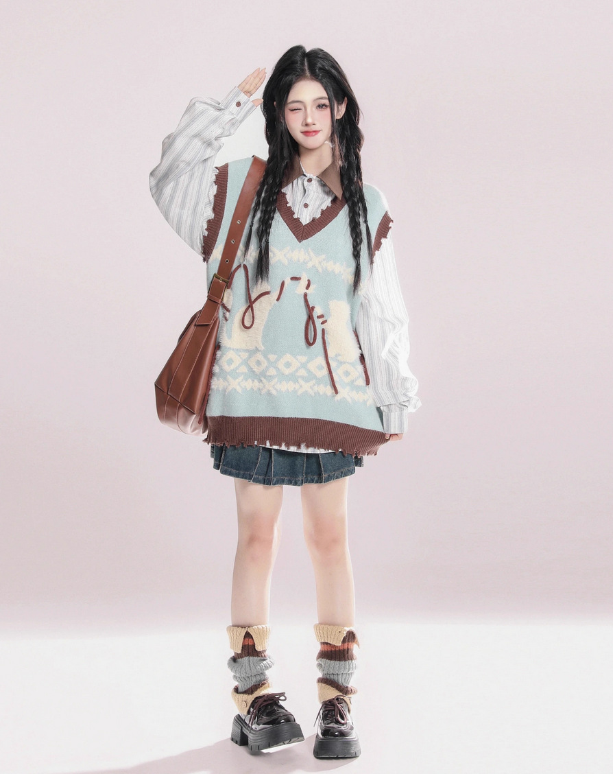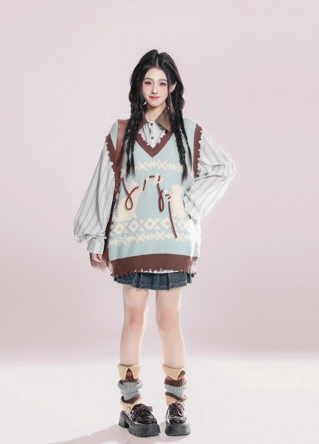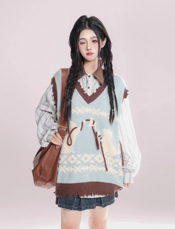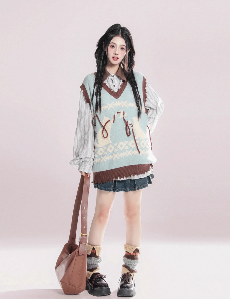 랩핑 된 불규칙한 V 넥 스웨터 조끼 스웨터 여성 가을 새로운 스택 고양이 자카드 레이스 업 탑스토어 가기