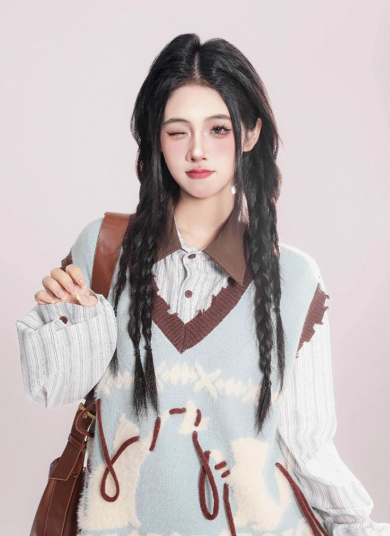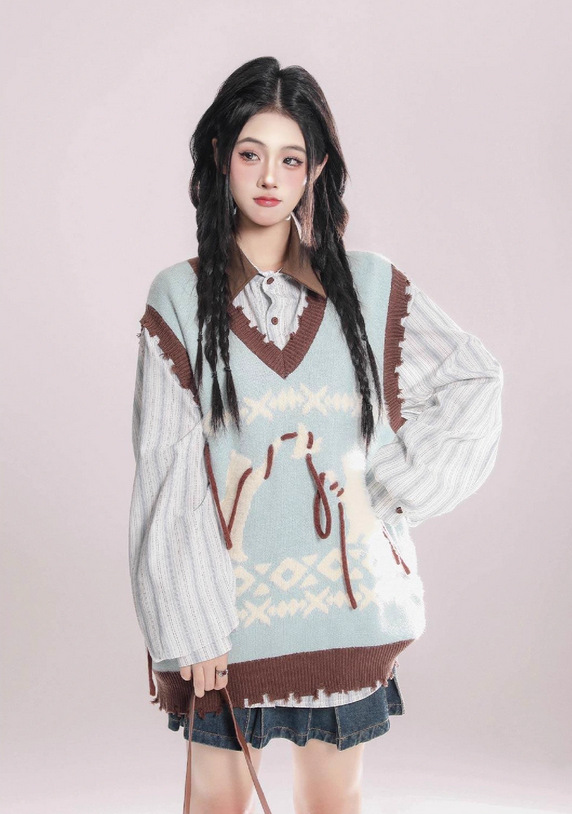 랩핑 된 불규칙한 V 넥 스웨터 조끼 스웨터 여성 가을 새로운 스택 고양이 자카드 레이스 업 탑