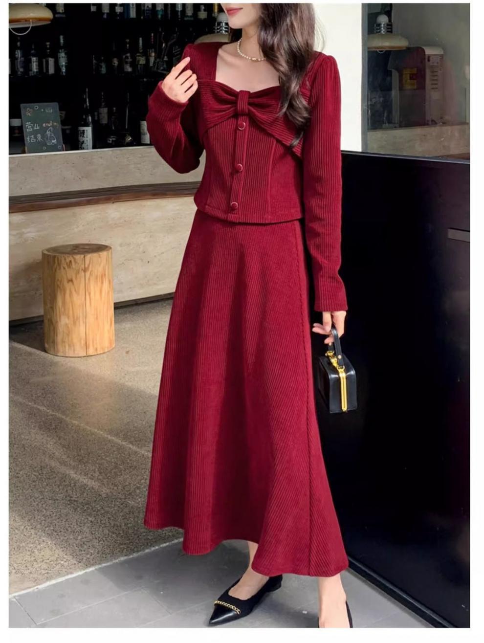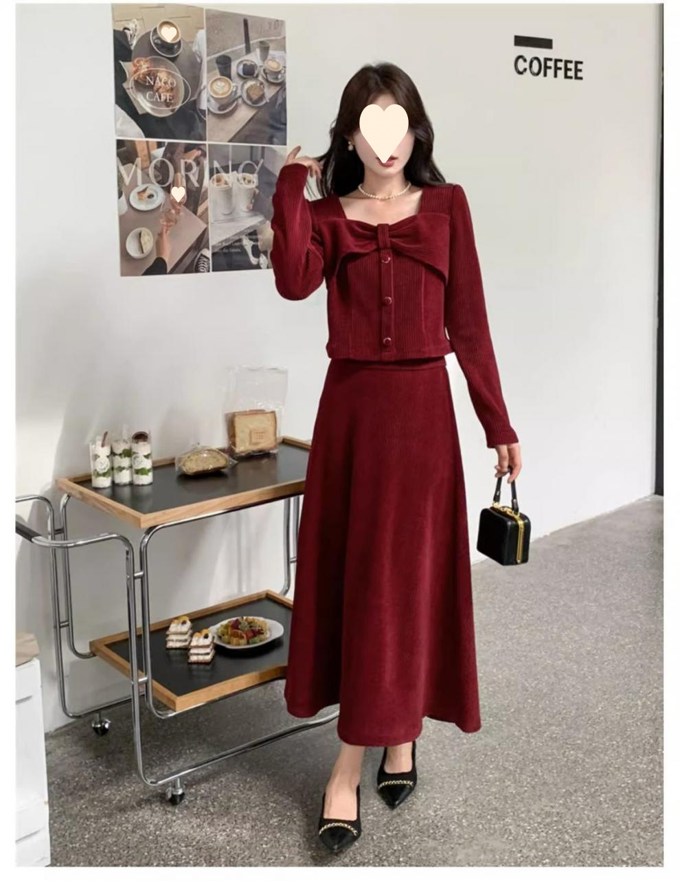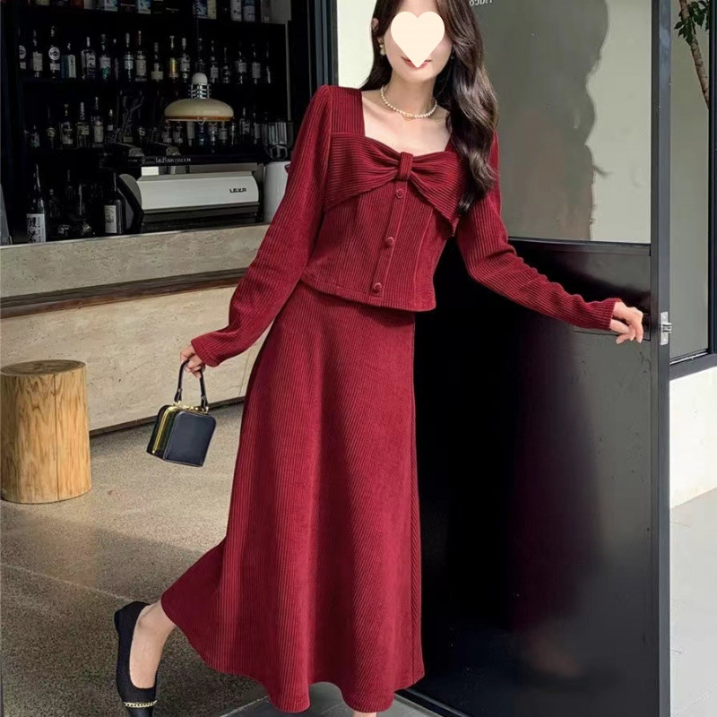작은 샤넬 스타일 원피스 2024 가을과 겨울 새로운 캐주얼 우아한 슬리밍 활 코듀로이 투피스 세트