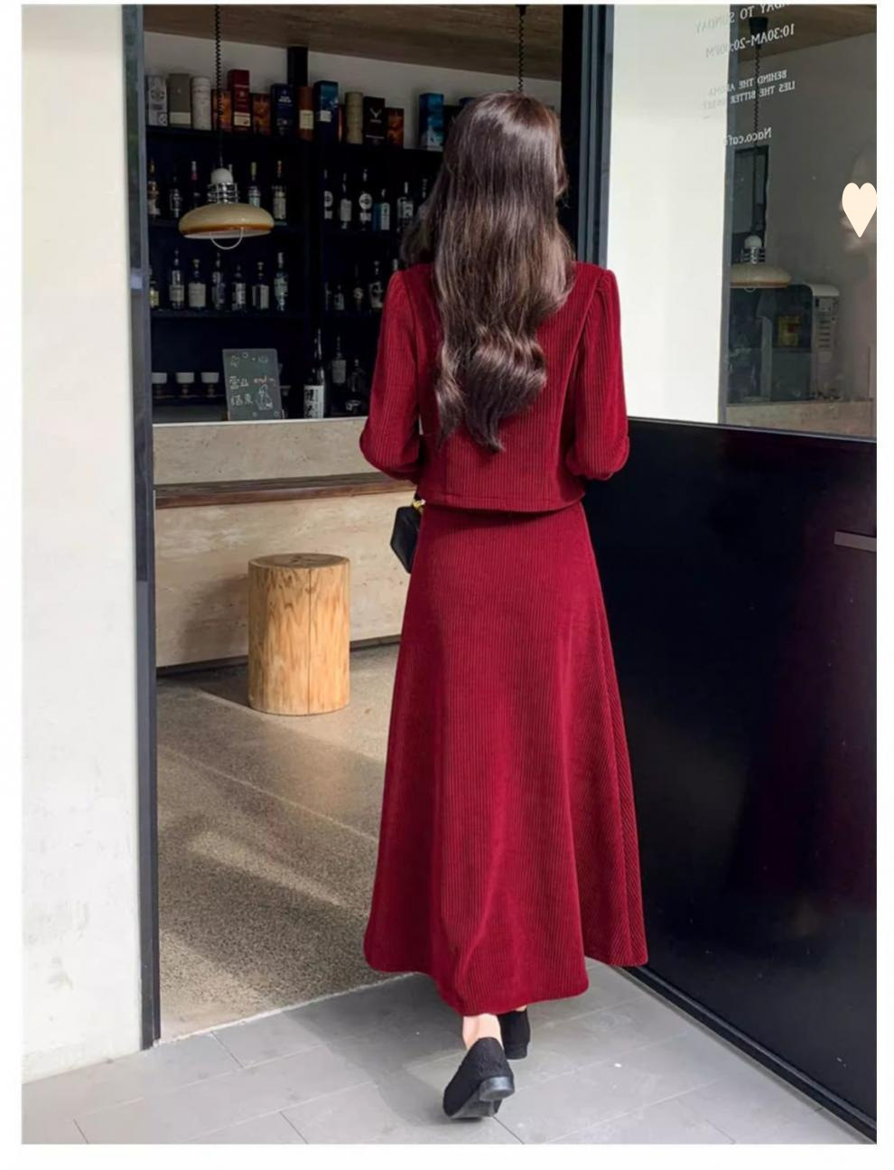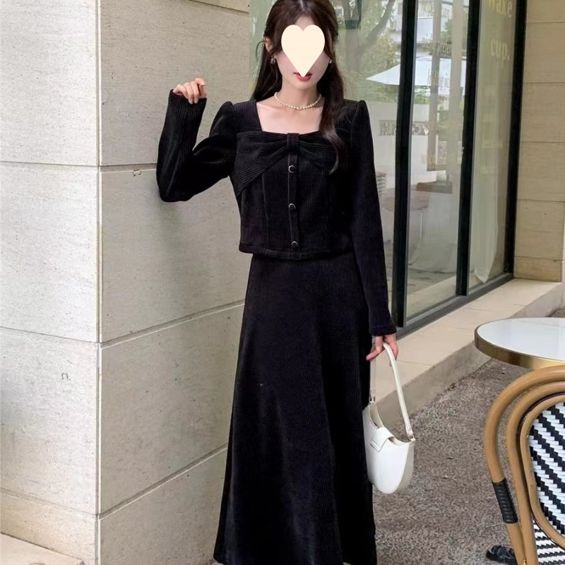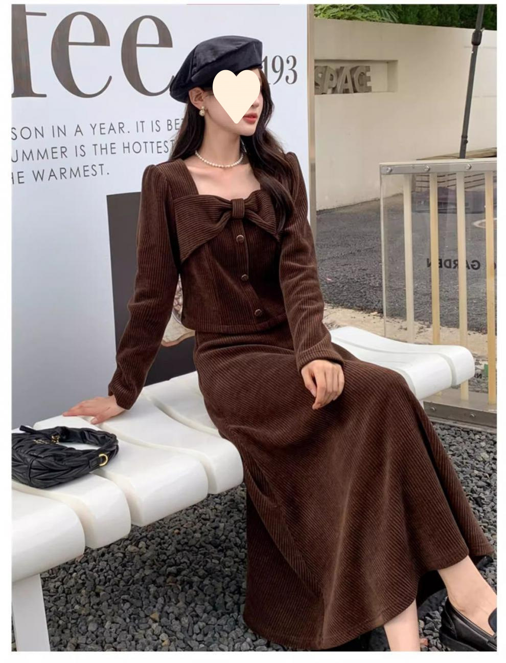 작은 샤넬 스타일 원피스 2024 가을과 겨울 새로운 캐주얼 우아한 슬리밍 활 코듀로이 투피스 세트스토어 가기