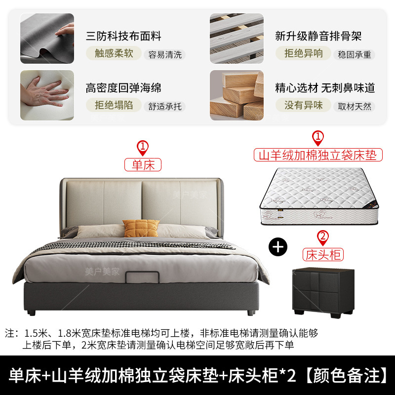 • 테크니컬 패브릭 싱글 침대 + 캐시미어 및 면 독립 백 매트리스 + 캐비닛 2개