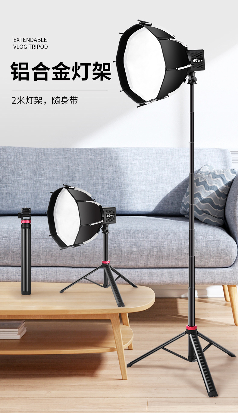 2 m 알루미늄 합금 브래킷 8 휴대 전화 셀카 스틱 40W 휴대용 COB 램프 홀더 텔레스코픽 휴대용 접이식 삼각대