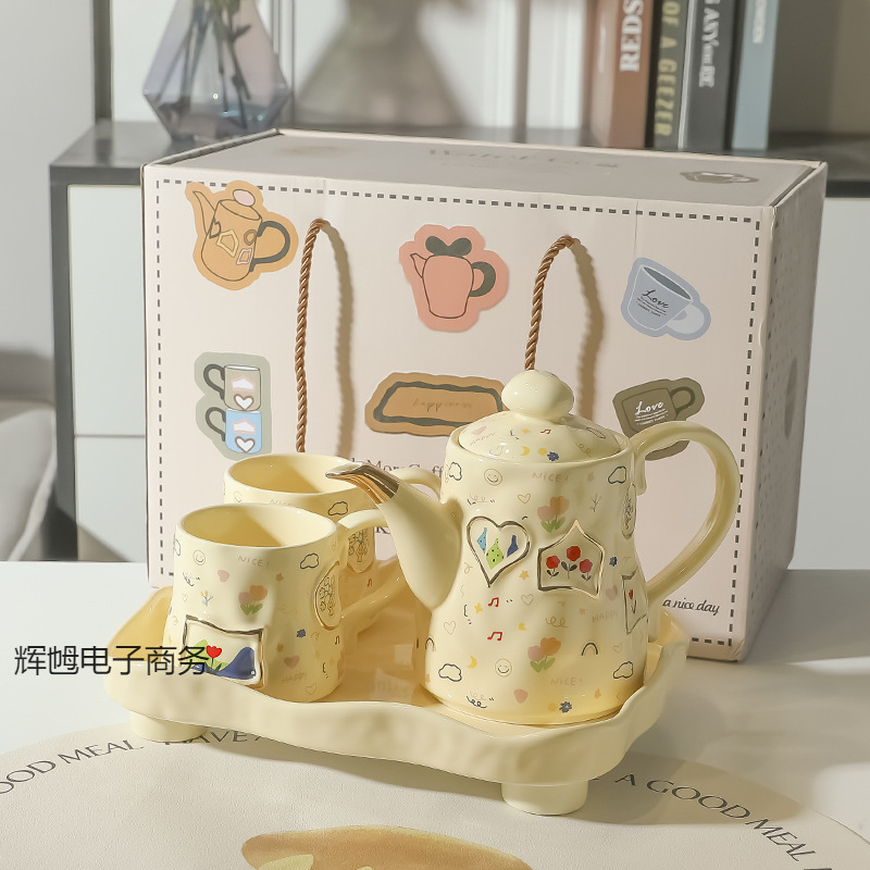 새로운 Ins 라이트 럭셔리 차 세트 세트 Underglyze 컬러 세라믹 워터 컵 티 컵 주전자 조합 사탕 스타일 차 세트 거실