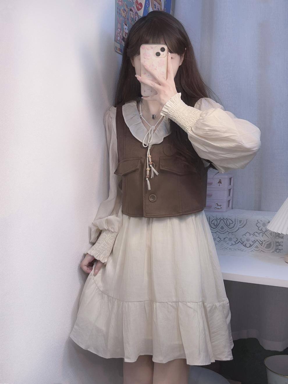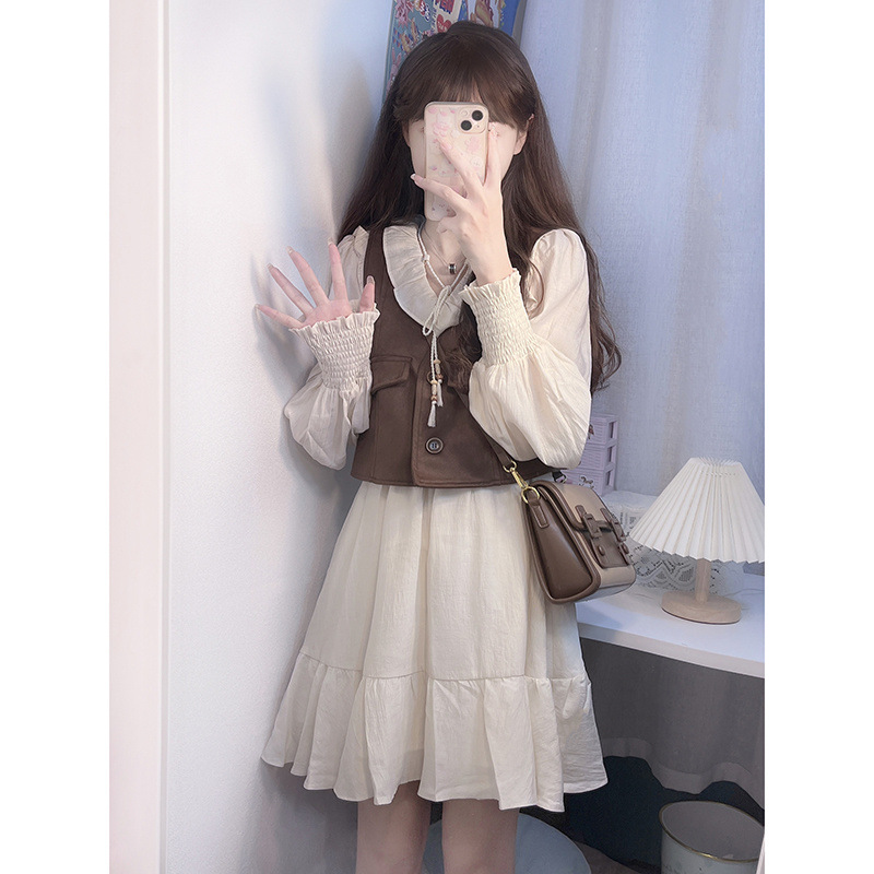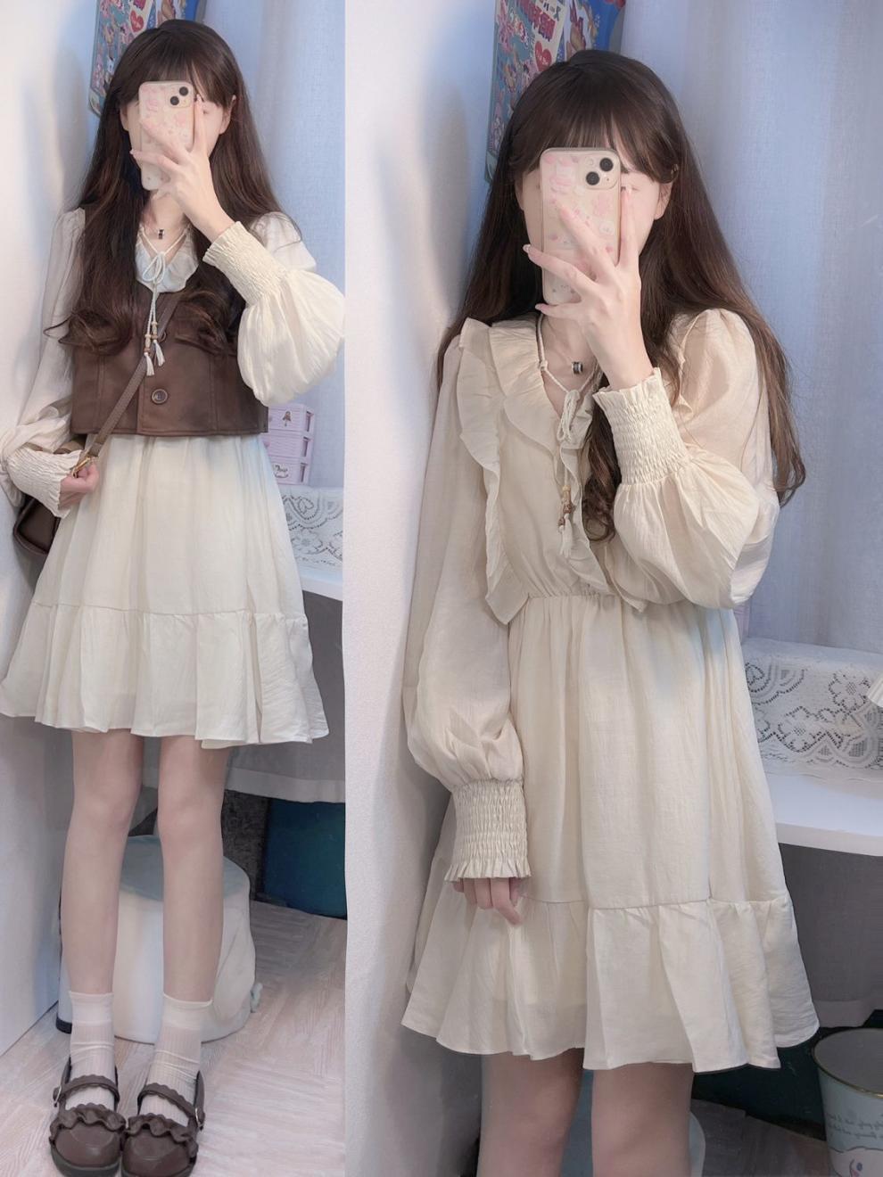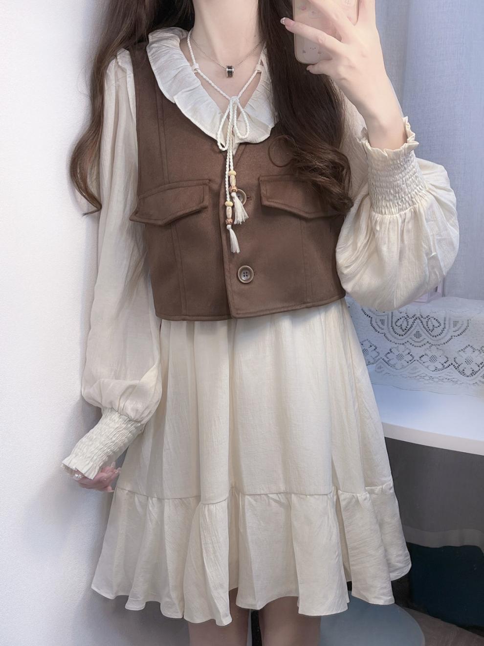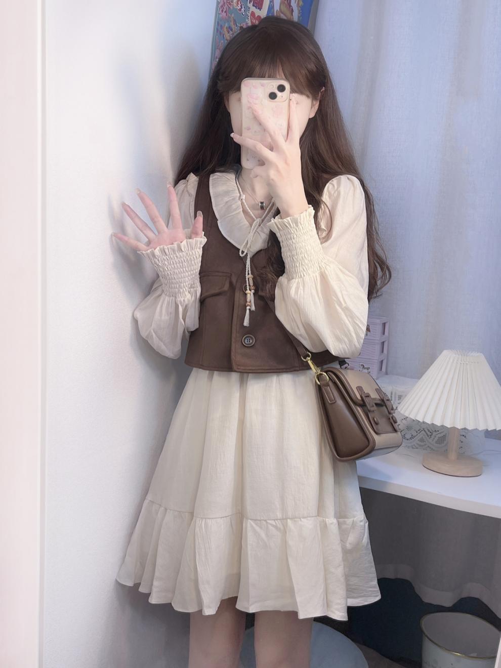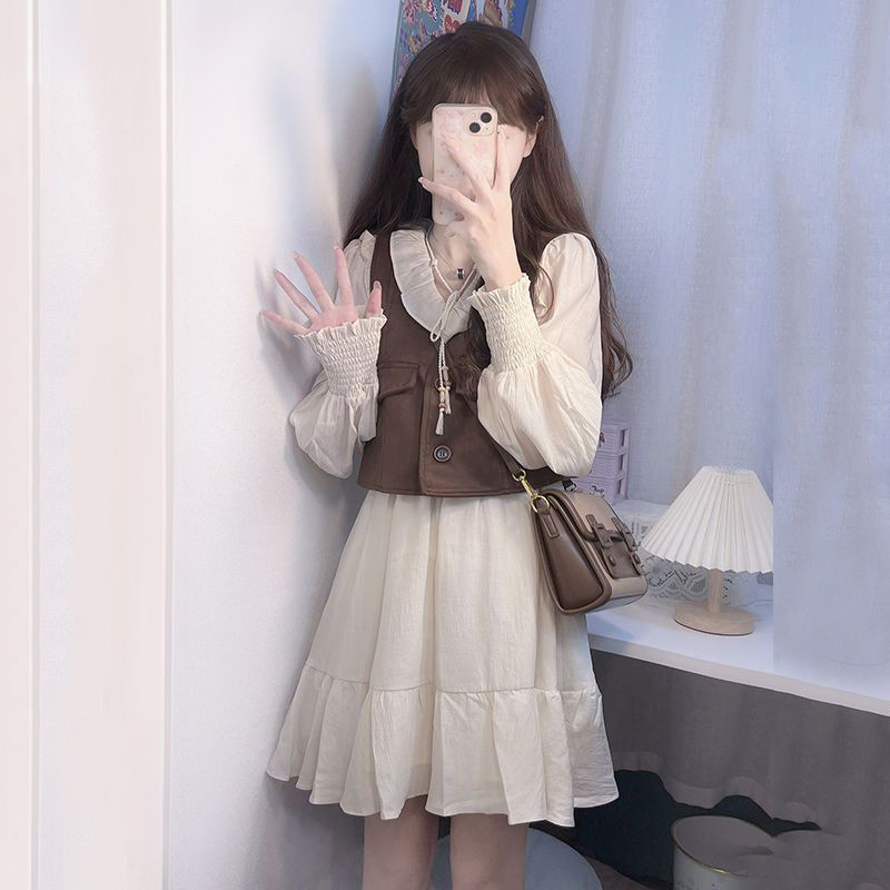 두 조각 세트 일본식 달콤한 귀 가장자리 기질 타이트 허리 슬리밍 원피스 여학생스토어 가기