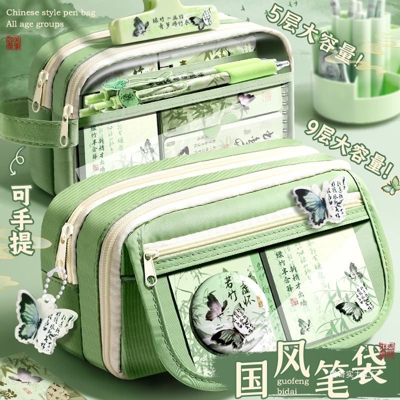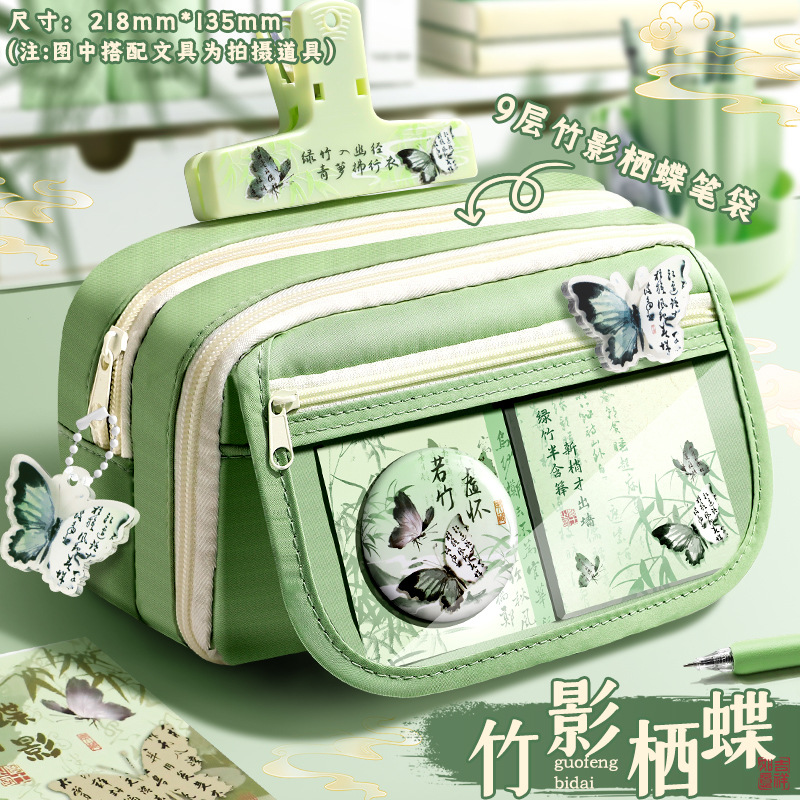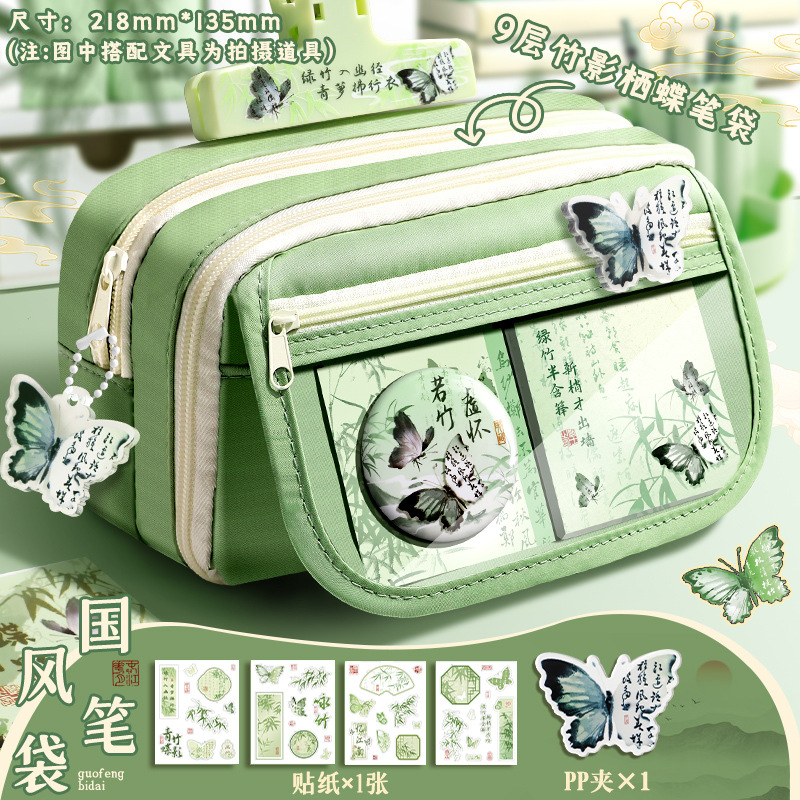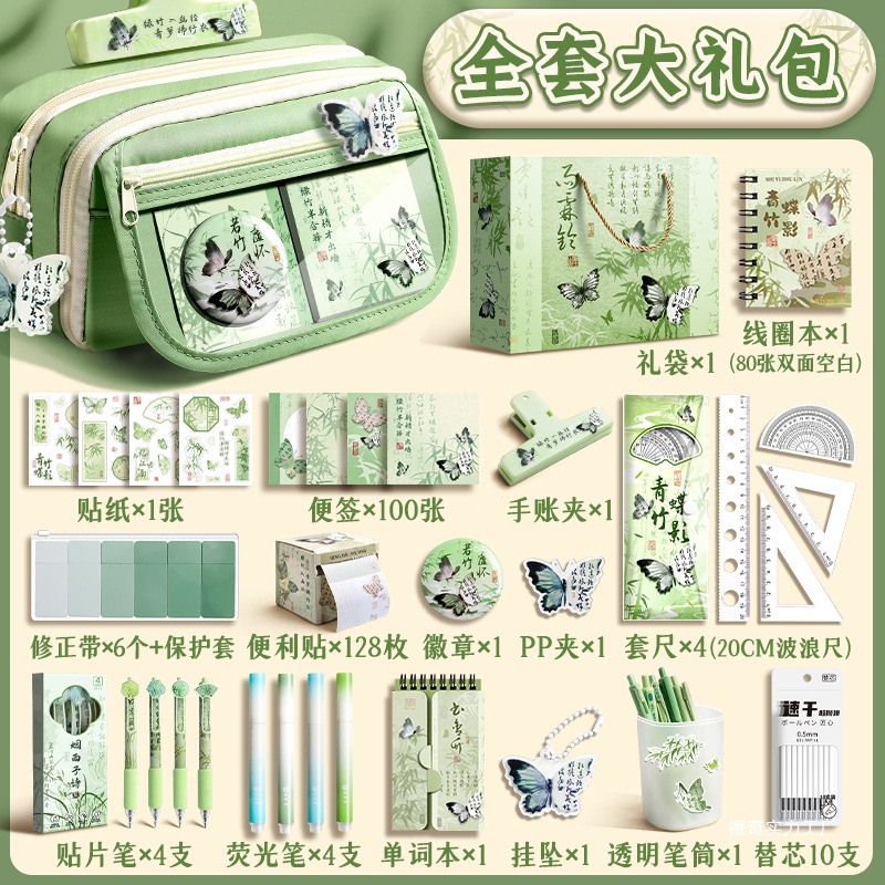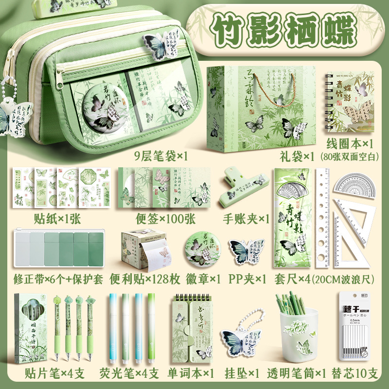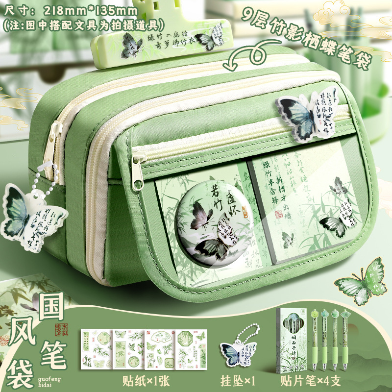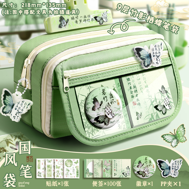 • 【대나무 그림자에 서 있는 나비|고급모델] 필통 + 스티커 + 메모장 + 펜던트 + 코일북 + 뱃지 + PP클립 + 중국식 펜 + 자 세트 + 수정테이프 + 형광펜 + 롤
