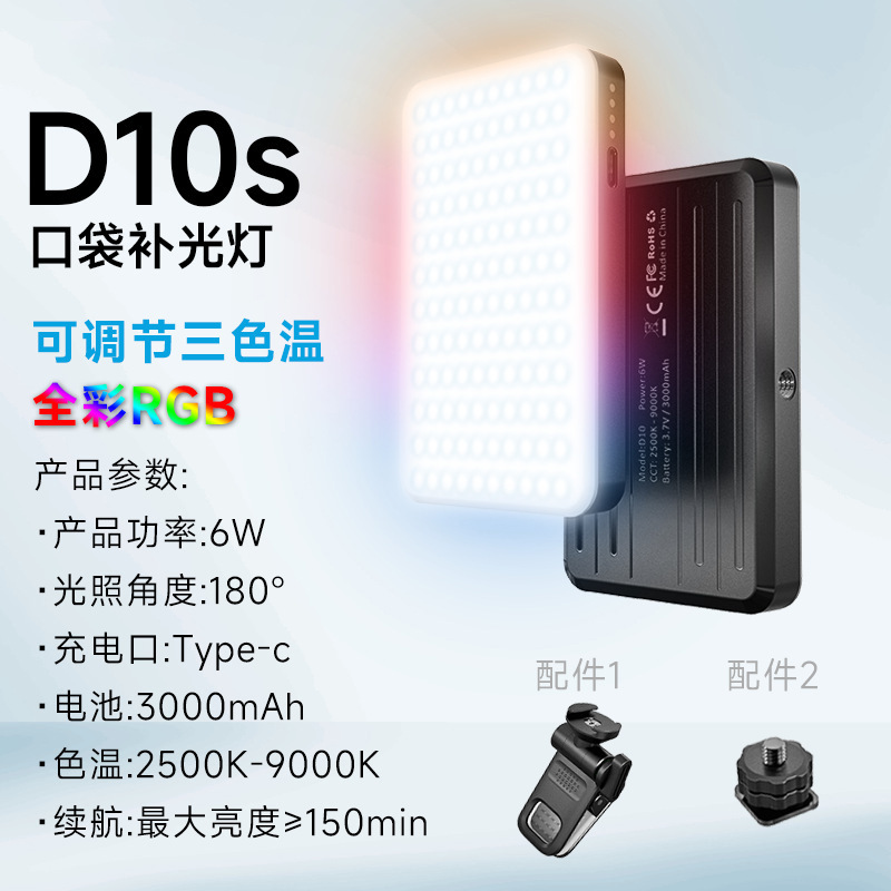 • [D10s-블랙-직사각형 조명] 풀컬러 RGB + 휴대폰 클립 + 무단계 손잡이