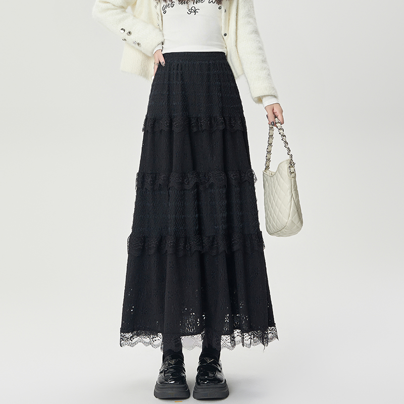 아이보리 레이스 케이크 스커트 여성의 봄과 가을 A 라인 스커트 높은 허리 슬리밍 용량 캐주얼 우산 스커트 롱 스커트