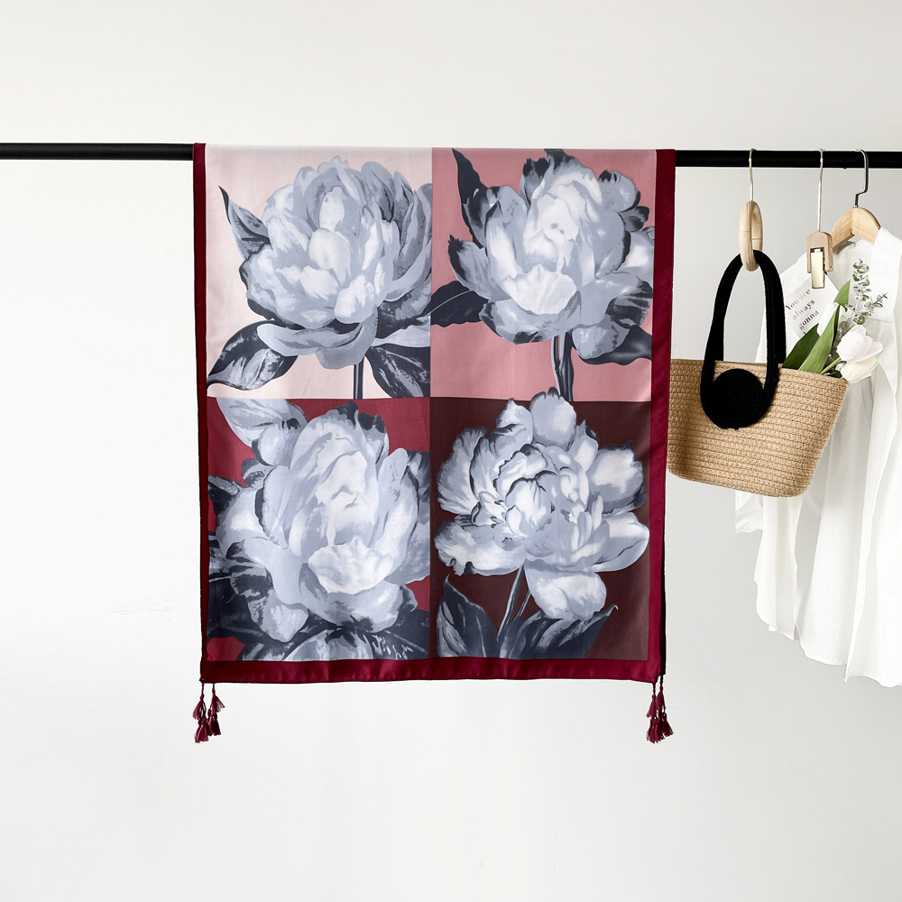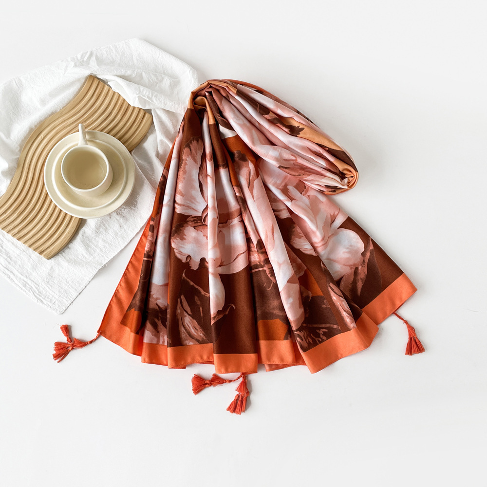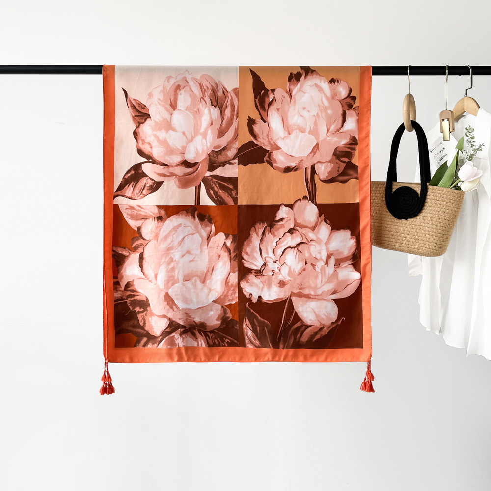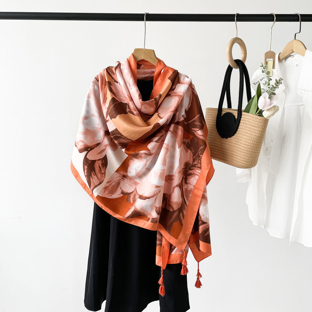 대외 무역 봄과 가을 선 스크린 민족 스타일 목도리 여성 고급 실크 스카프 인쇄 모조 면 및 리넨 오렌지 4 그리드 꽃 스카프