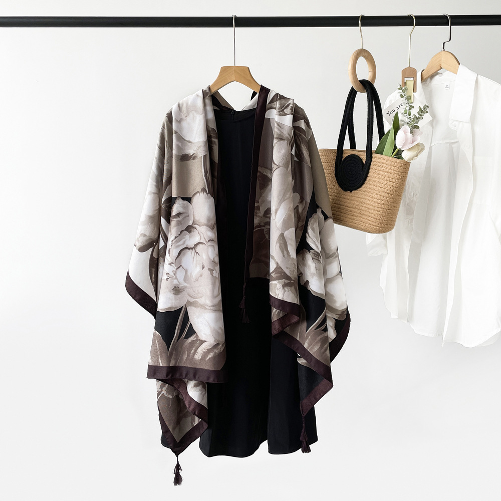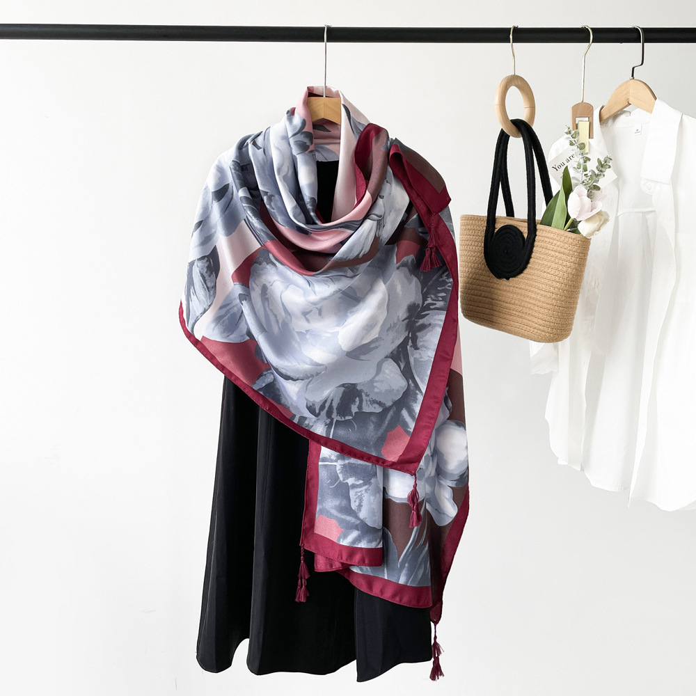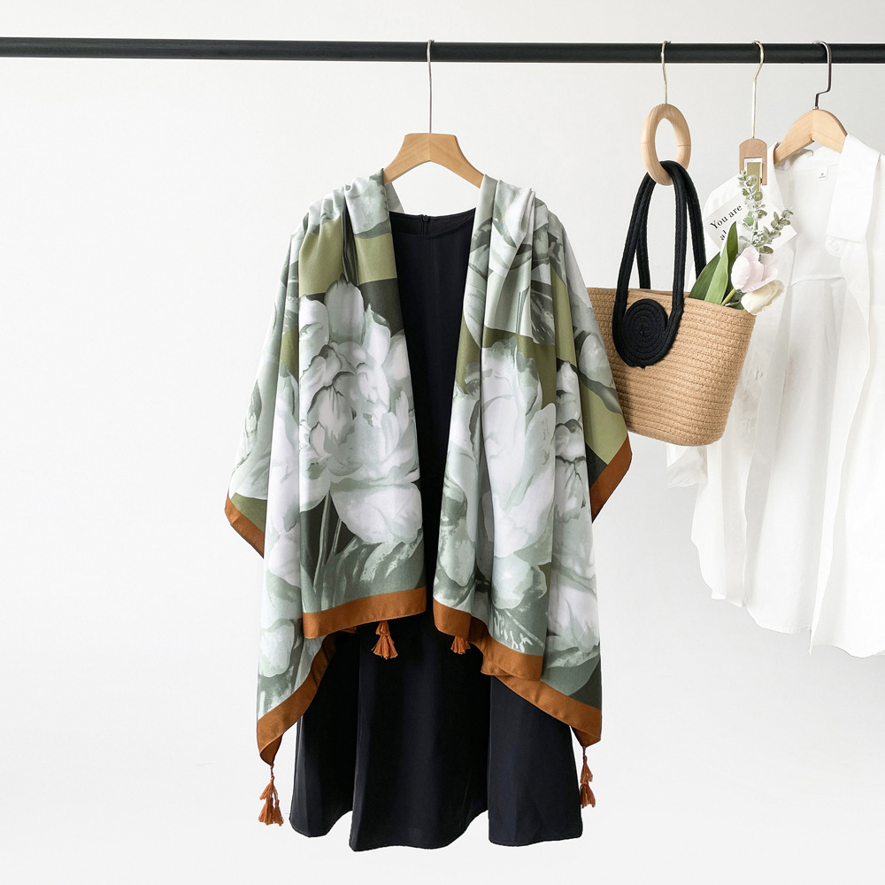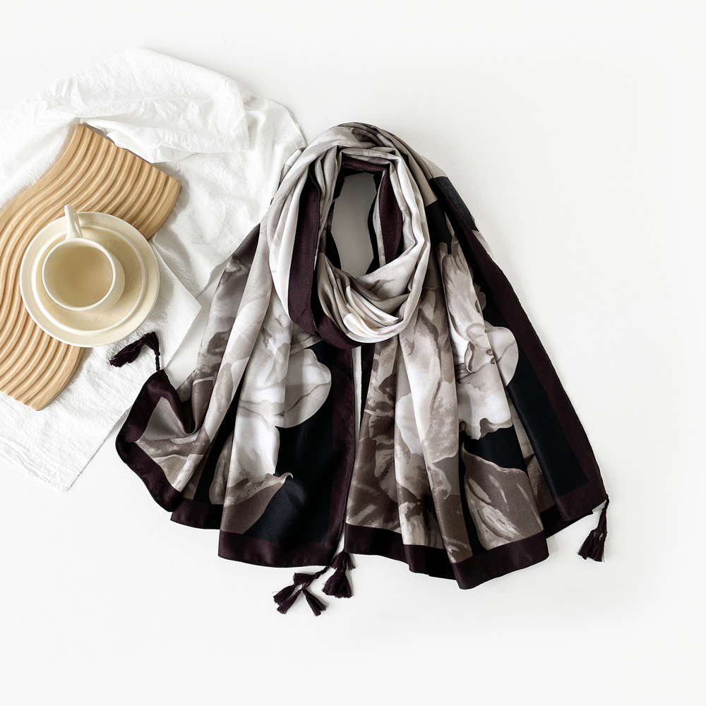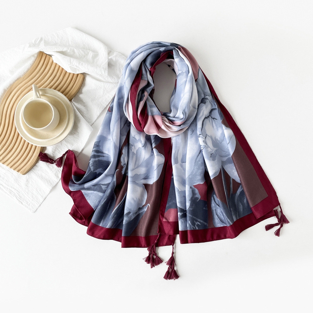 대외 무역 봄과 가을 선 스크린 민족 스타일 목도리 여성 고급 실크 스카프 인쇄 모조 면 및 리넨 오렌지 4 그리드 꽃 스카프