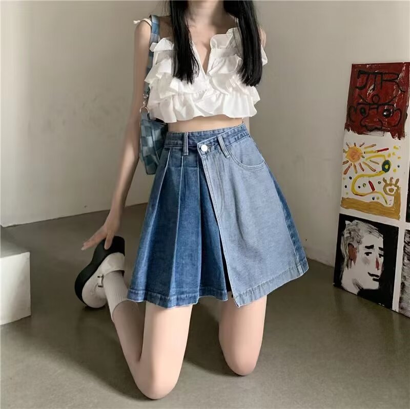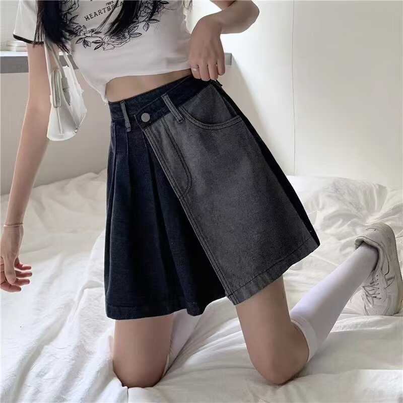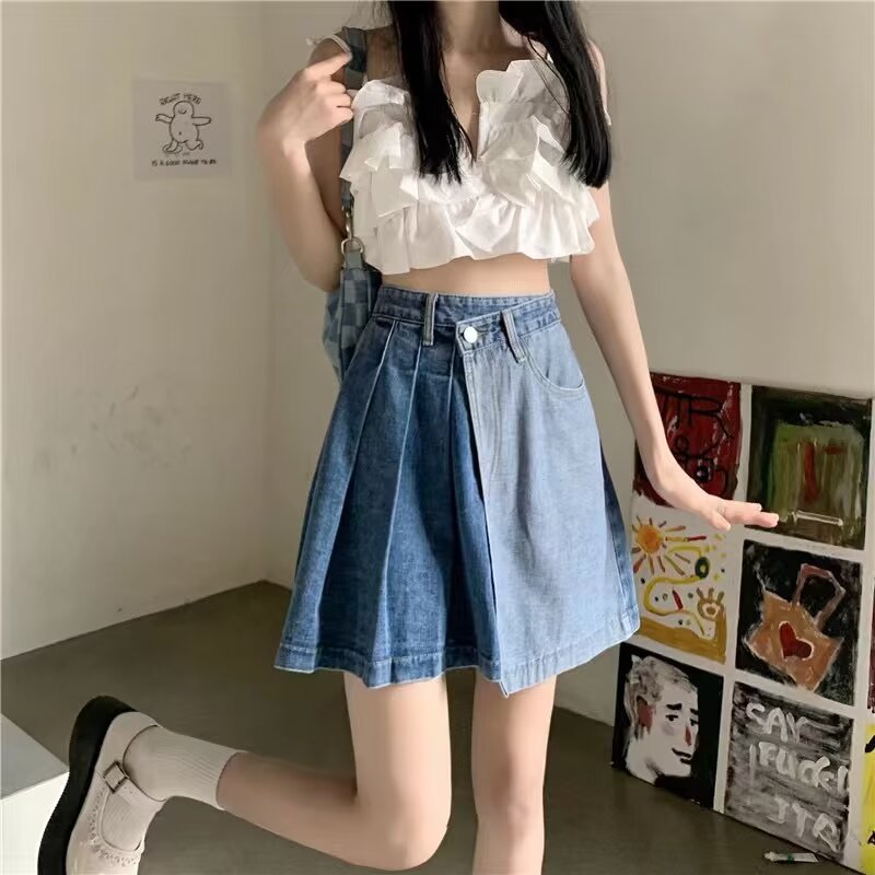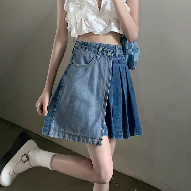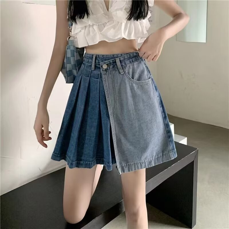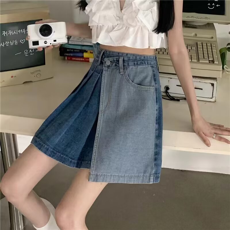 데님 짧은 치마 여성의 봄과 여름 한국 스타일의 새로운 통통녀 슬림 핏 느슨한 허리 느슨한 색상 매칭 주름 짧은 치마
