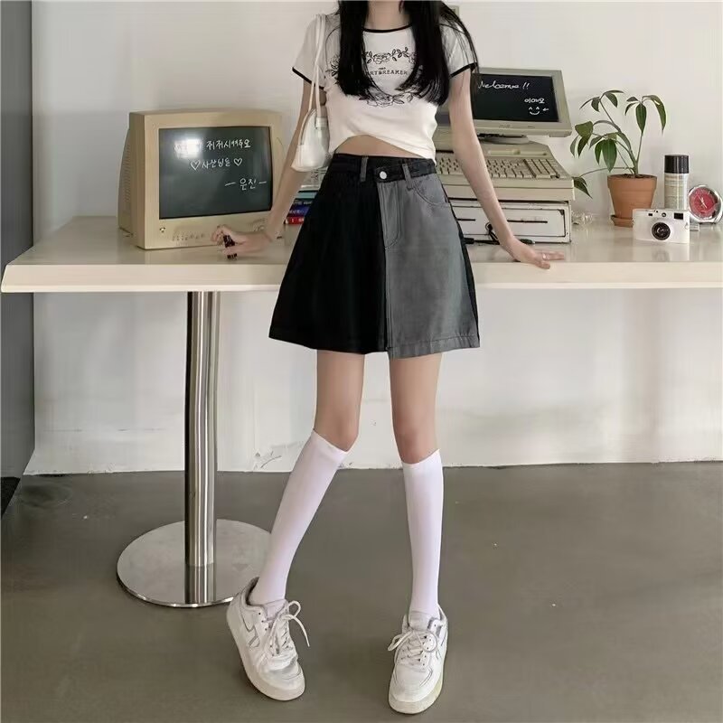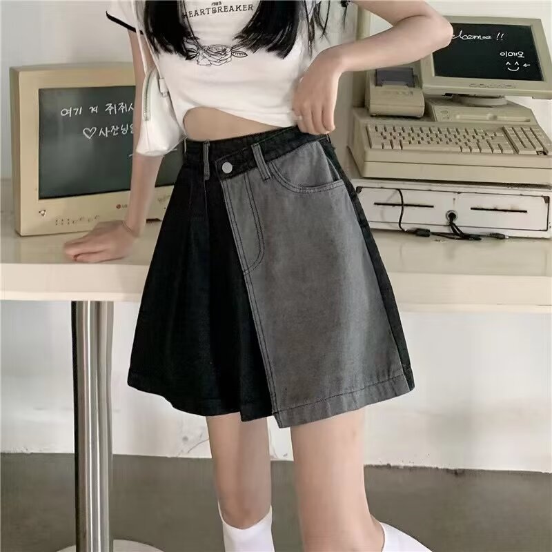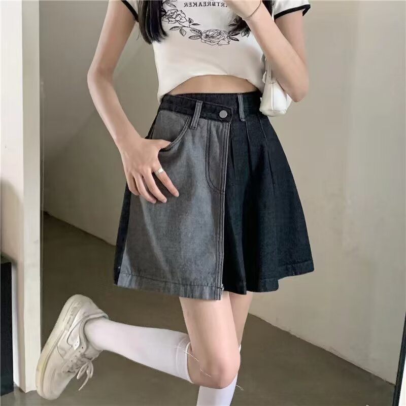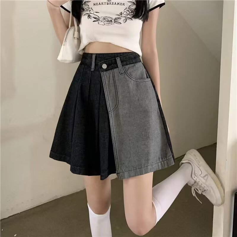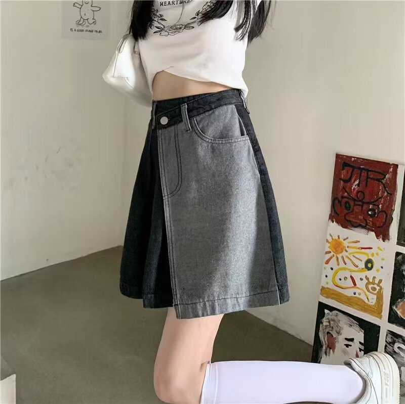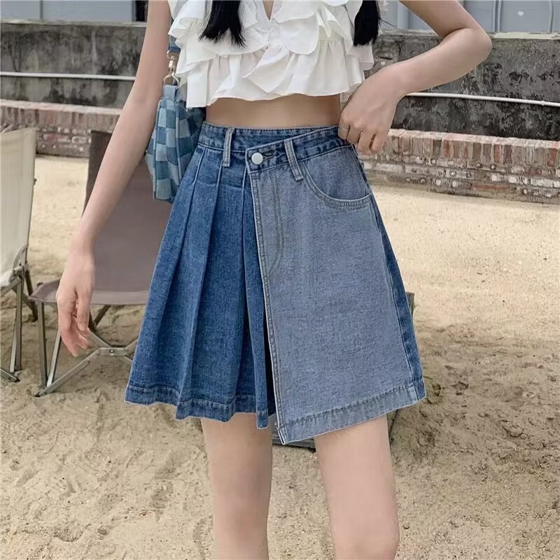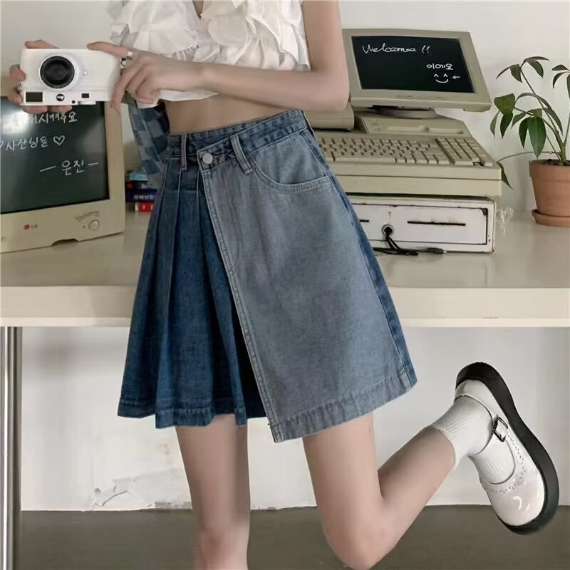 데님 짧은 치마 여성의 봄과 여름 한국 스타일의 새로운 통통녀 슬림 핏 느슨한 허리 느슨한 색상 매칭 주름 짧은 치마
