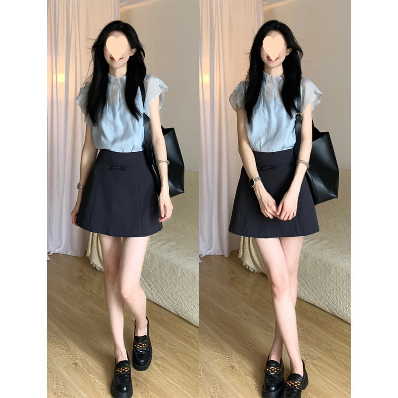 우아한 하이 엔드 클리어 자연 반팔 탑 그레이 간단한 오버 스커트 투피스 세트 여성 여름 새로운 2025스토어 가기