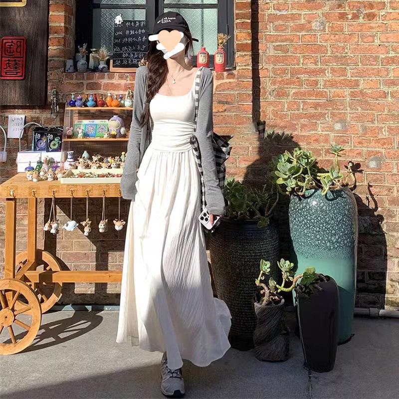헵번 스타일 화이트 우아한 3 피스 세트 게으른 스타일 슬림 슬리밍 카디건 슬링 높은 허리 스커트 캐주얼 세트스토어 가기