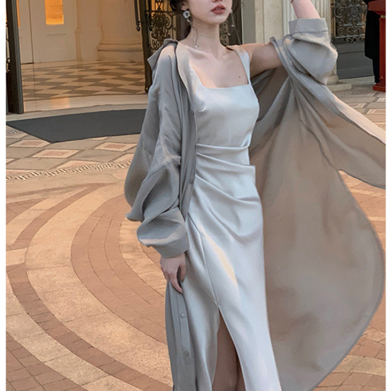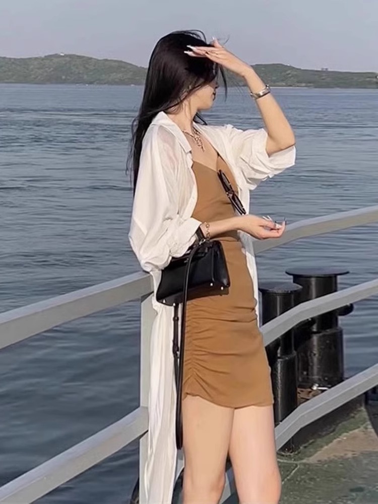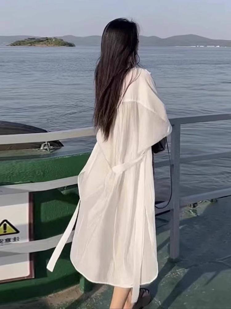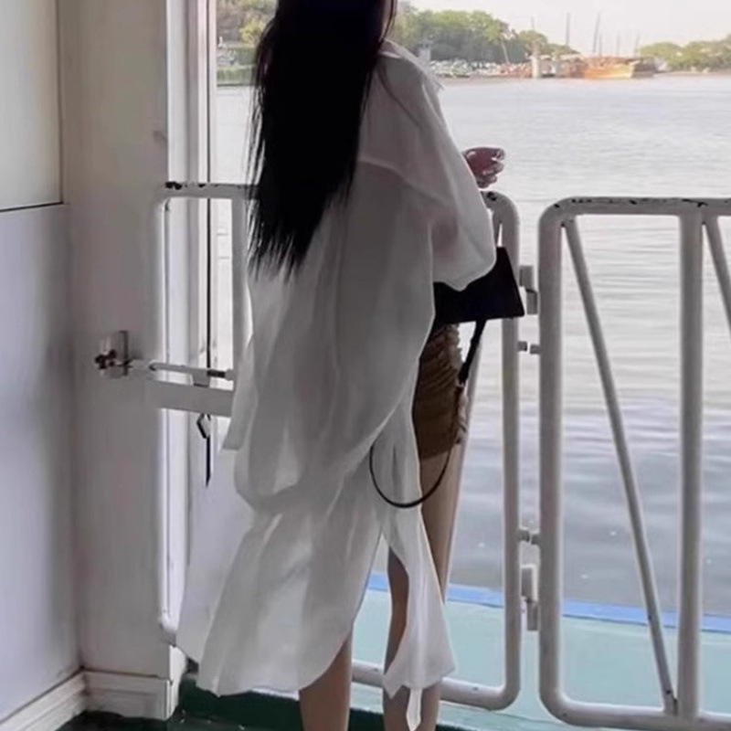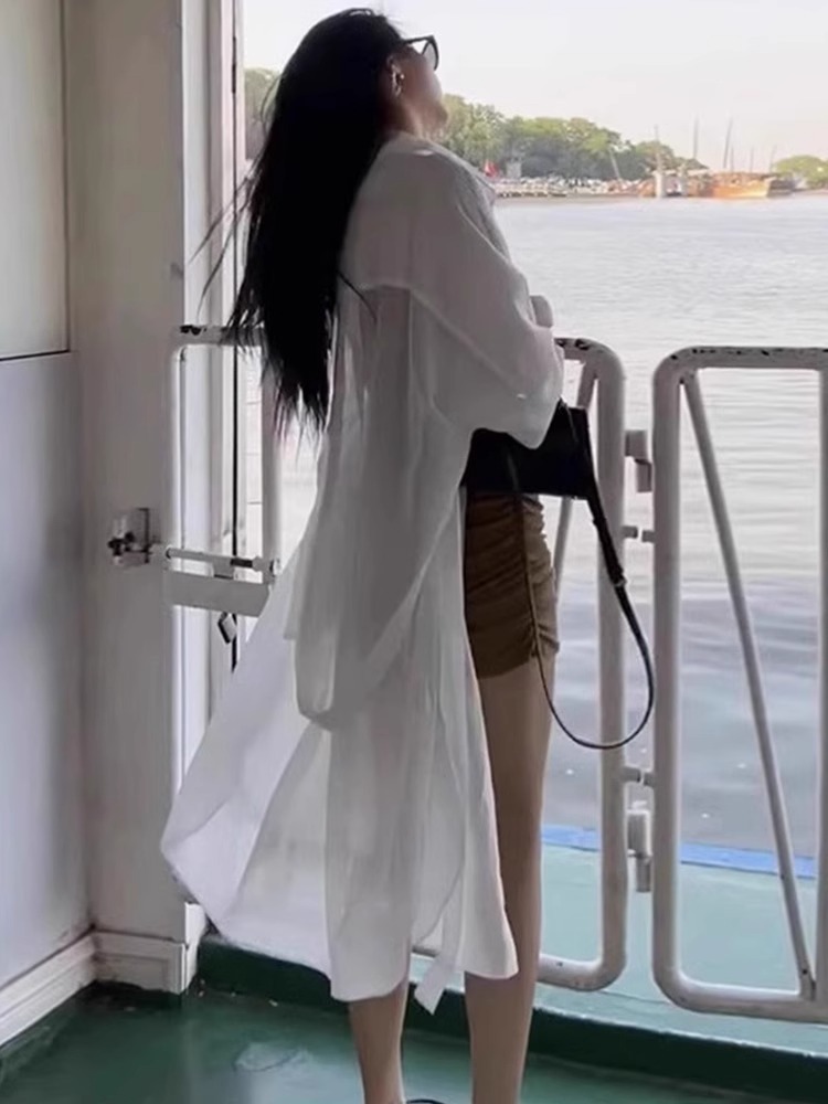 화이트 쉬폰 선스크린 셔츠 여성용 여름 슬링 스커트 외부 카디건 탑 중간 길이의 아이스 실크 얇은 재킷