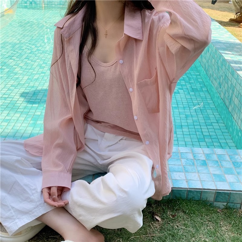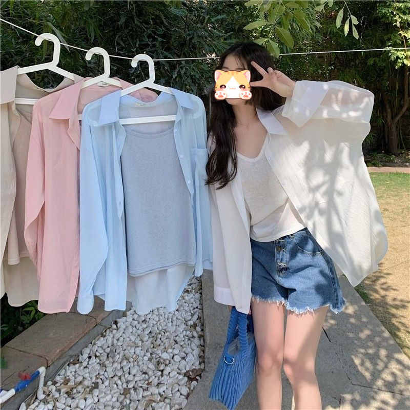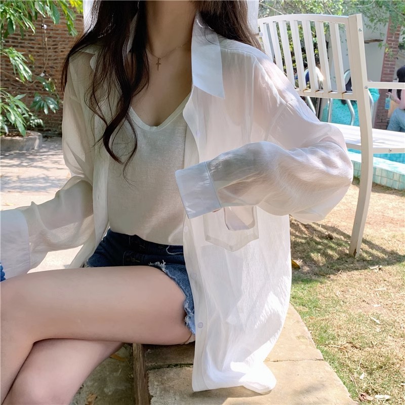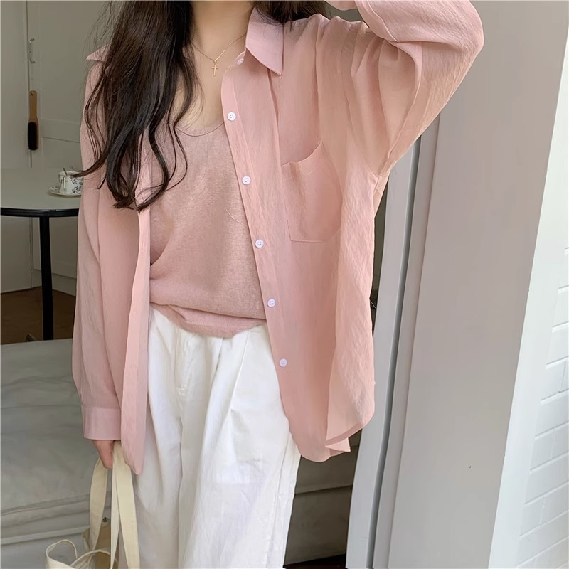 단색 육체 선 스크린 셔츠 여성용 여름 얇은 카디건 디자인 센스 틈새 데프 블라우스 셔츠 코트 탑스토어 가기