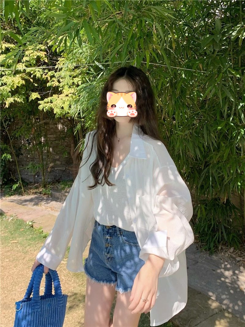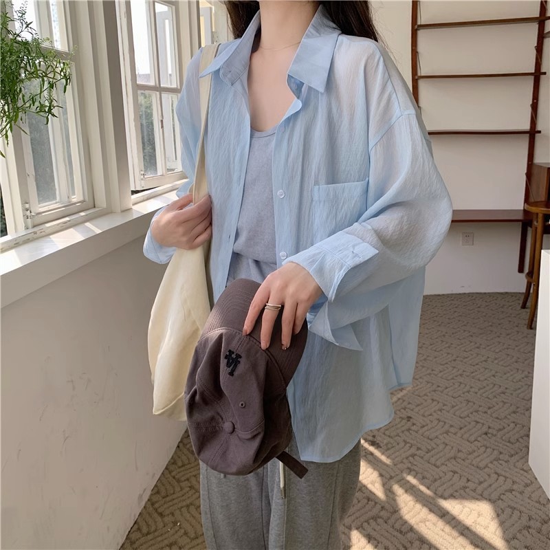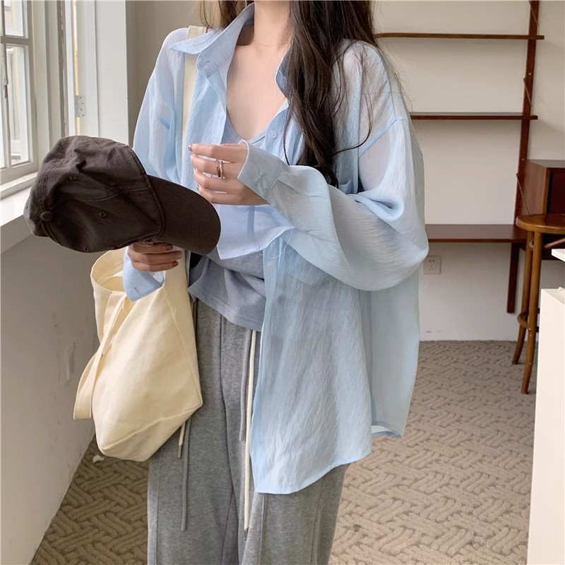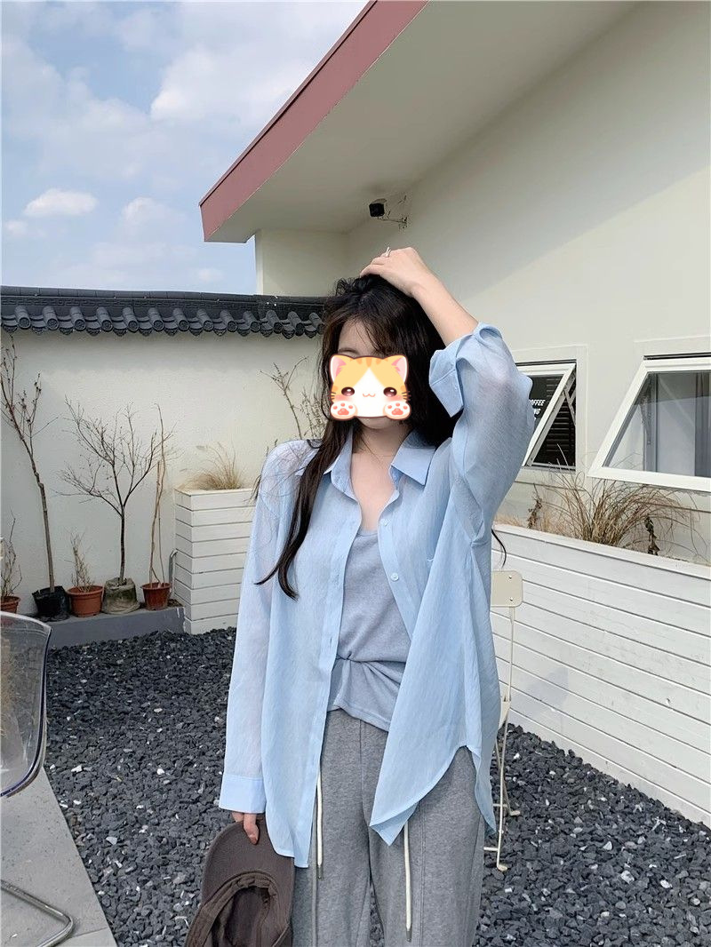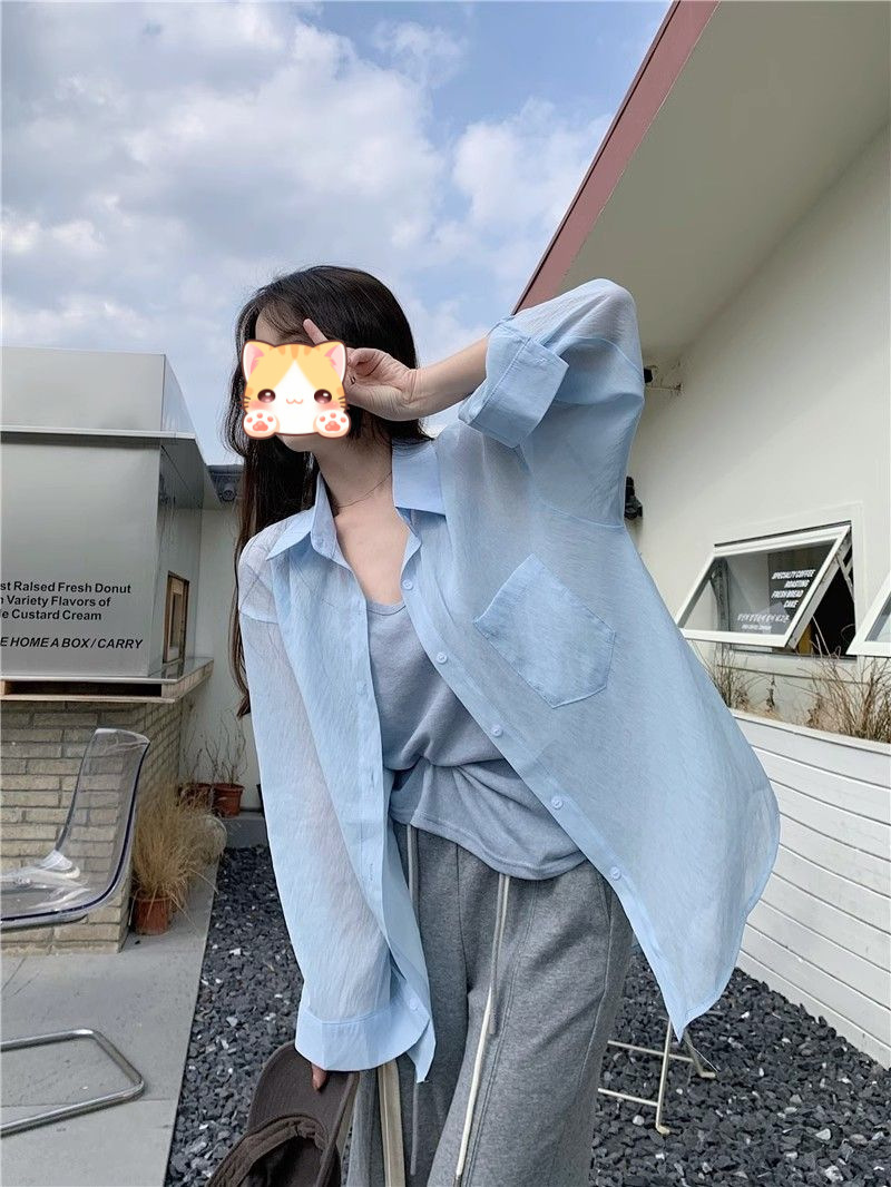 단색 육체 선 스크린 셔츠 여성용 여름 얇은 카디건 디자인 센스 틈새 데프 블라우스 셔츠 코트 탑