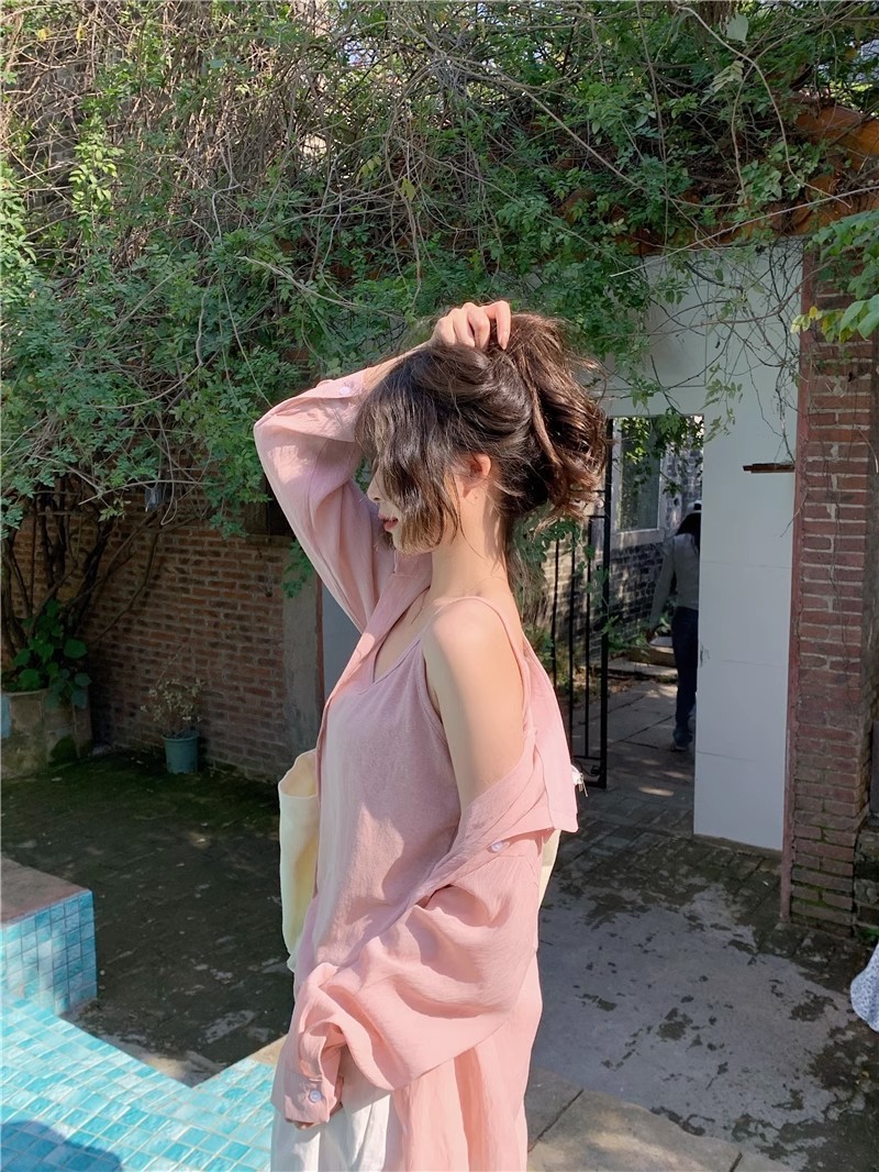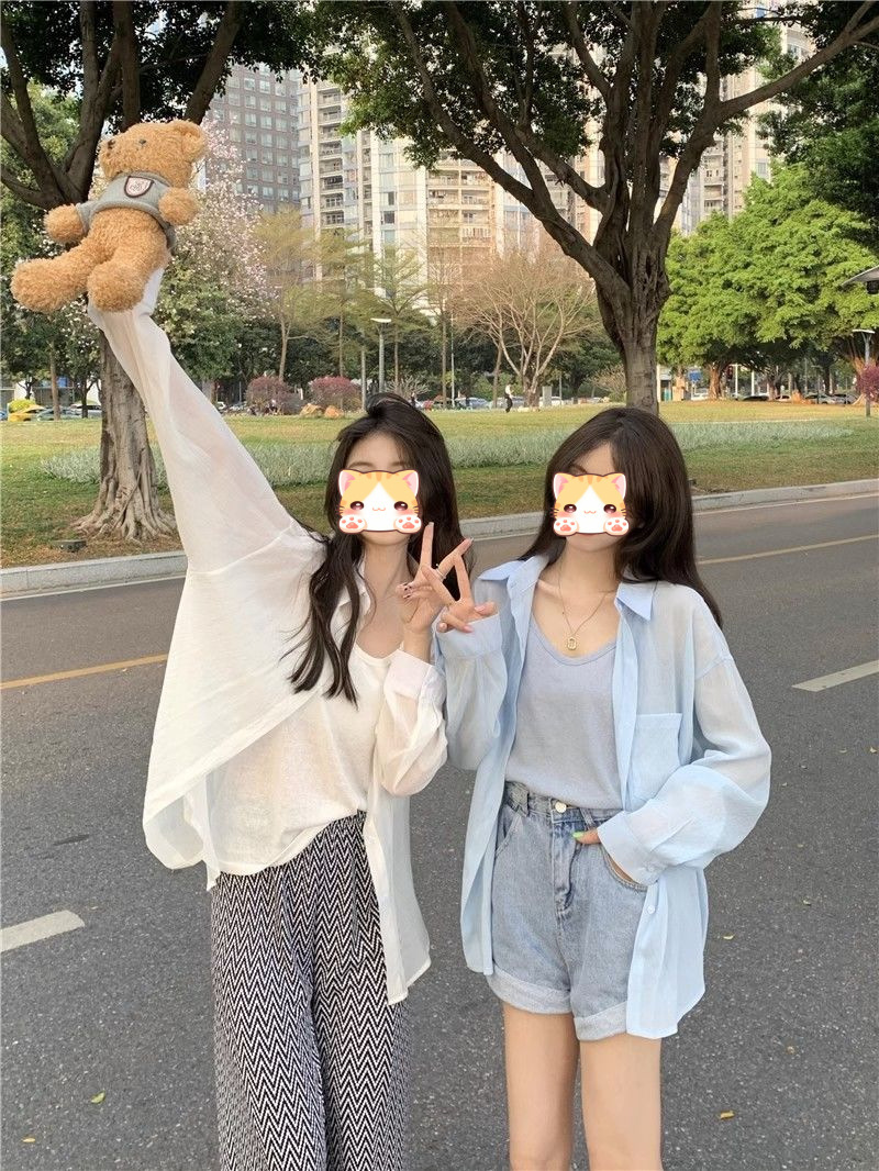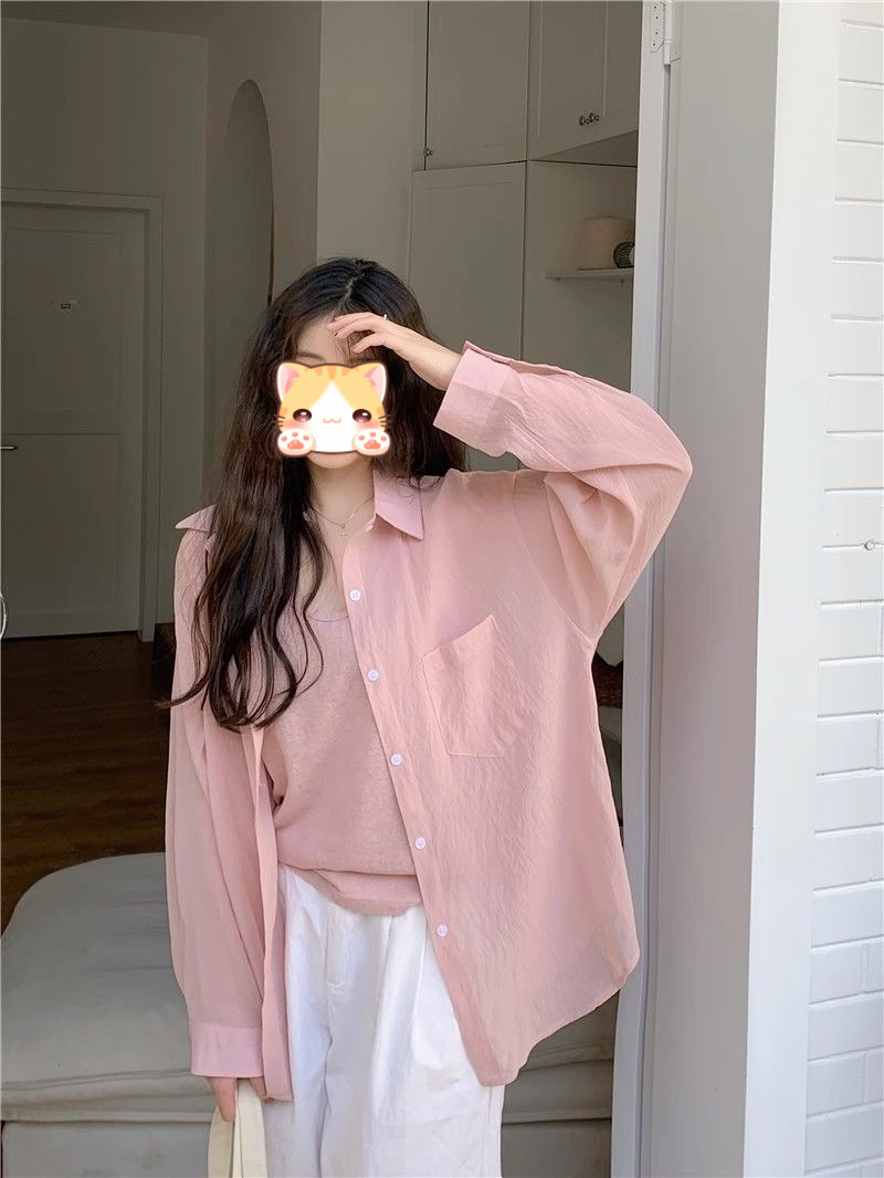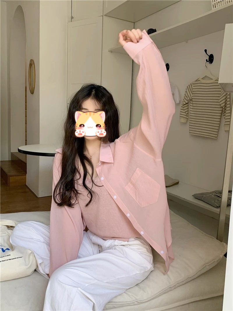 단색 육체 선 스크린 셔츠 여성용 여름 얇은 카디건 디자인 센스 틈새 데프 블라우스 셔츠 코트 탑